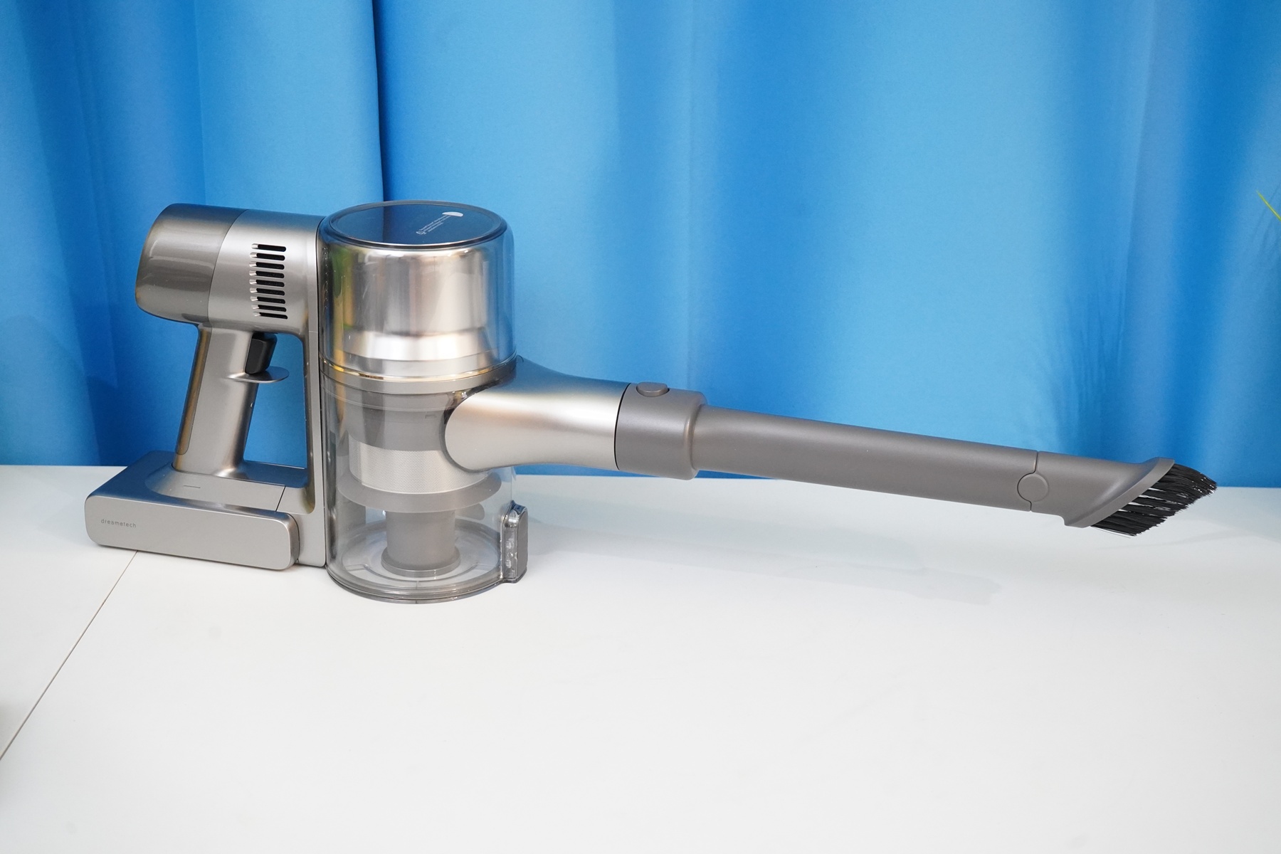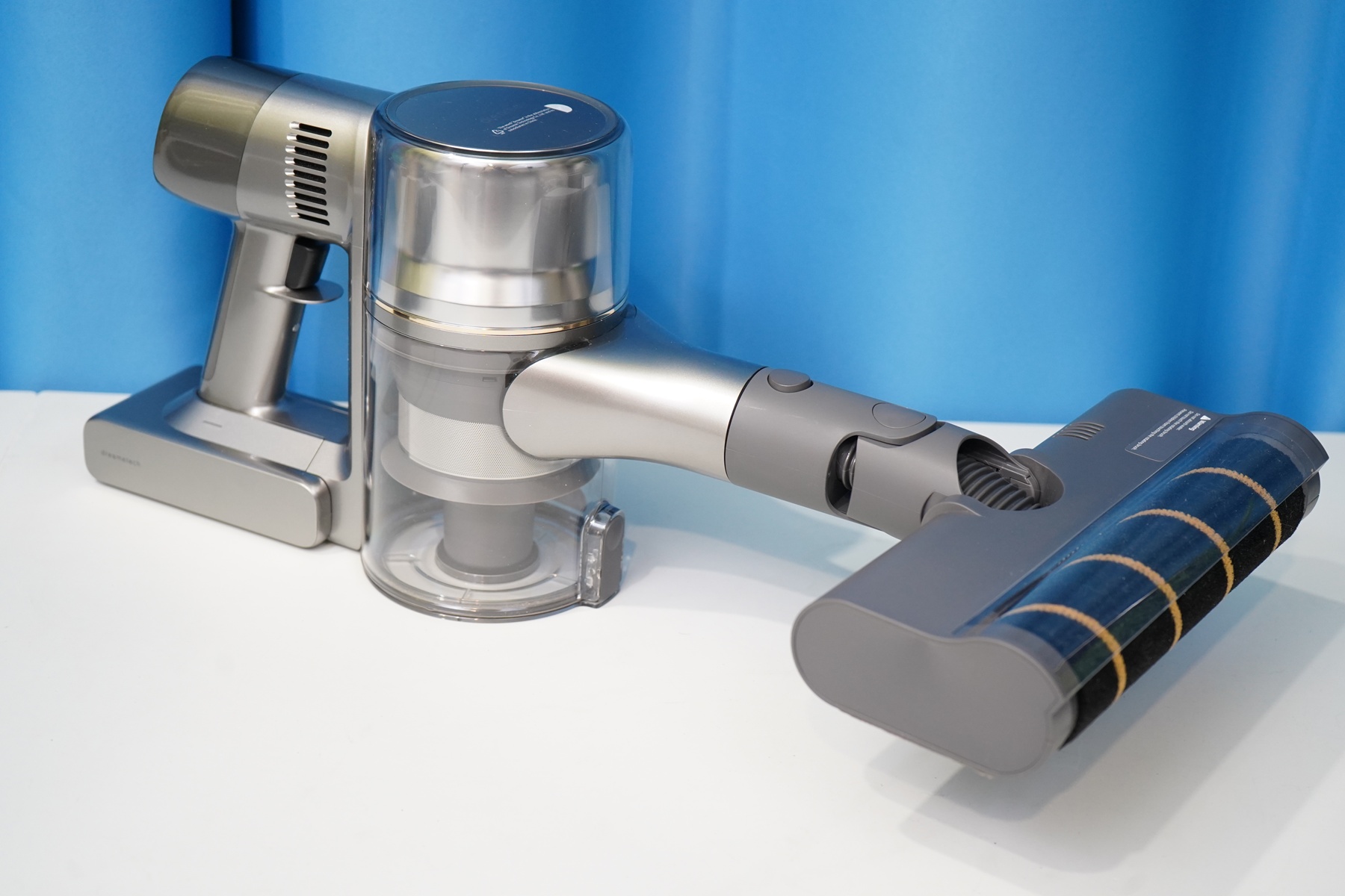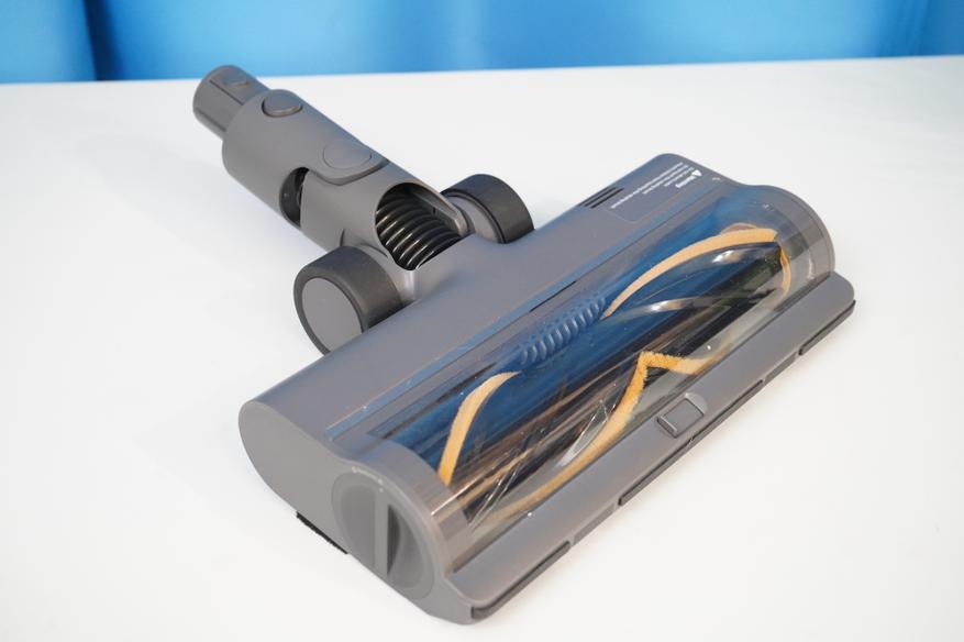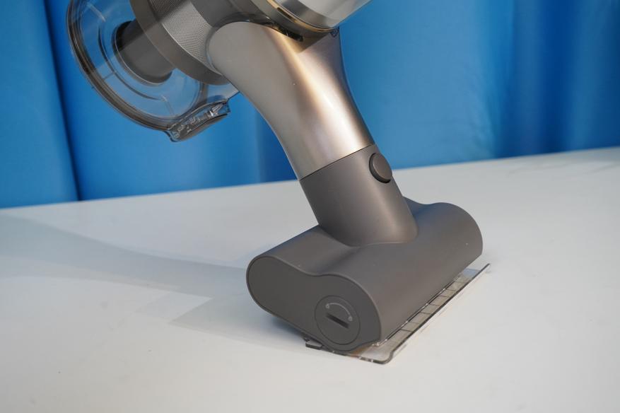 Особенностью пылесоса Dreame можно назвать систему питания из двух проводов, которая дает возможность приводить ролик насадок в движение. Электрические контакты имеются и на корпусе пылесоса, и на самих насадках, и на удлинительной трубке.