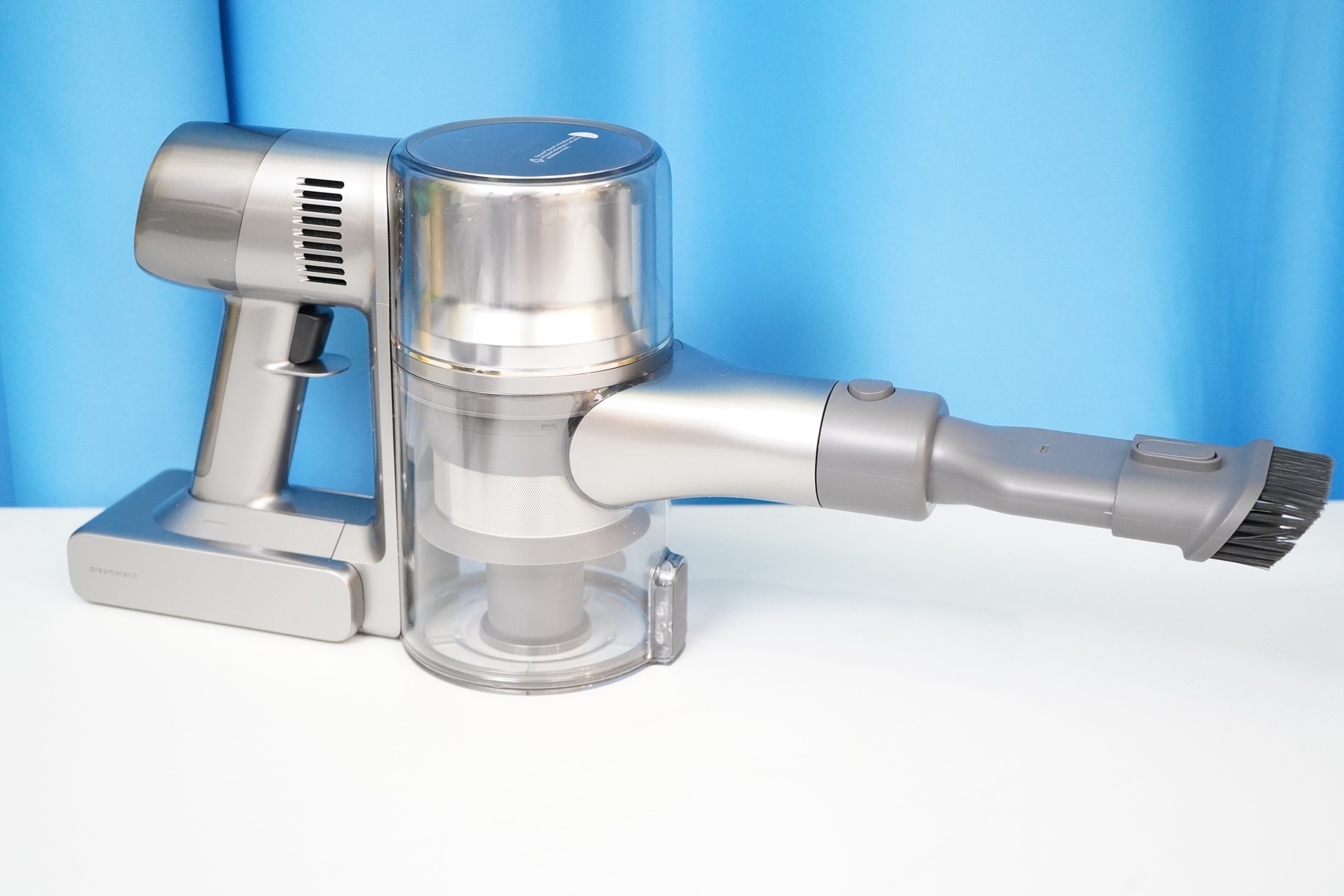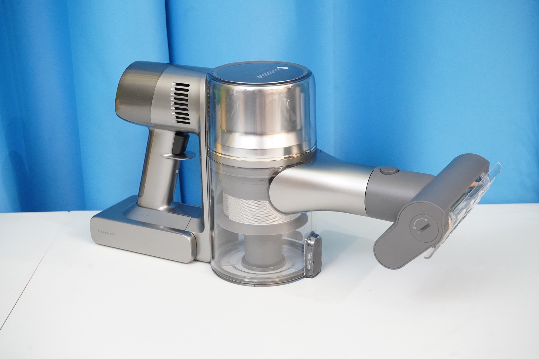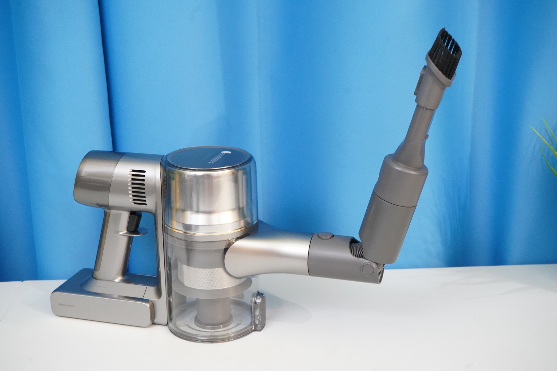 Особенностью пылесоса Dreame можно назвать систему питания из двух проводов, которая дает возможность приводить ролик насадок в движение. Электрические контакты имеются и на корпусе пылесоса, и на самих насадках, и на удлинительной трубке.