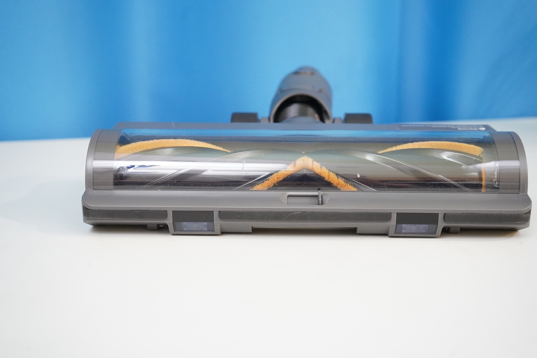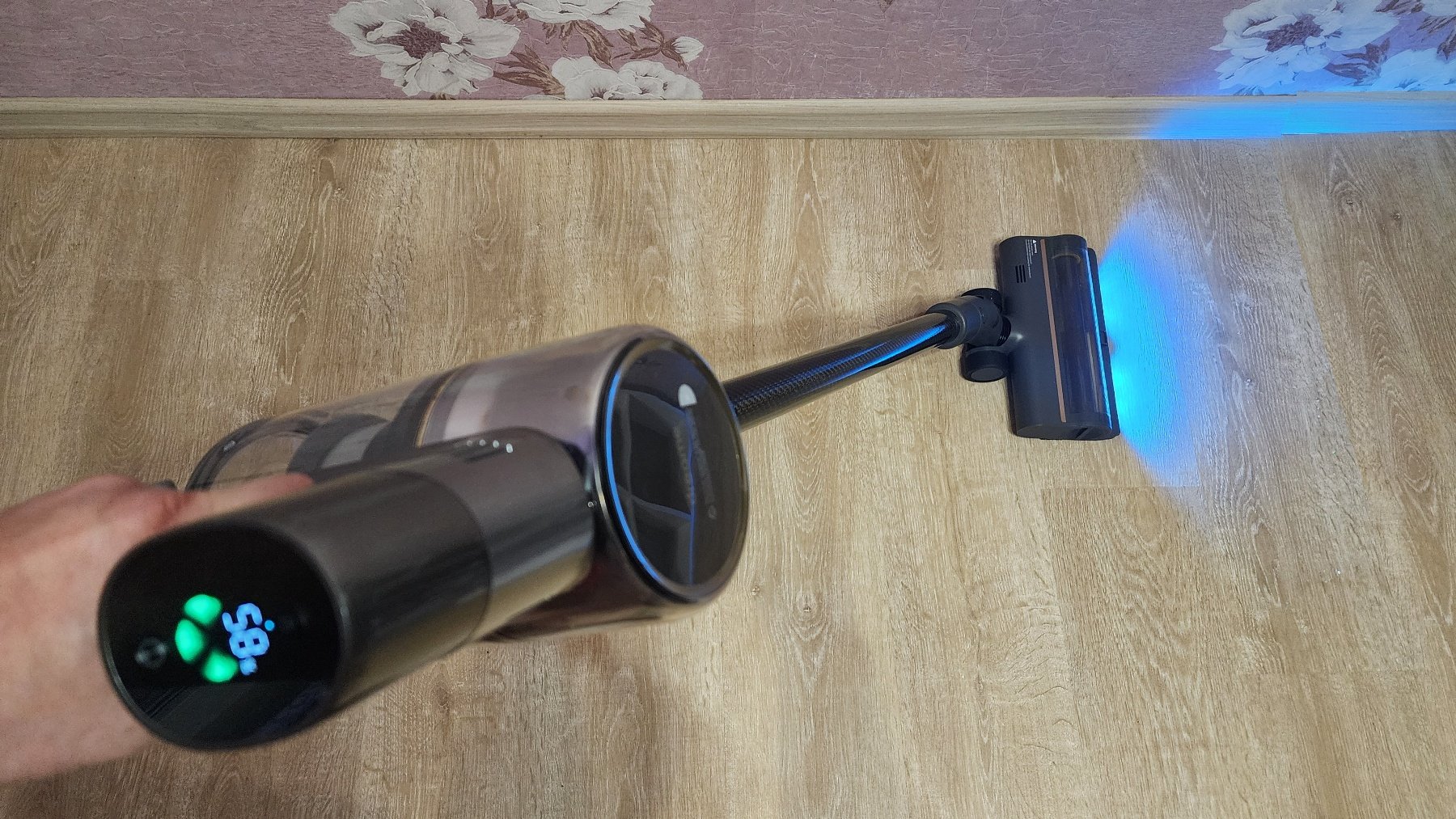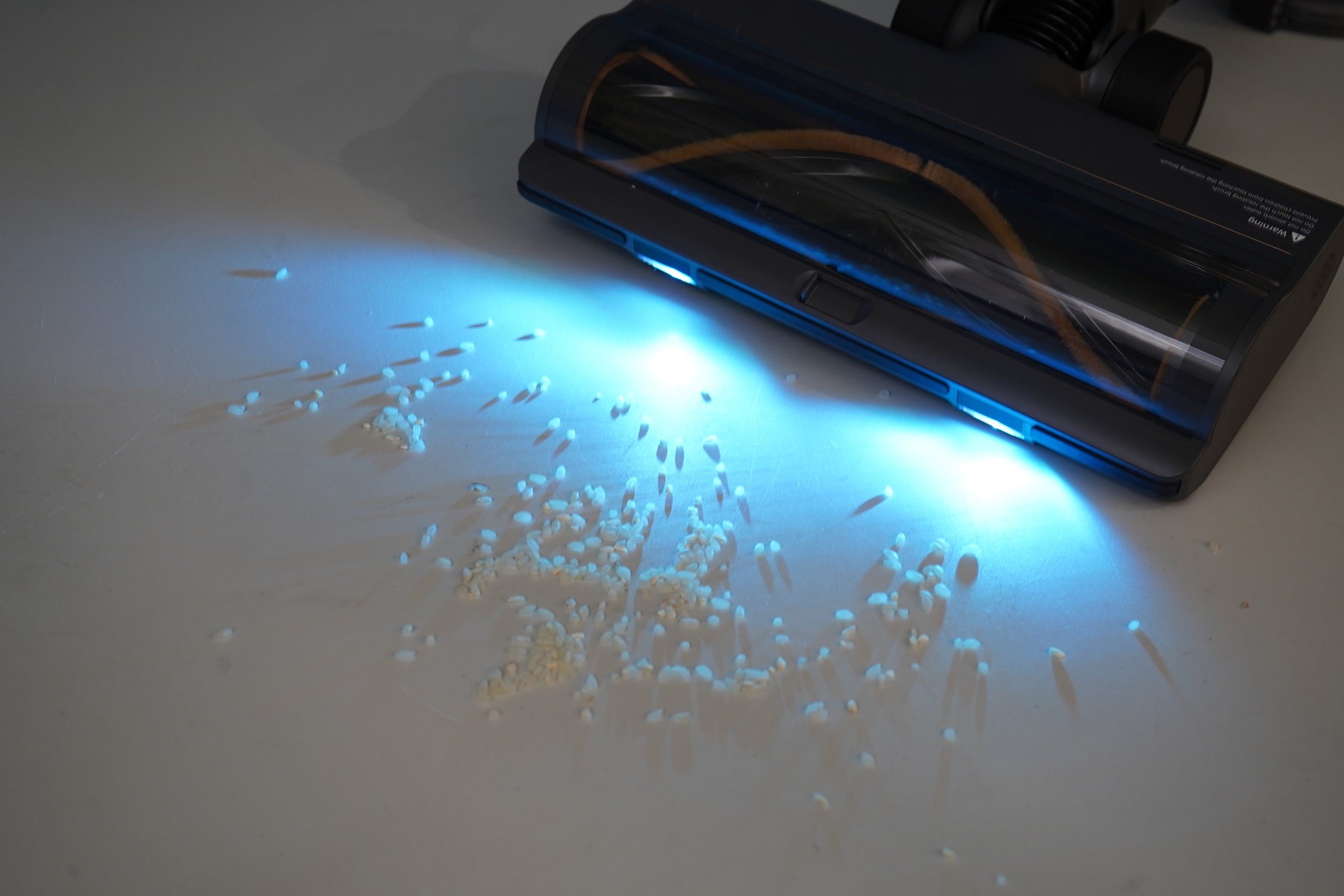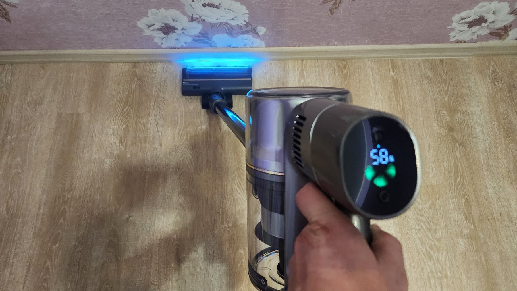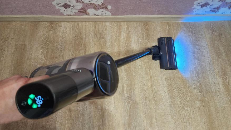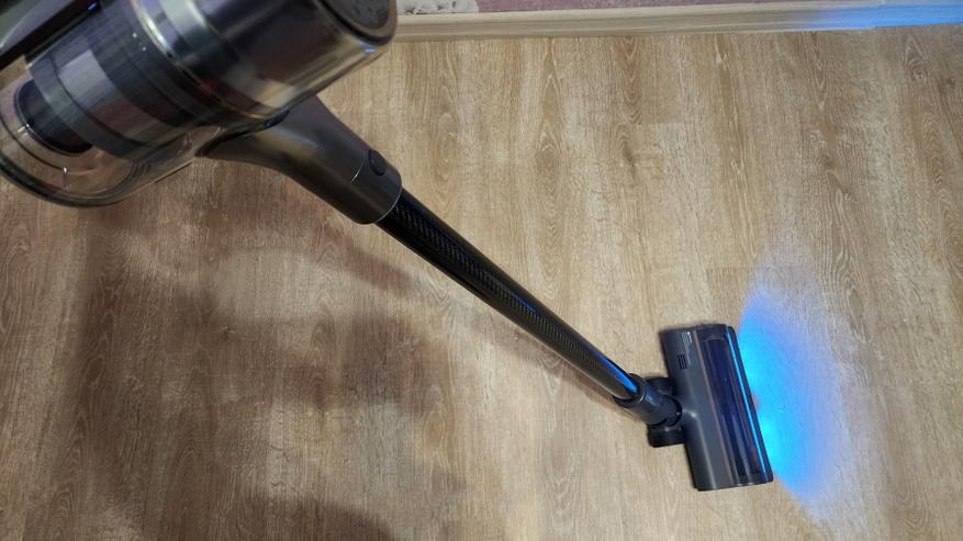 Одна из насадок — широкая универсальная, оснащается парой светодиодов с функцией подсветки вдоль пола. Это позволяет не пропустить участки с пылью или мусором, фактически, визуализировать частицы пыли/мусора.