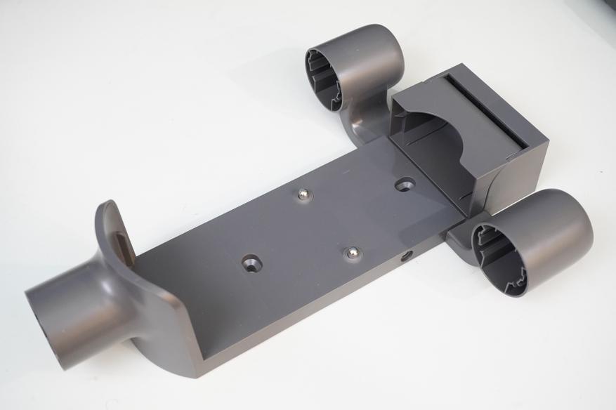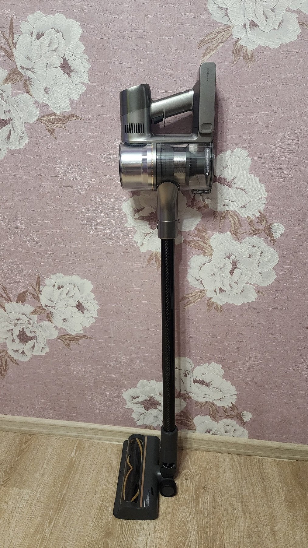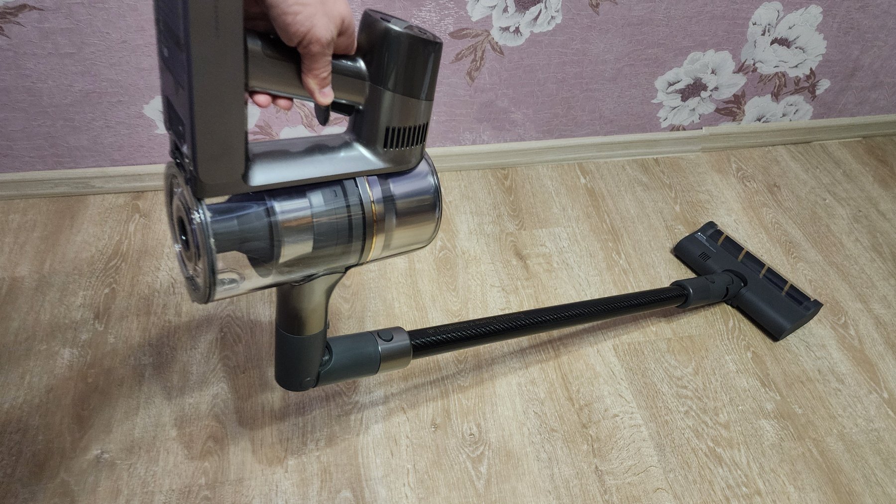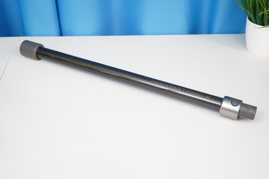 В самом начале я указывал, что пылесос изготовлен из качественных материалов. Так, на удлинительной трубке присутствует гравировка про «Спроектировано в лаборатории Dreame», а сама трубка сделана из материала, напоминающего карбоновое полотно с характерным плетением.