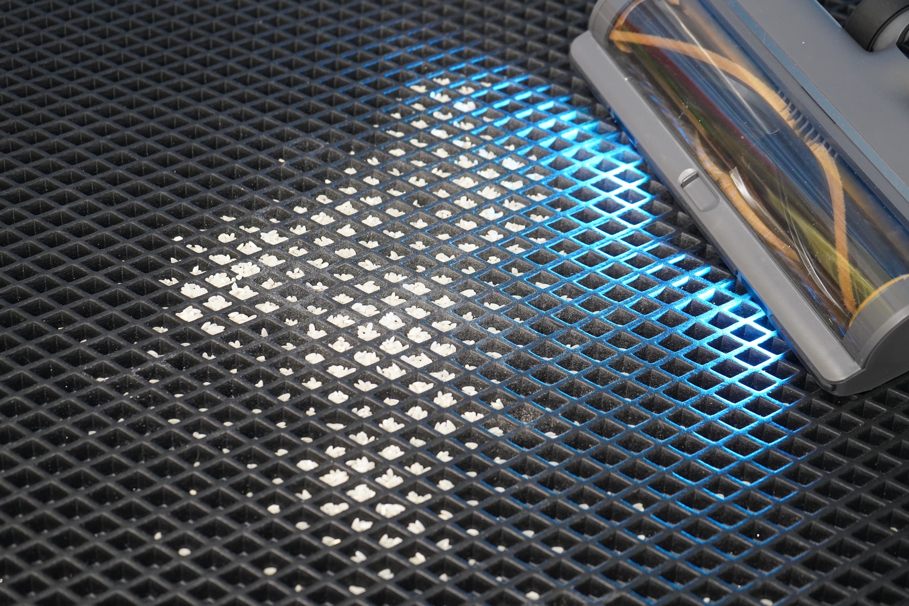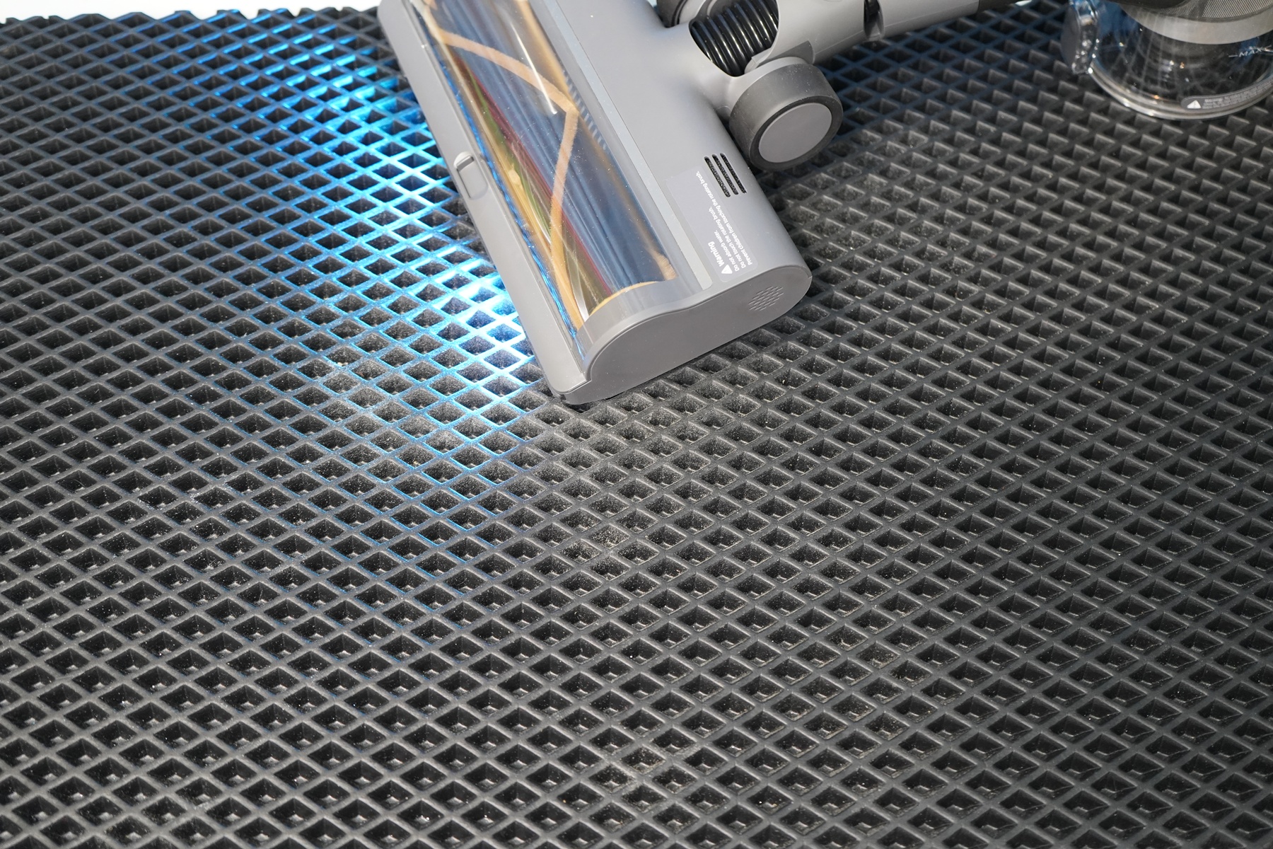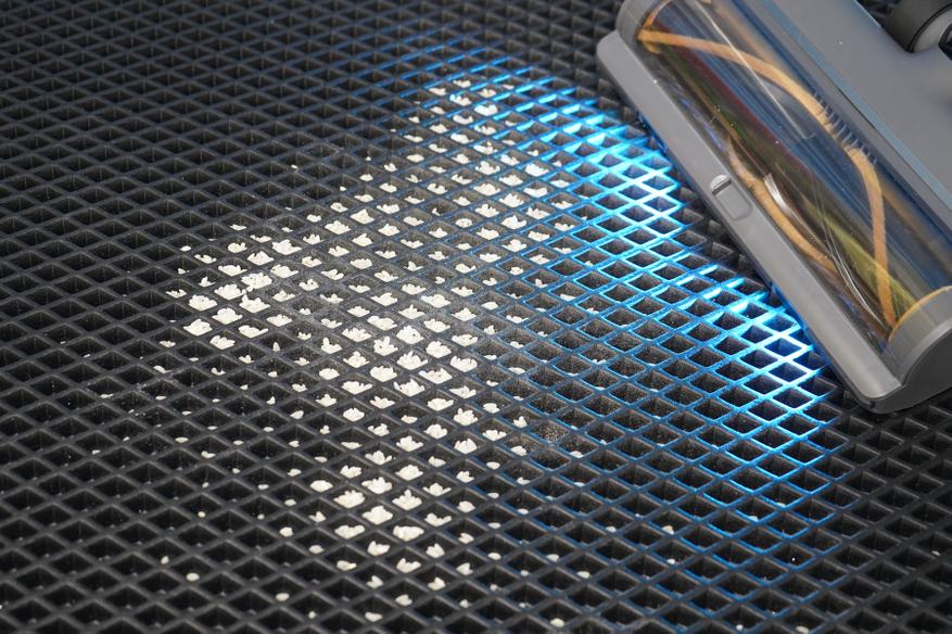 Косвенную оценку возможностей всасывания можно получить, если пропылесосить сложный рельеф, например, стыки плитки или коврик с углублениями. В моем случае пылесос справился с мусором в эва-коврике с первого раза, не оставив ни пыли, ни мелкого мусора в ячейках. Это хороший результат — далеко не все дешевые пылесосы справляются с первого раза. Пылесос действительно оснащается высокоскоростным двигателем, напомню, что для этой модели пылесоса заявлены значения 190 аВт и 150 000 оборотов за минуту.