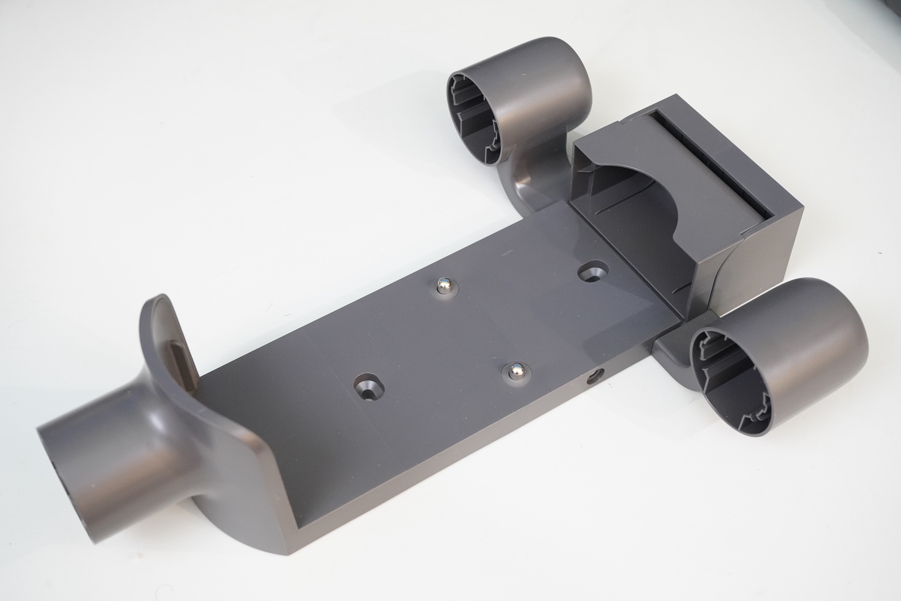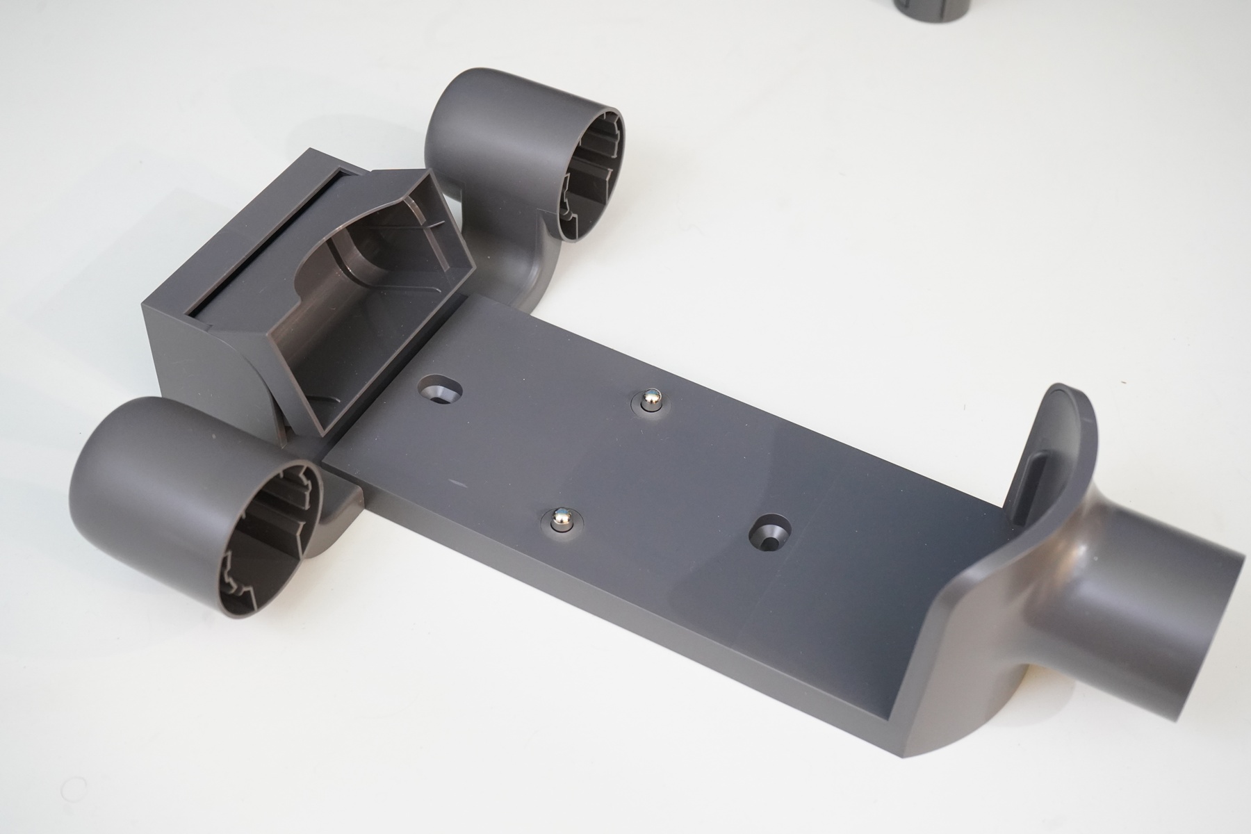 А вот так выглядит крепление для установки пылесоса на стену. Предусмотрен подвижный захват для батареи и ложемент, фиксирующие корпус пылесоса во время хранения, а также пара контактов с пружиной, позволяющие проводить подзарядку во время хранения. Полная зарядка АКБ пылесоса занимает около четырех часов. Отмечу три ячейки, позволяющие установить и хранить насадки из комплекта — необходимое будет под рукой.