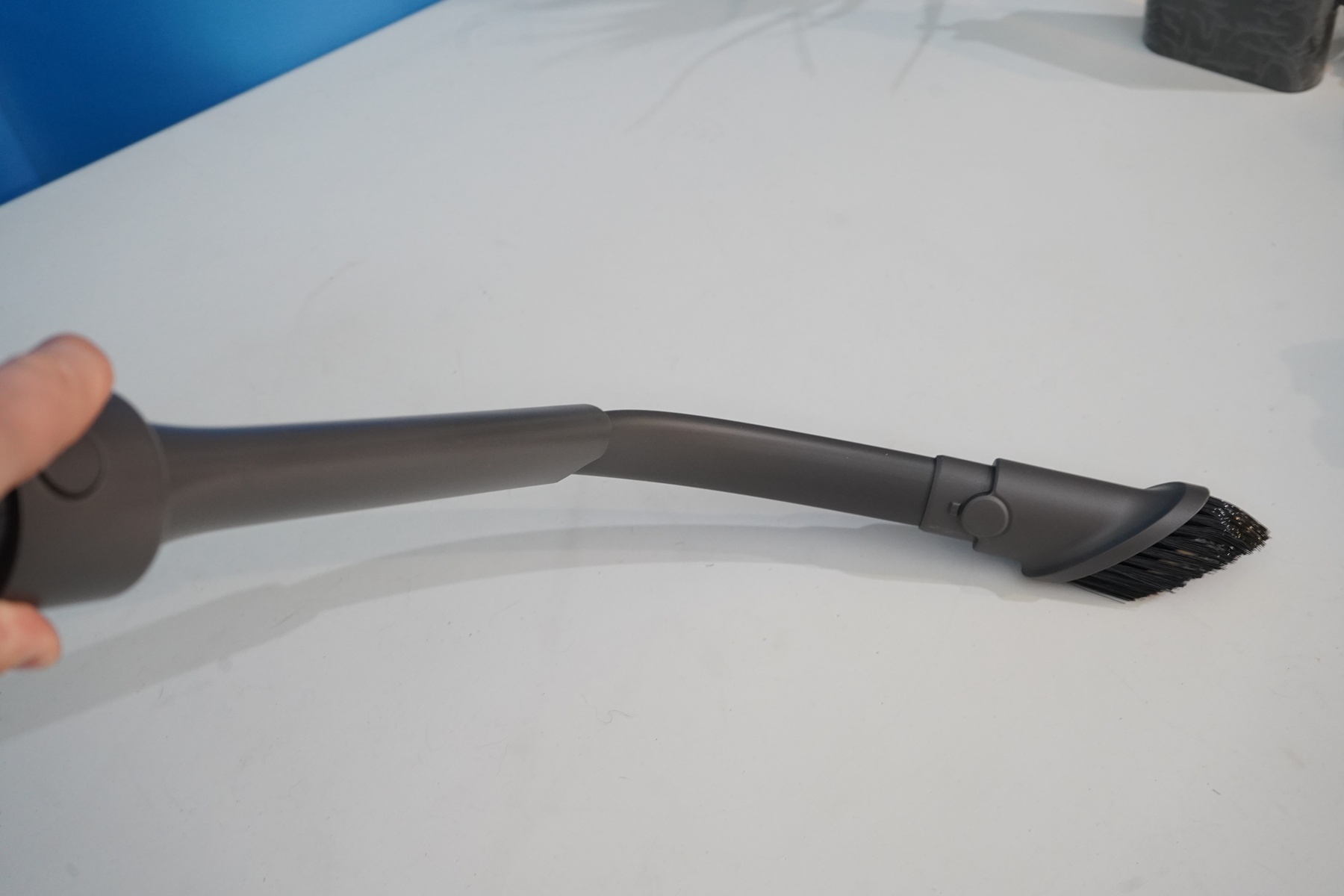 У R20 нет шланга в комплекте, зато предусмотрен сгибаемый адаптер. А для труднодоступных мест предусмотрена узкая насадка с дополнительно выдвигающимся эластичным «носиком».
