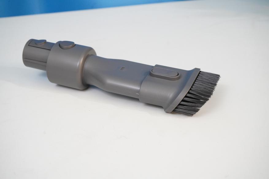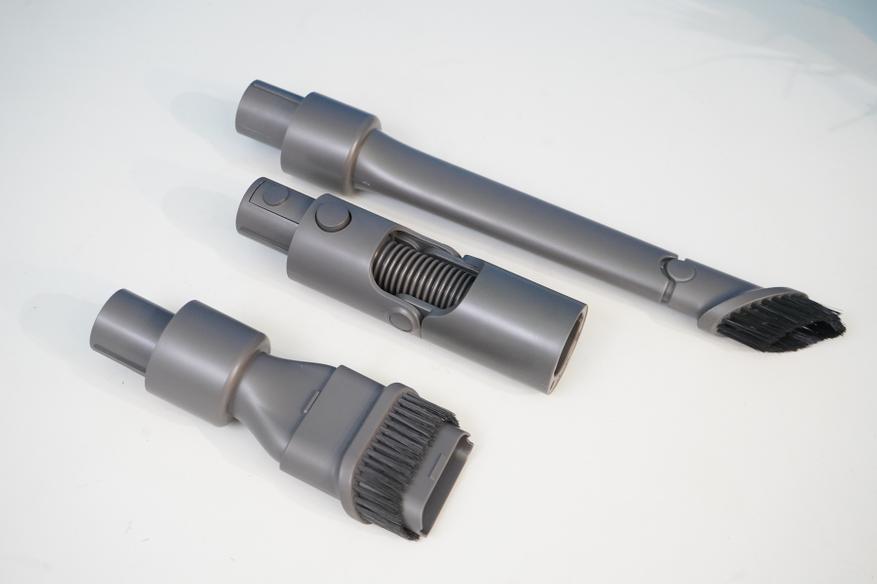 Как я уже отметил в самом начале этого обзора, в комплекте с Dreame R20 было несколько насадок для ручной уборки, а также адаптер для сгибания трубки и насадок. Кстати, этот адаптер можно использовать и с самими насадками для ручной уборки — здесь нет каких-либо ограничений, все зависит от ваших требований к уборке. Что же касается самих насадок, то отмечу подвижную часть насадки типа «два в одном» (подвижная часть с щеточкой), а также вытягиваемую эластичную часть в щелевой насадке.