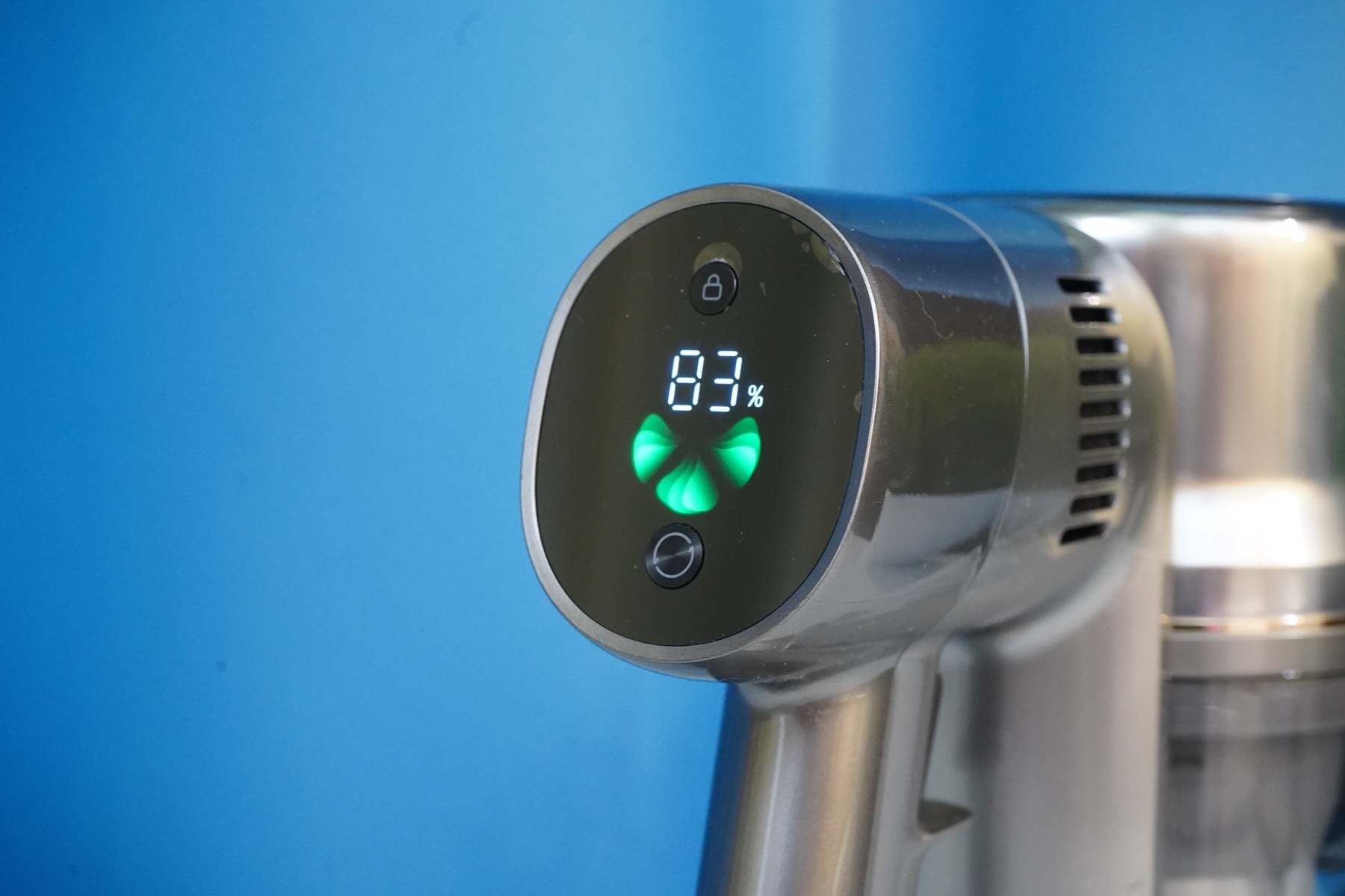 Дополнительная кнопка на дисплее дает возможность зафиксировать работу пылесоса в активном режиме для того, чтобы не держать постоянно «курок» нажатым, как было в старых версиях пылесосов Dyson.