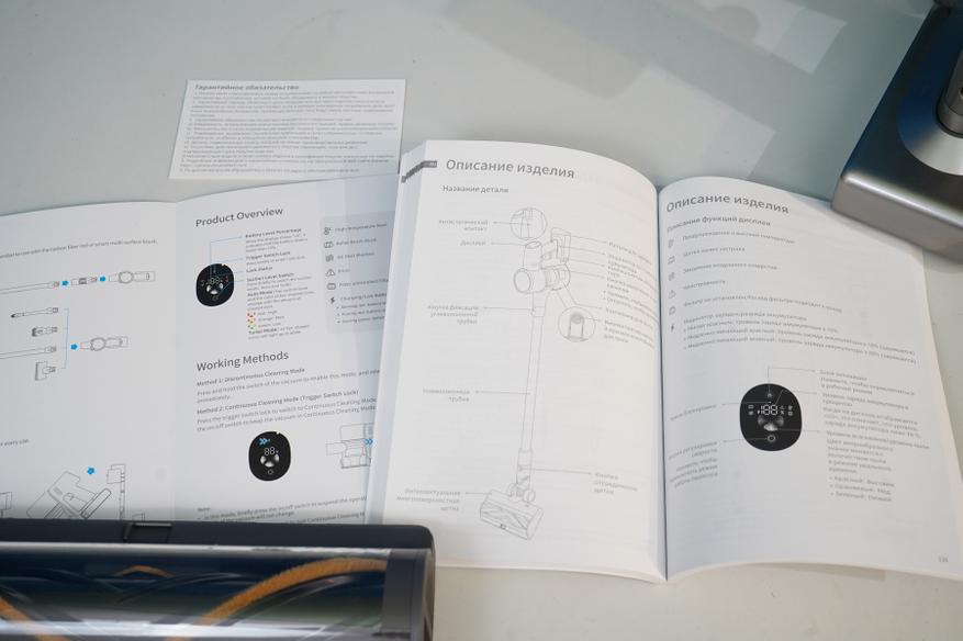Есть и инструкция по эксплуатации, краткая памятка по уходу за пылесосом. Памятка на английском языке, а вот инструкция для пользователя оказалась подробной и на русском языке. Указаны все режимы работы, а также рассказывается про очистку пылесоса после уборки и про мытье/сушку фильтров.