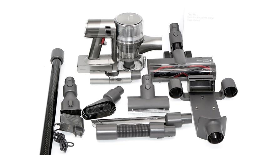 Модель Dreame R20 производит впечатление уже с момента распаковки — это качественные материалы, матовый пластик насадок, серебристая отделка корпуса пылесоса, а также удлинительная труба с дизайном «под карбон». В комплектации вы найдете следующие насадки: