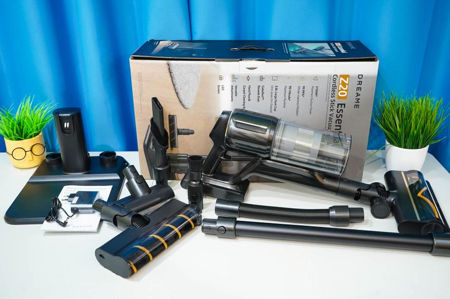 На самом деле выбор хорошего пылесоса может быть сложным, так как на рынке присутствует множество моделей за плюс-минус похожую стоимость. Если говорить именно о мощных беспроводные моделях, то хочу обозначить эти два варианта, не уступающие обогреваемому R20 по возможностям. Речь идет про пылесосы Dreame T30 и Dreame Z20. Начну со сравнения с моделью Dreame Z20, который комплектуется близким по характеристикам 540 Вт BLDC двигателем и способен работать до 90 минут на минимальном режиме. По ссылке доступен мой обзор с тестами Dreame Z20 Essential. В частности, во время оценки уровня всасывания измерил значение около 23.5 кПа (отсечка срабатывает чуть позже при аналогичном измерении), что весьма и весьма неплохо. Также отмечу, что в комплектации Essential предусмотрена оригинальная вертикальная подставка — довольно удобный способ иметь и сам пылесос, и насадки, всегда под рукой. Также есть точечная насадки и гибкий шланг для уборки.