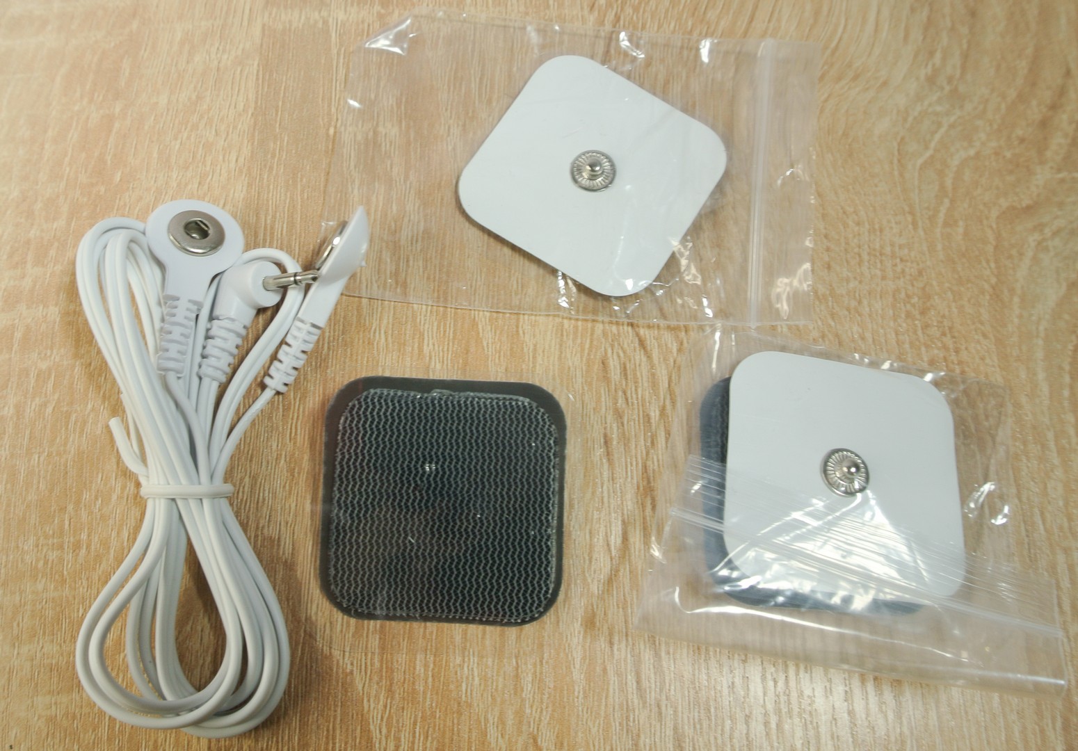 Контактный провод для электростимуляции с одной стороны имеет штекер на 2.5мм, а на другой стороне контакт, куда подключаются контактные площадки. Соединение изготовлено в виде кнопки для одежды.
