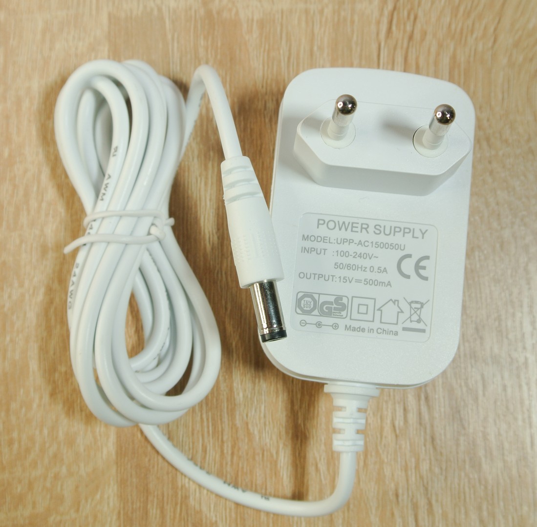 Блок питания на 15В и 0.5А, с круглым разъемом на обратной стороне.