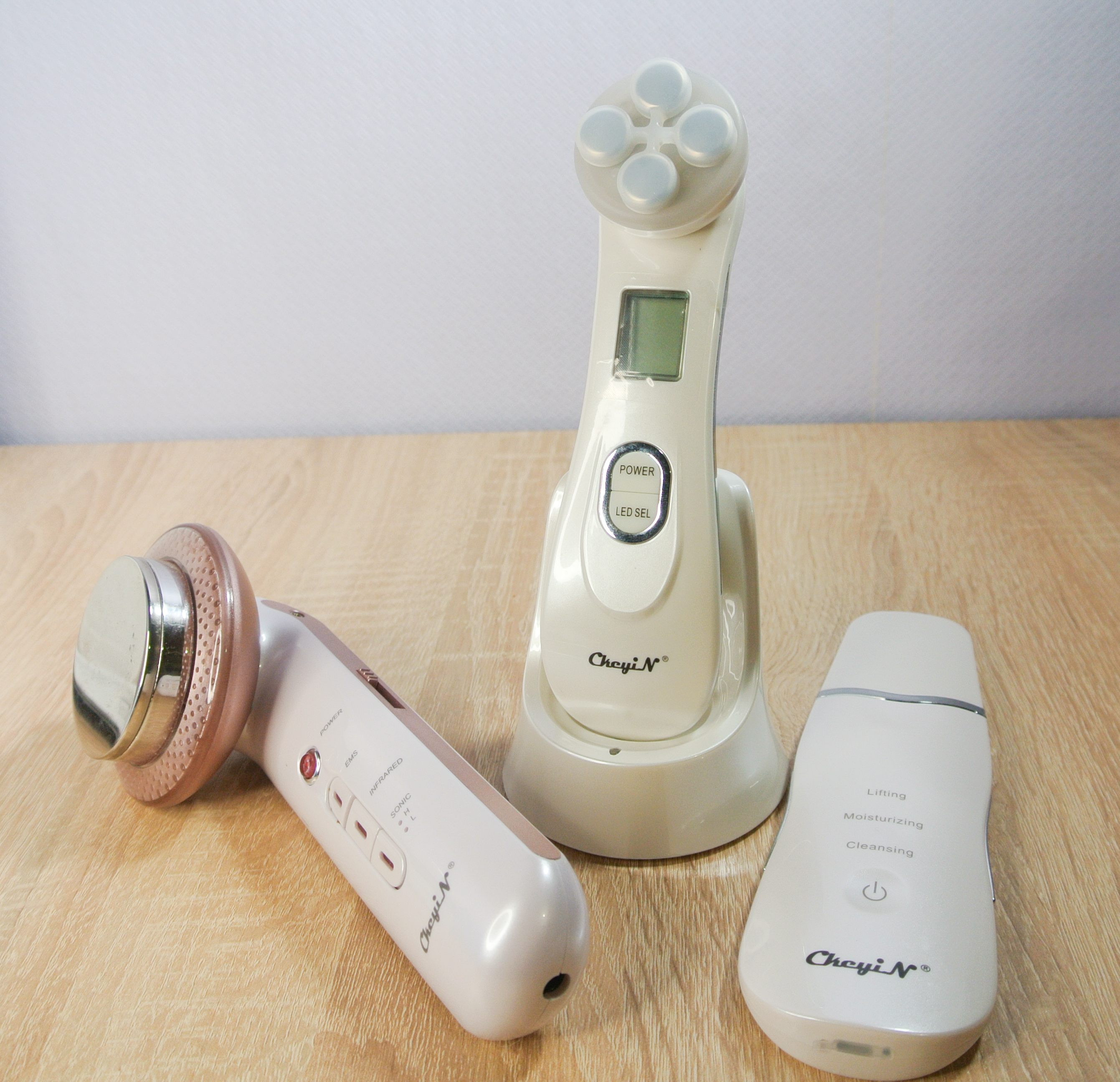 В посылке находится один ультразвуковой скрабер для кожи лица, один прибор для RF лифтинга и аппарат для похудения 3 в 1. Начнем по порядку их рассматривать. По ссылке вы можете посмотреть стоимость набора, но каждый предмет можно приобрести отдельно.