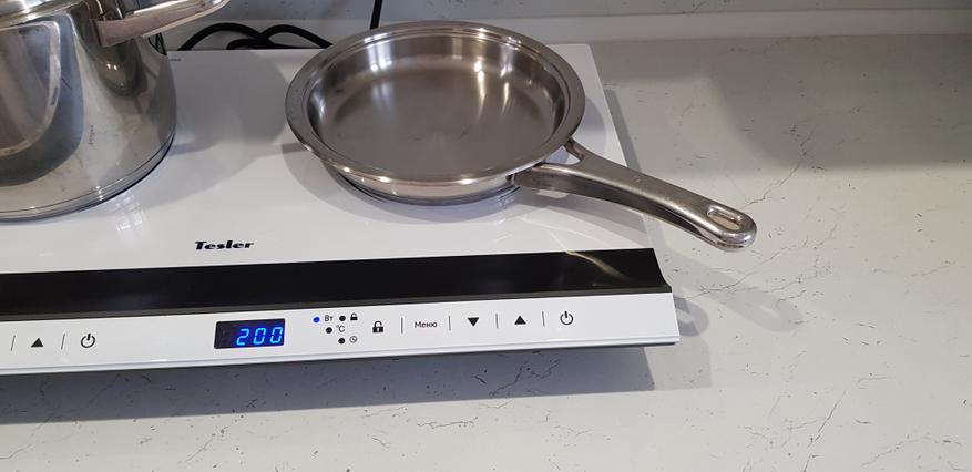 Хозяйка очень переживала, подойдет ли ее старая посуда для использования на новом приборе. Мы проверили, например, обычные эмалированные чайник и кастрюли прибор распознает, как и посуду Berghoff и ZEPTER, а вот сковороды отказались работать.