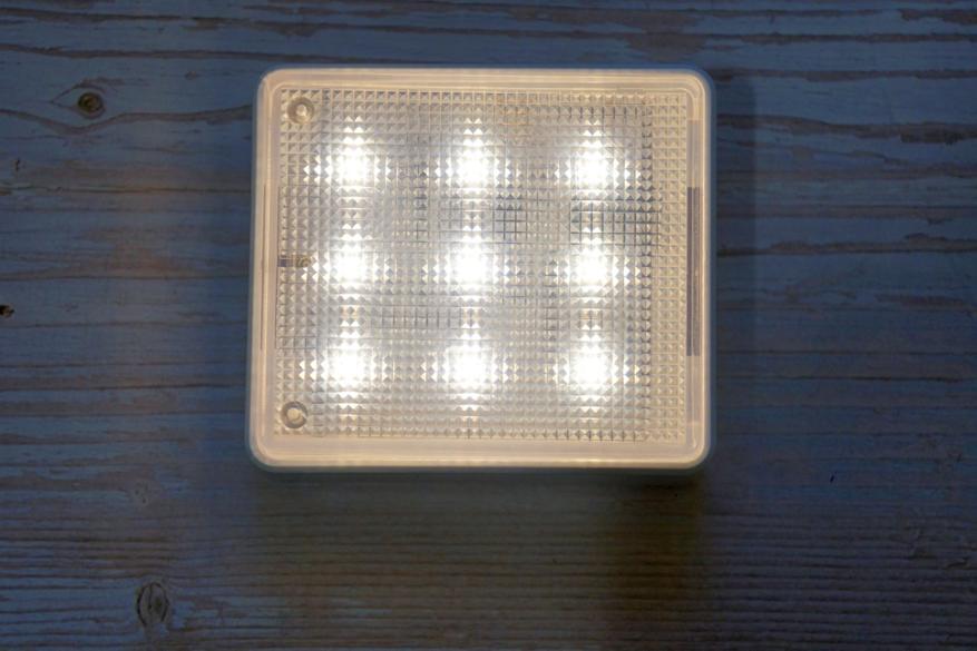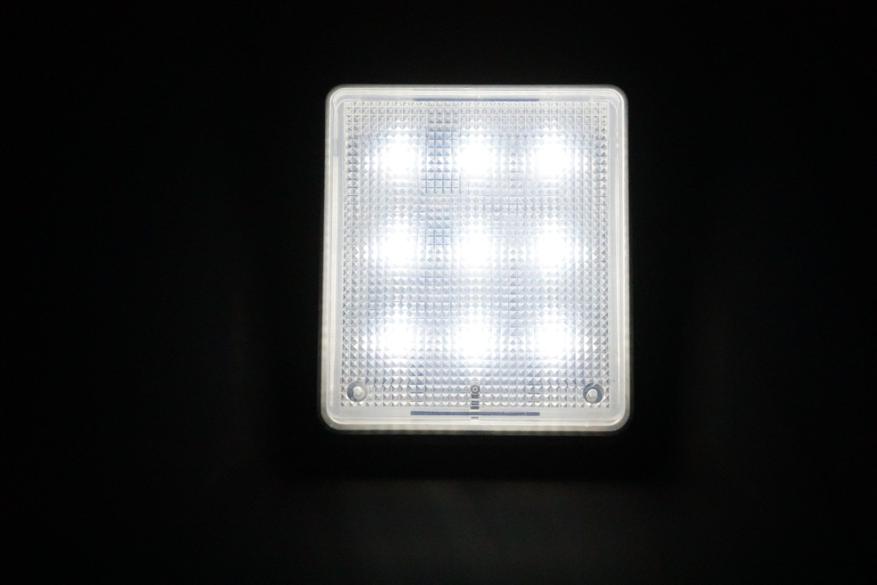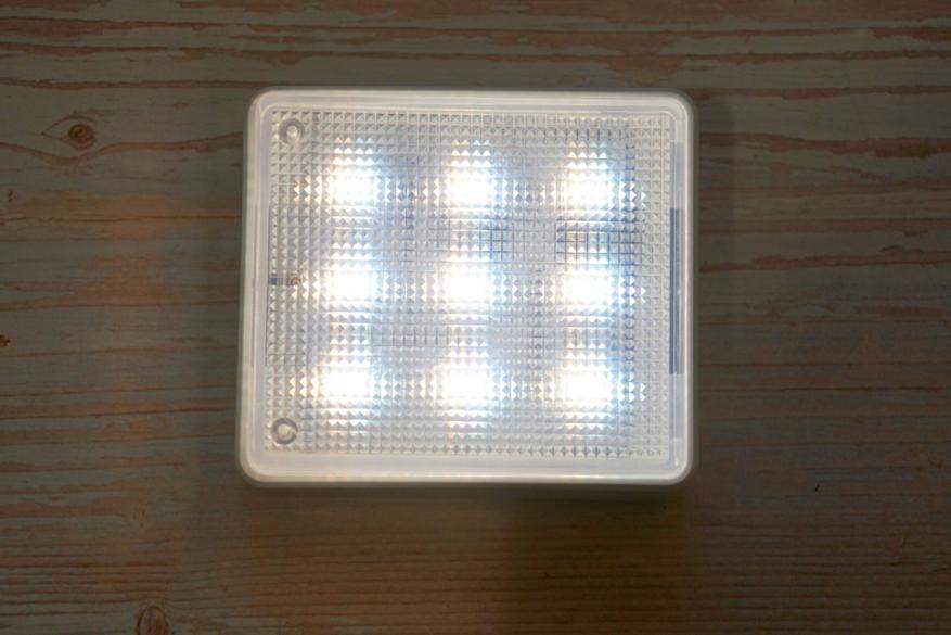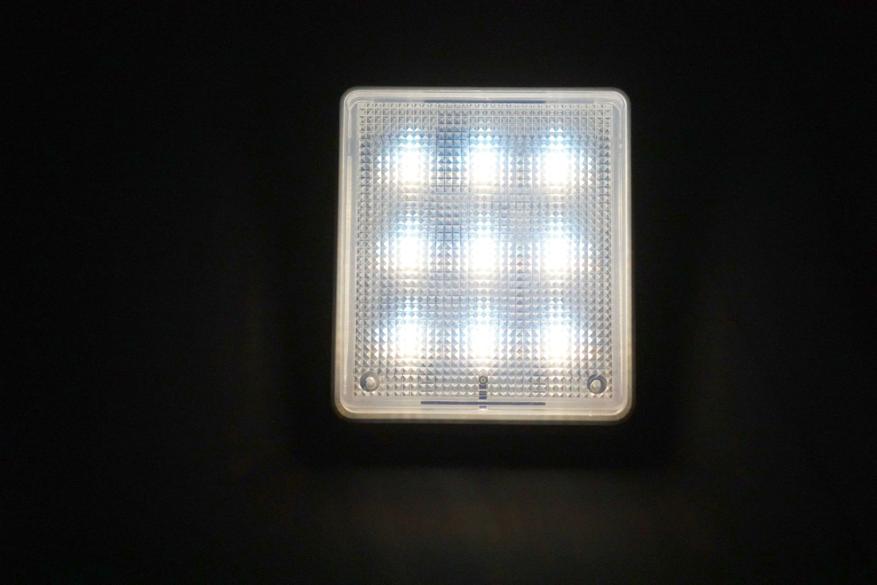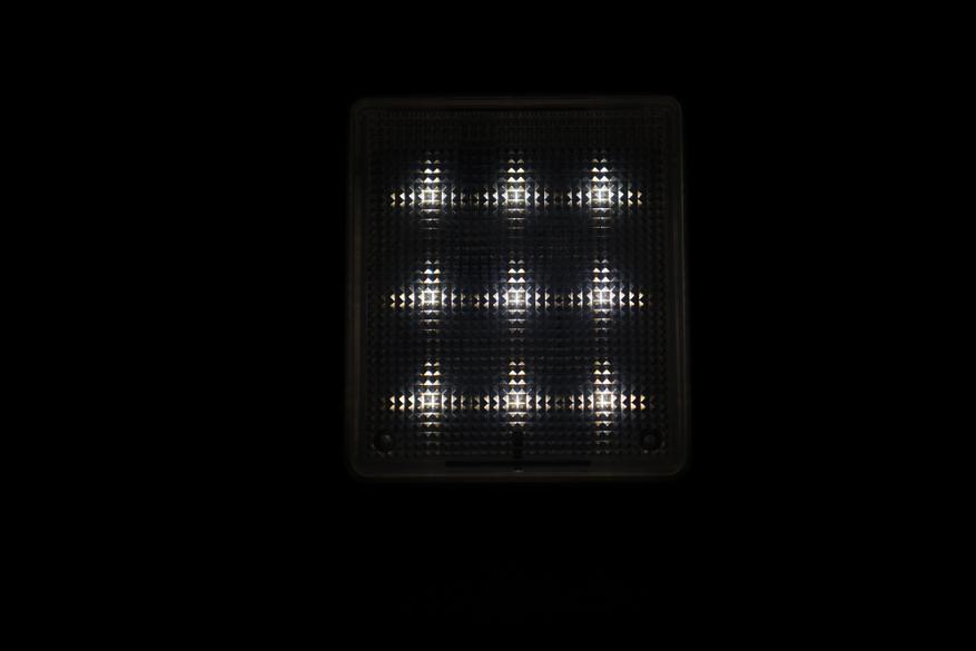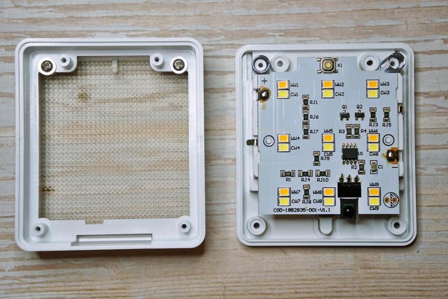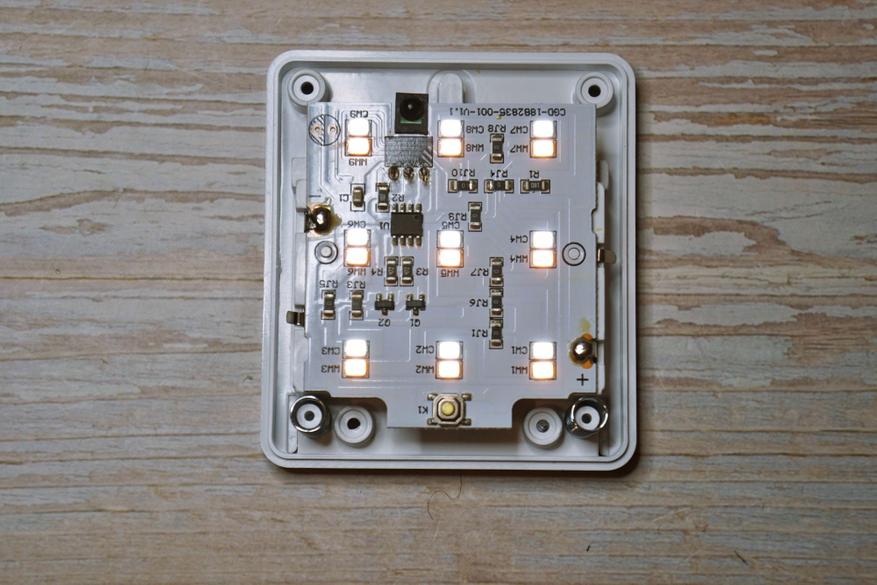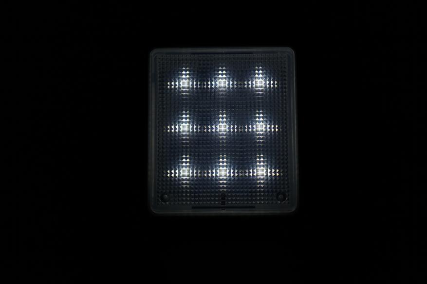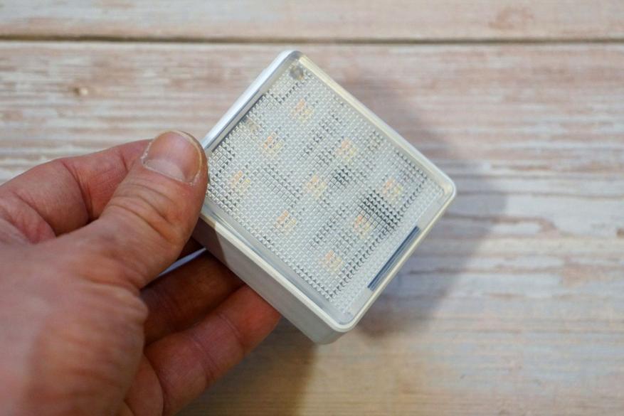 Девайс представляет из себя плоскую коробочку с полупрозрачной рифленой поверхностью под которой располагаются 18 COB светодиодов (9 холодного оттенка и 9 теплого оттенка):