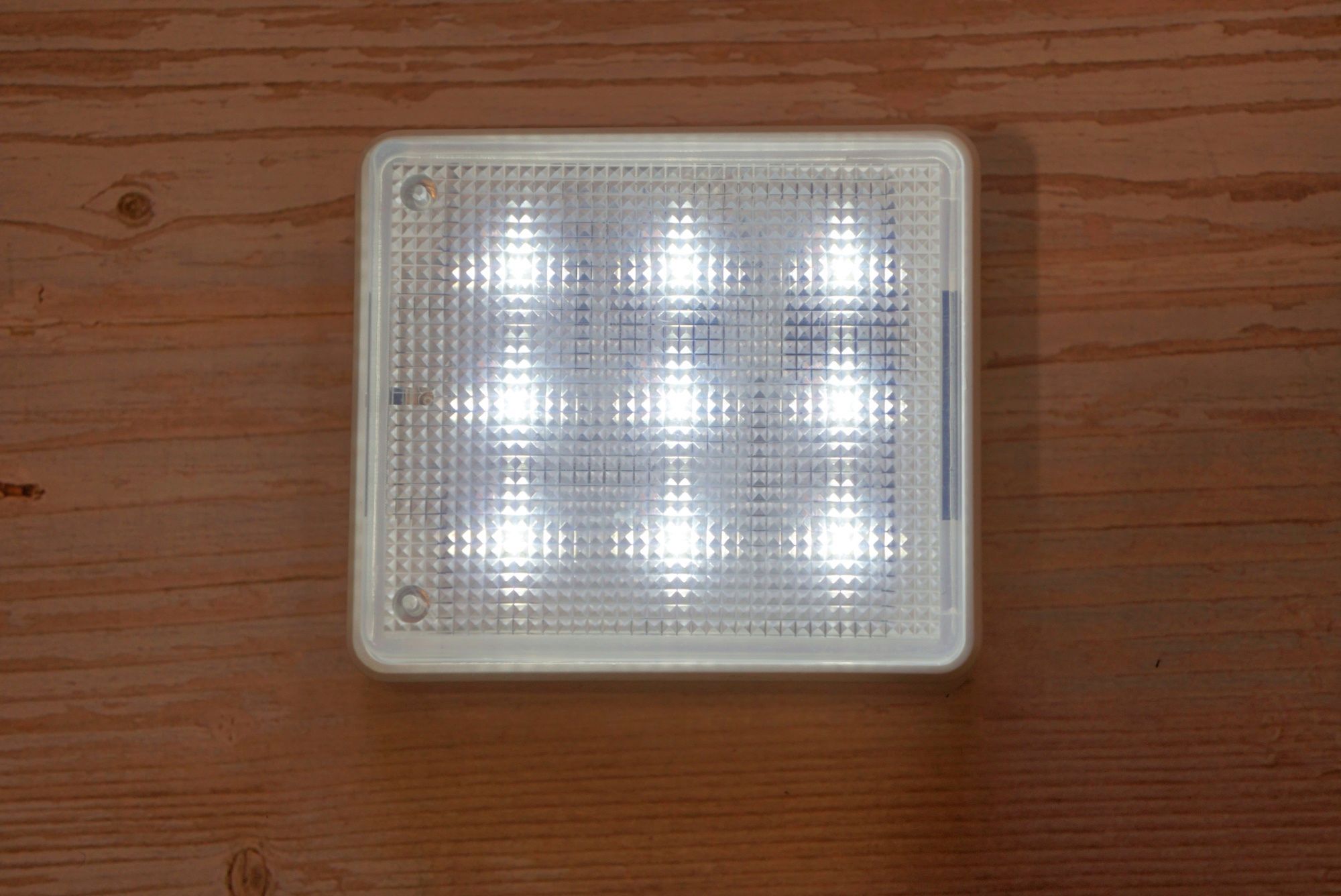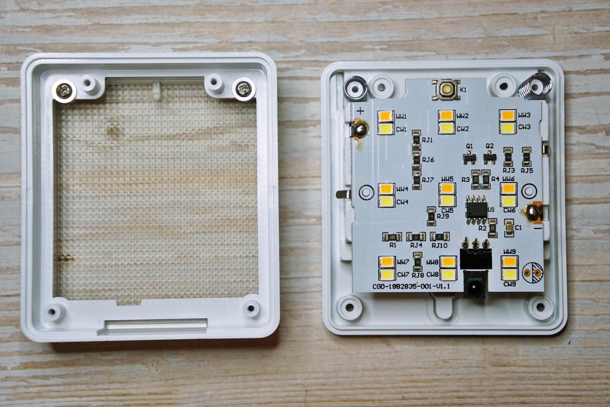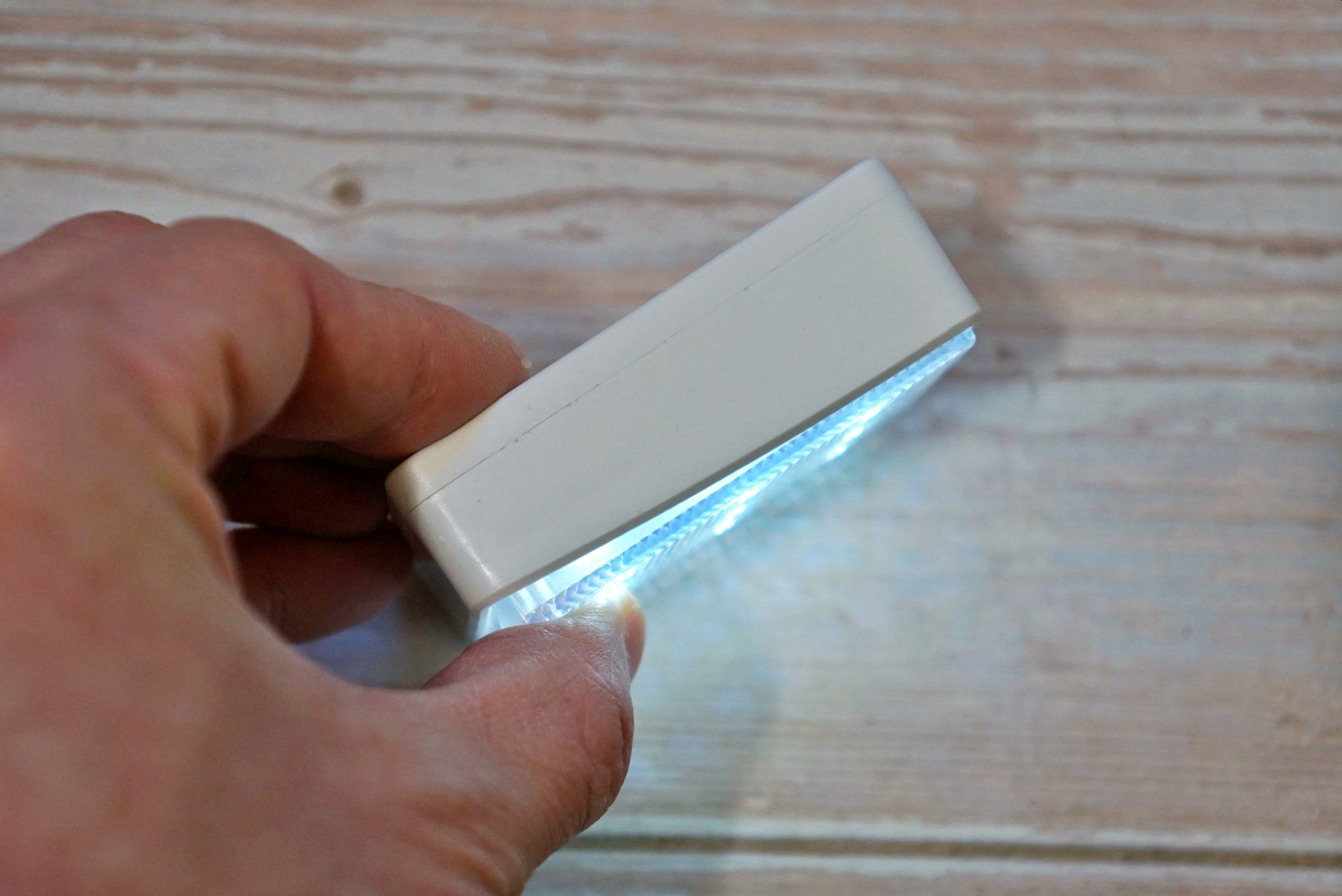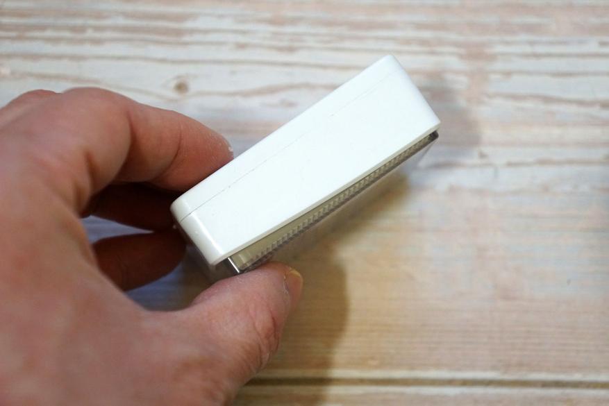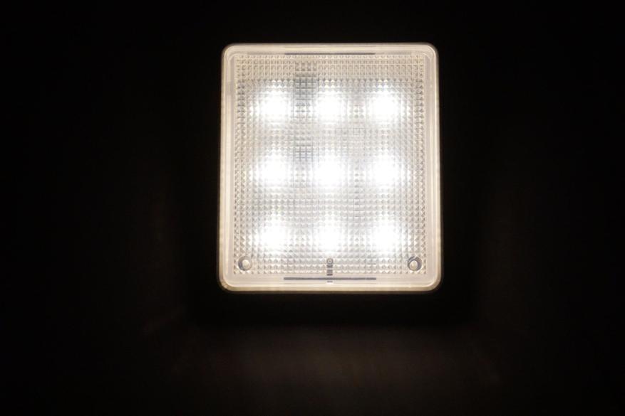 Девайс представляет из себя плоскую коробочку с полупрозрачной рифленой поверхностью под которой располагаются 18 COB светодиодов (9 холодного оттенка и 9 теплого оттенка):