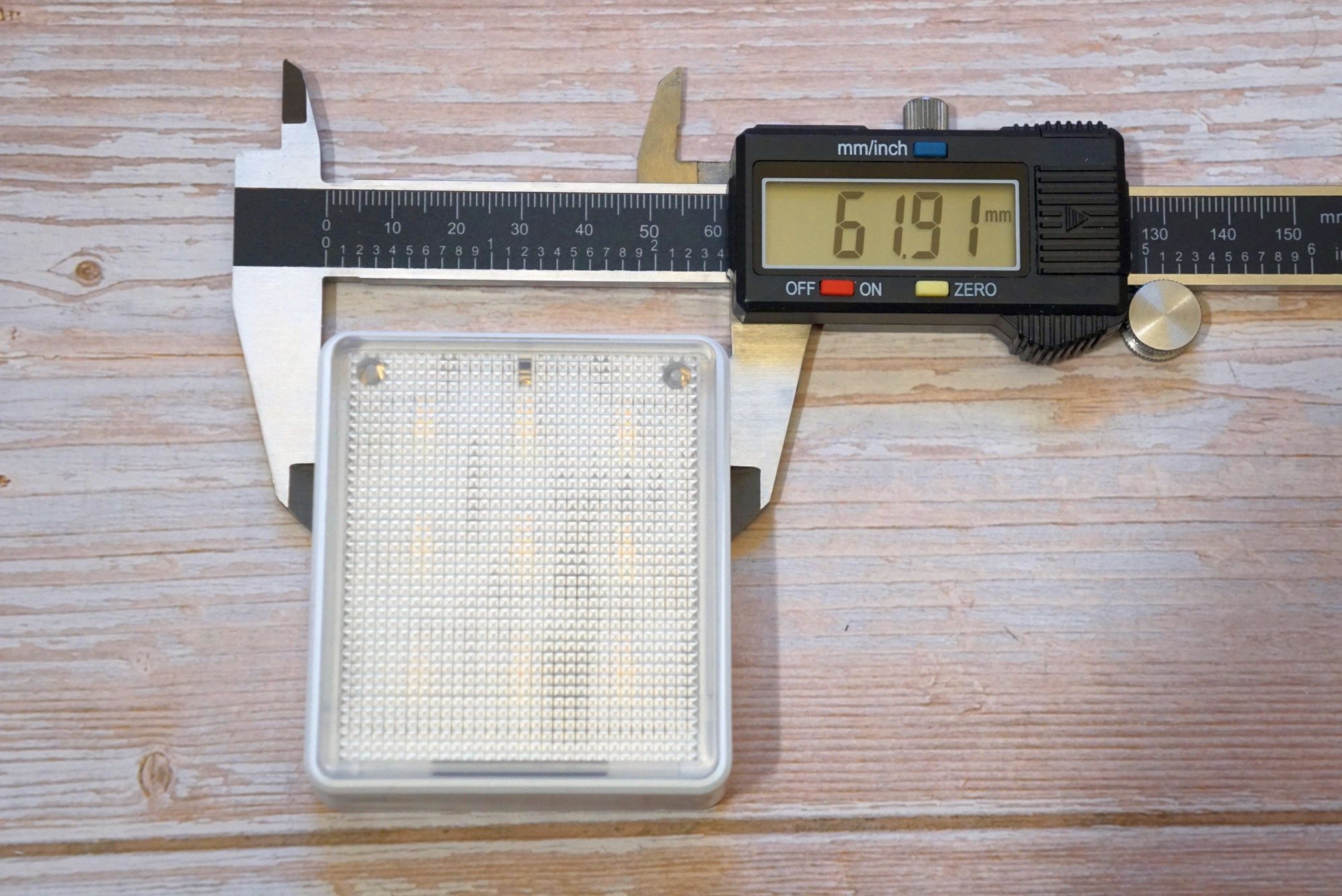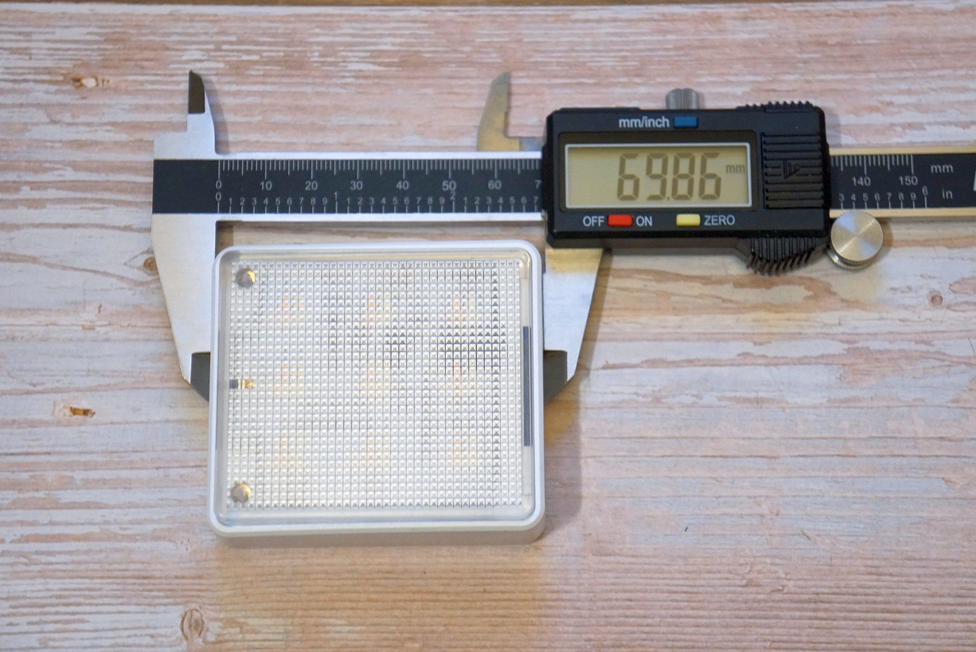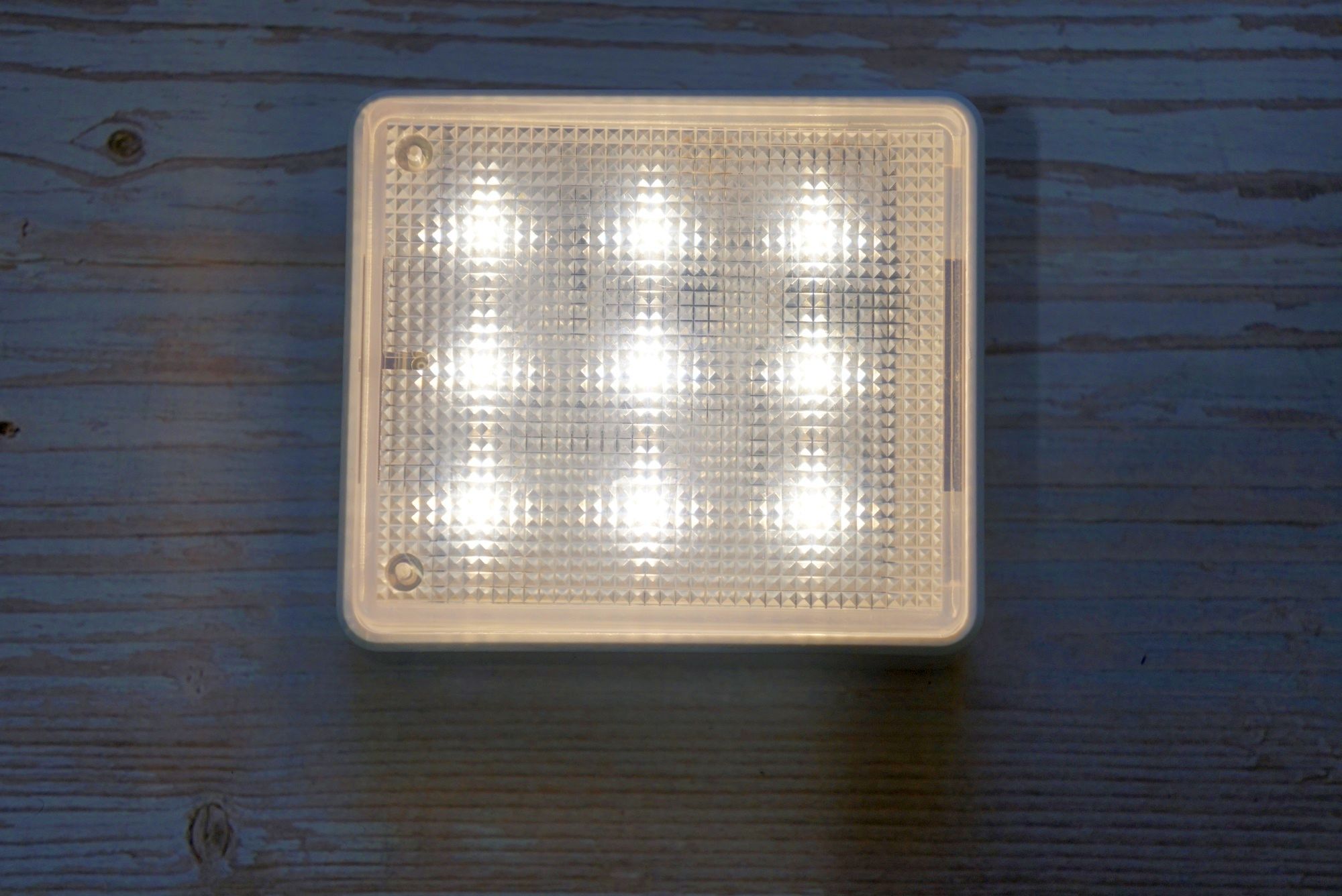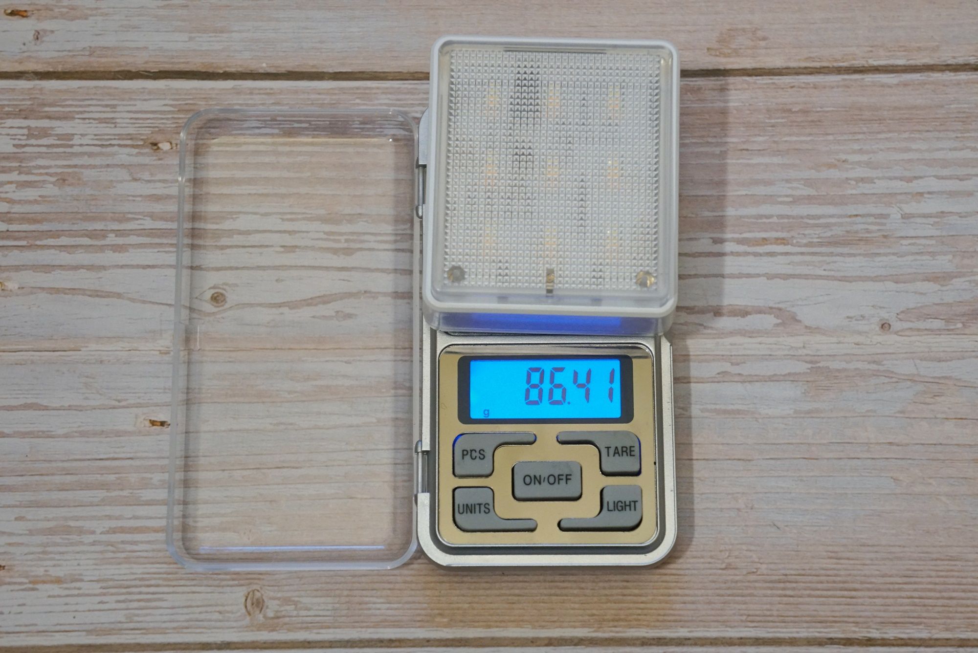 Девайс представляет из себя плоскую коробочку с полупрозрачной рифленой поверхностью под которой располагаются 18 COB светодиодов (9 холодного оттенка и 9 теплого оттенка):