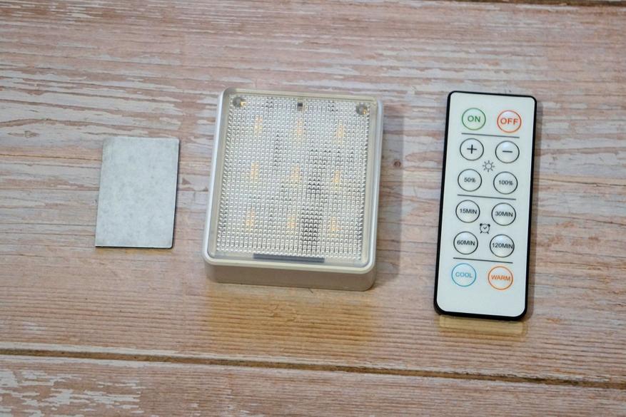 Устройство идет в комплекте с пультом дистанционного управления и пластинкой двухстороннего скотча: