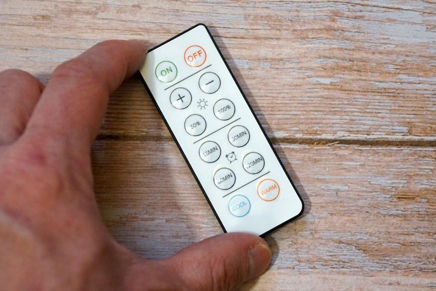 Комплектный инфракрасный пульт, позволяет включать светильник, менять режимы и яркость, а также устанавливать таймер отключения (15/30/60/120мин). Дальность работы пульта около 3м: