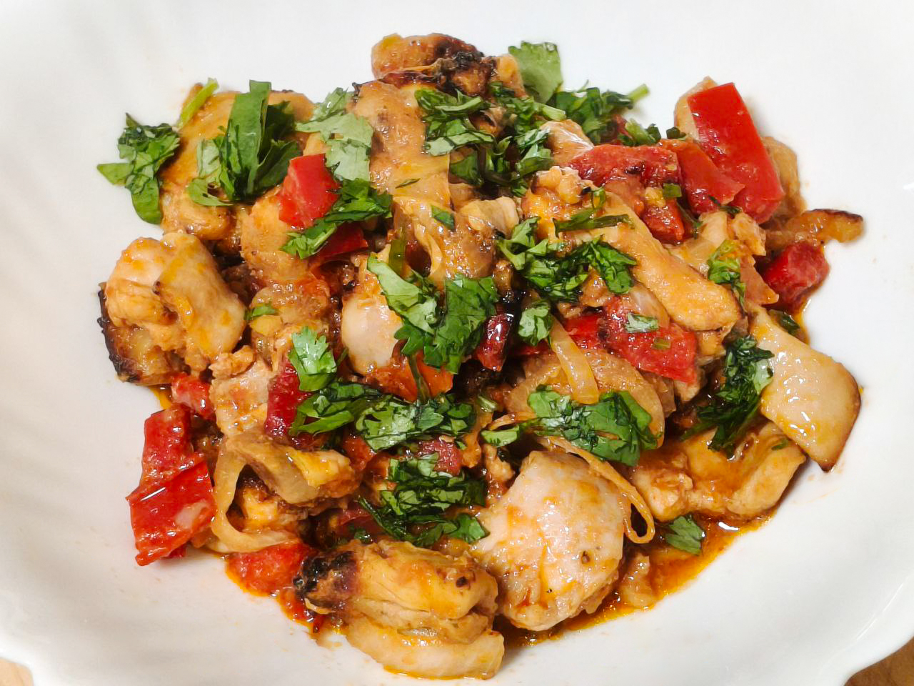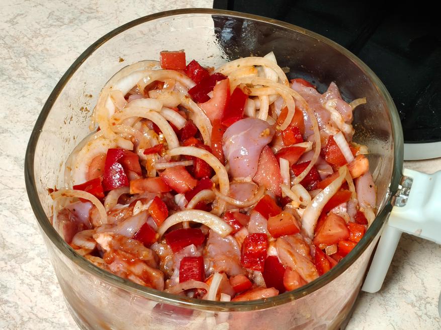 Теперь перейдем к полноценным блюдам. Первое такое — филе куриного бедра с помидорами, луком, болгарским перцем и специями. Блюдо максимально простое, все ингредиенты нарезал на небольшие кусочки, перемешал и погрузил в чашу аэрогриля без решетки. Готовил при 180° в течение часа, за время приготовления три раза доставал корзину чтобы перемешать продукты для равномерного приготовления.