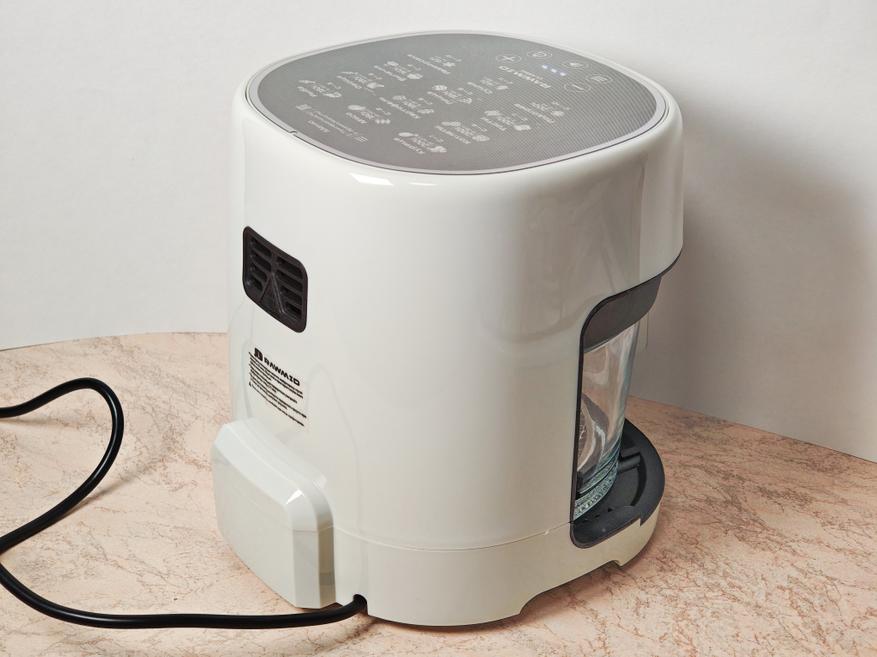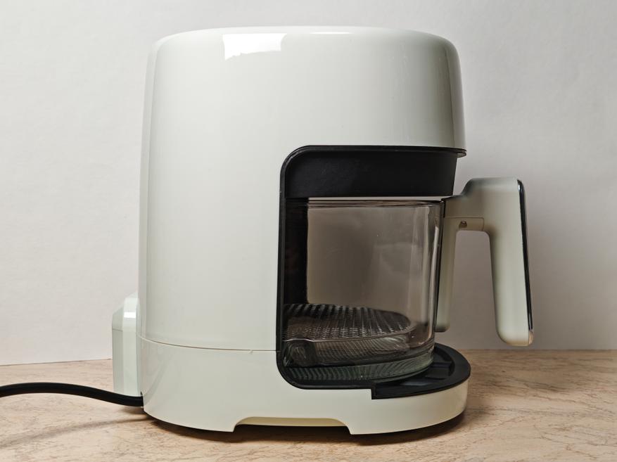 Корпус аэрогриля изготовлен из жаропрочного нетоксичного пластика, форма — вытянутый прямоугольник со скругленными углами и отсеком для чащи.