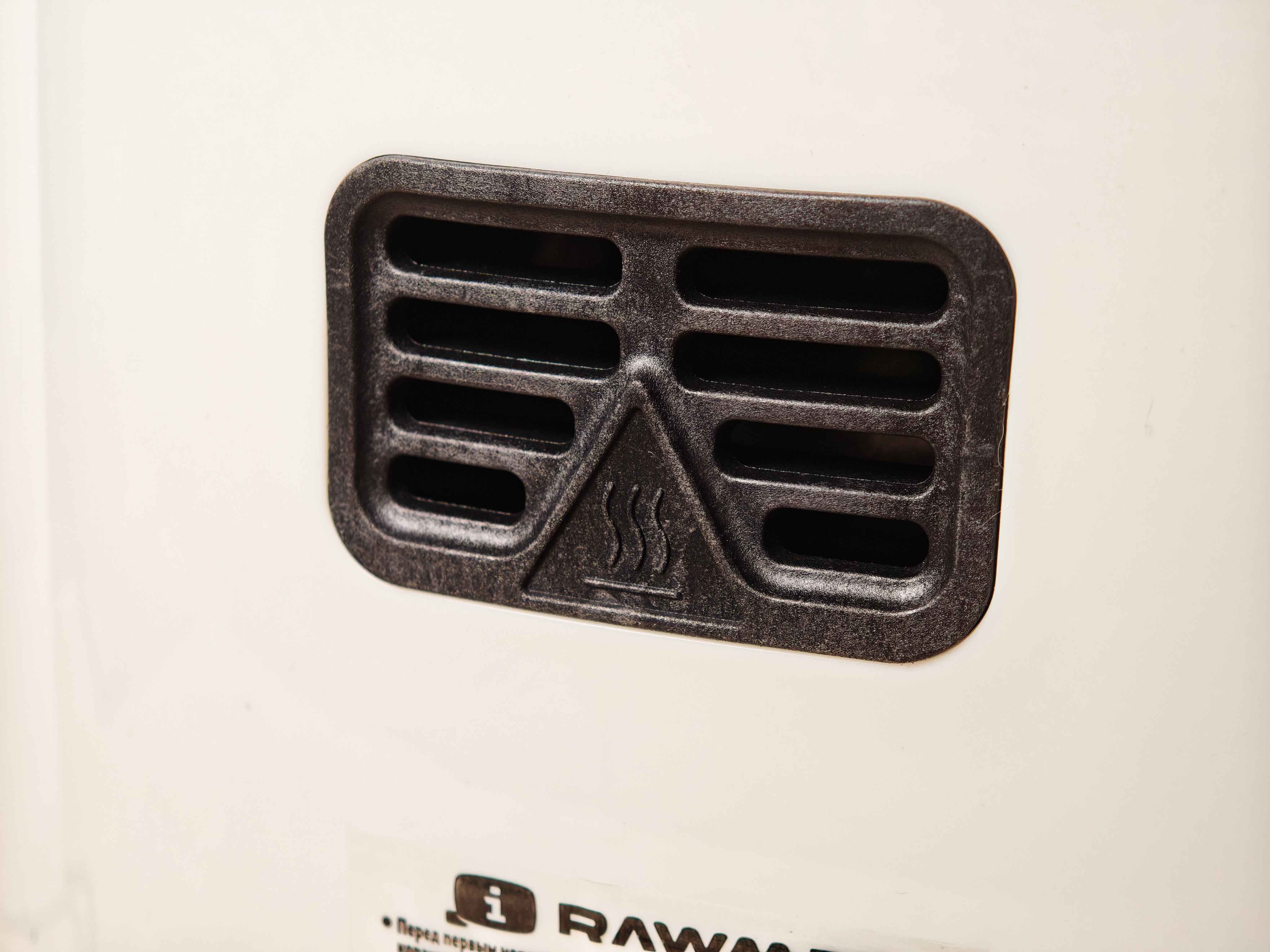 С обратной стороны фритюрницы находится сетевой кабель длинной 115 см, предупреждающая наклейка и отверстие для отвода горячего воздуха. При расположении устройства важно это учитывать и оставлять свободное пространство со всех сторон.