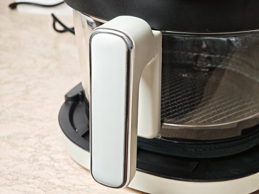 Раз начали с чаши, нужно упомянуть ручку: она правильного диаметра и длины, доставать емкость из фритюрницы удобно, пластик не нагревается даже после часа работы на максимальной температуре. Однако, как и любой пластик, со временем он начинает желтеть от высокой температуры, в месте стыка со стеклом. Меняется лишь цвет, деформации ручка не подвержена.