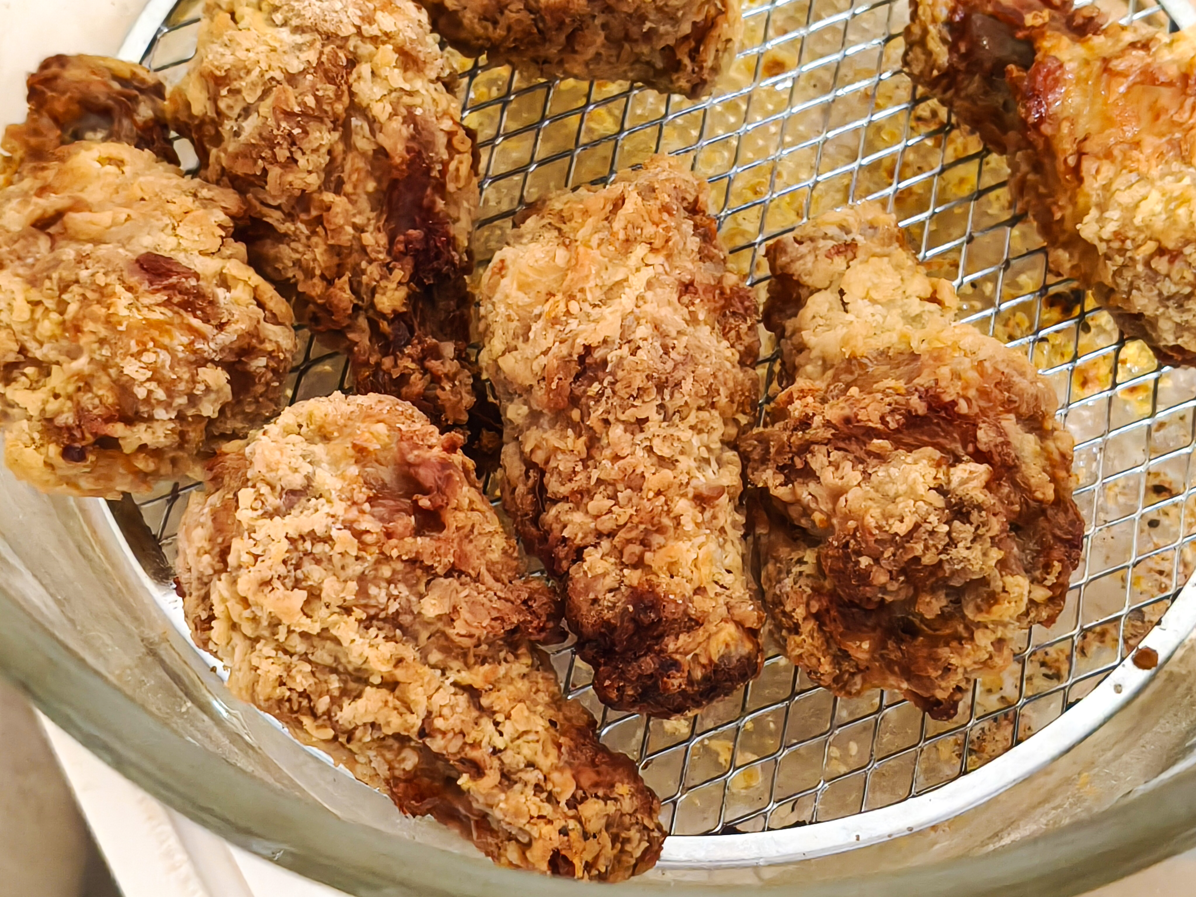 Еще один классический снек — куриные крылья в панировки, также были куплены в магазине и загружены в чашу. На упаковке было написано 20 минут в духовке, я готовил 15 минут с одной стороны и еще 7 минут после переворота. Содержимое пачки весом 400 грамм идеально поместилось на решетку в один слой. Результат порадовал, несколько раз я готовил эти крылья в духовке, корочка никогда не получалась такой, как в аэрогриле. Жарить их на сковороде тоже больше не хочется — фритюрница дает тот же результат, но процесс проще в разы.