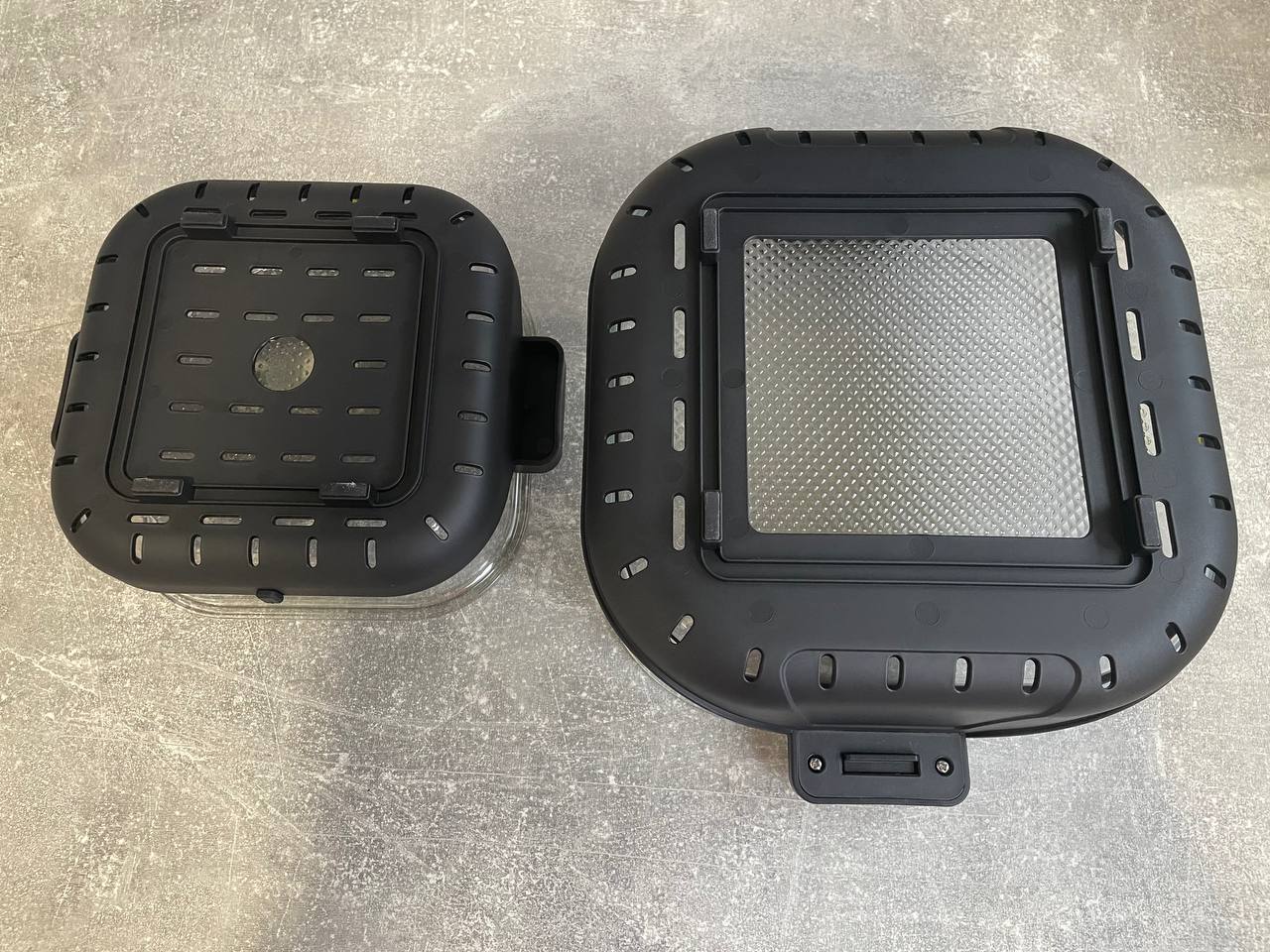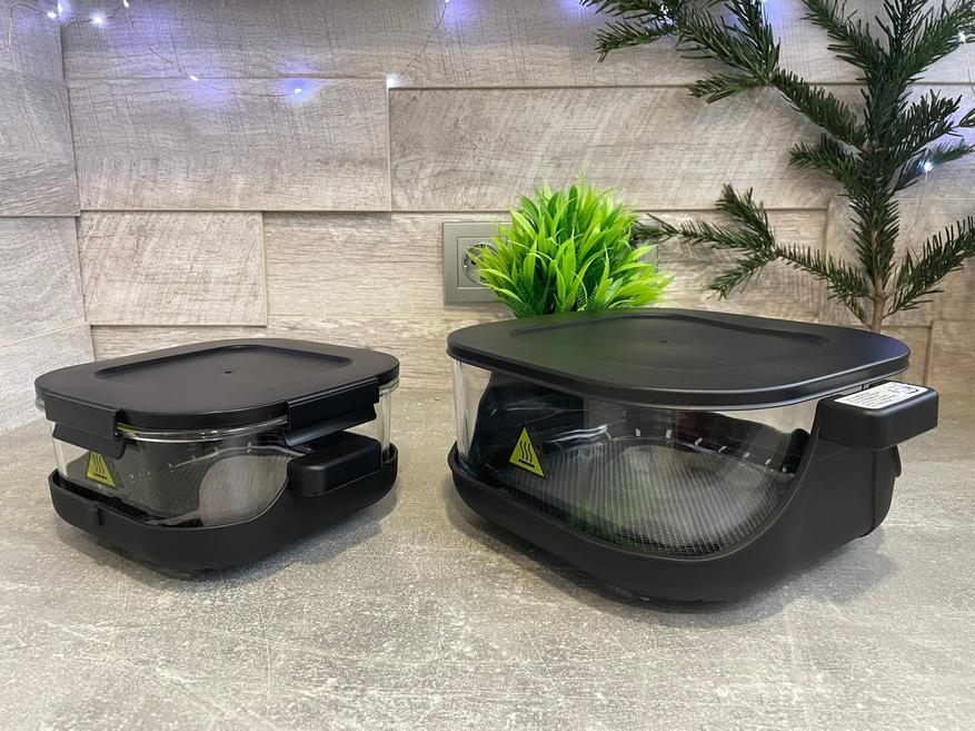Две стеклянные чаши из боросиликатного стекла 4 и 1,5 л. закрепляются на керамическое основание с ручками. Для чаш разного размера предусмотрено два поддона и две герметичные крышки.