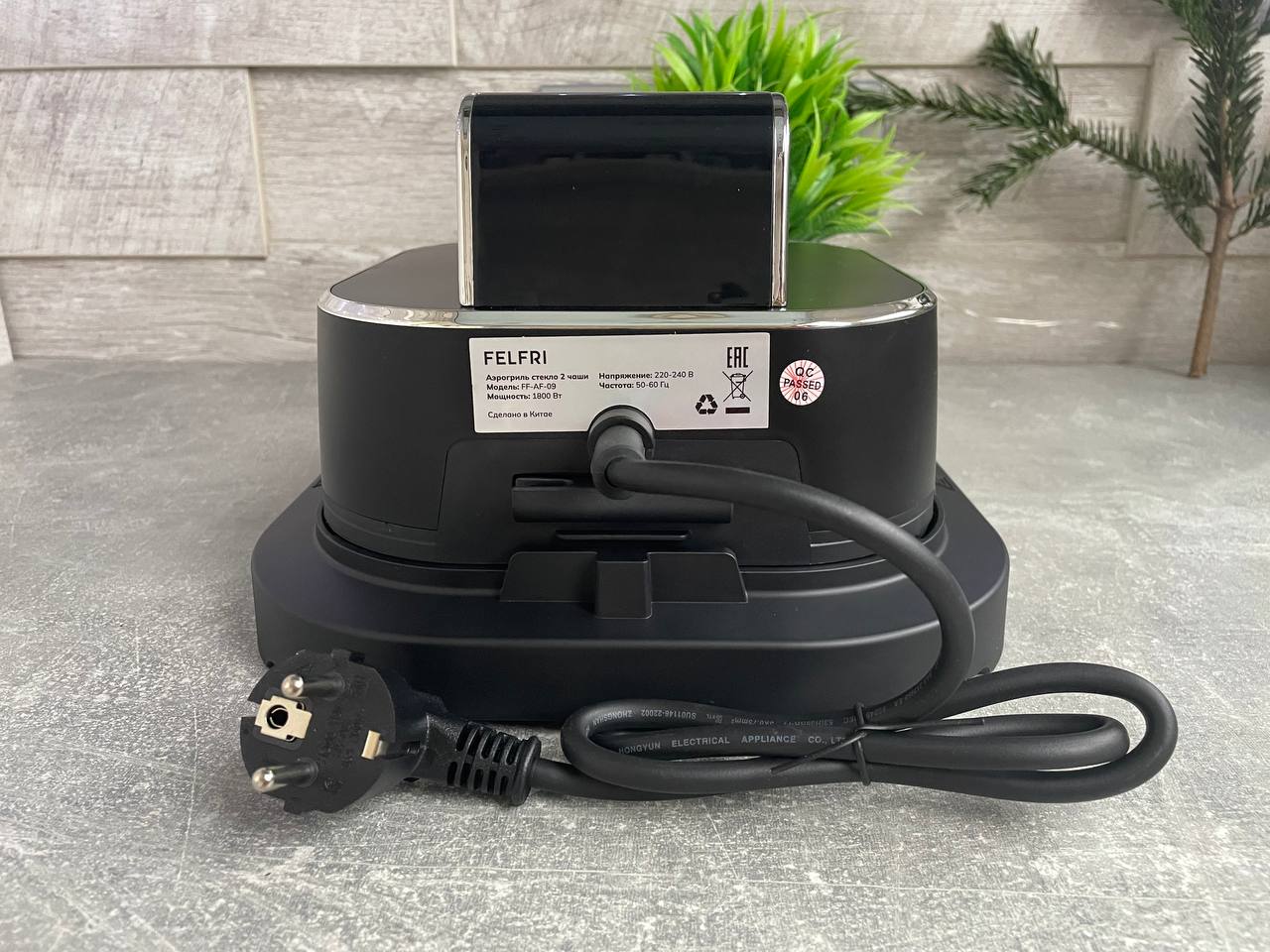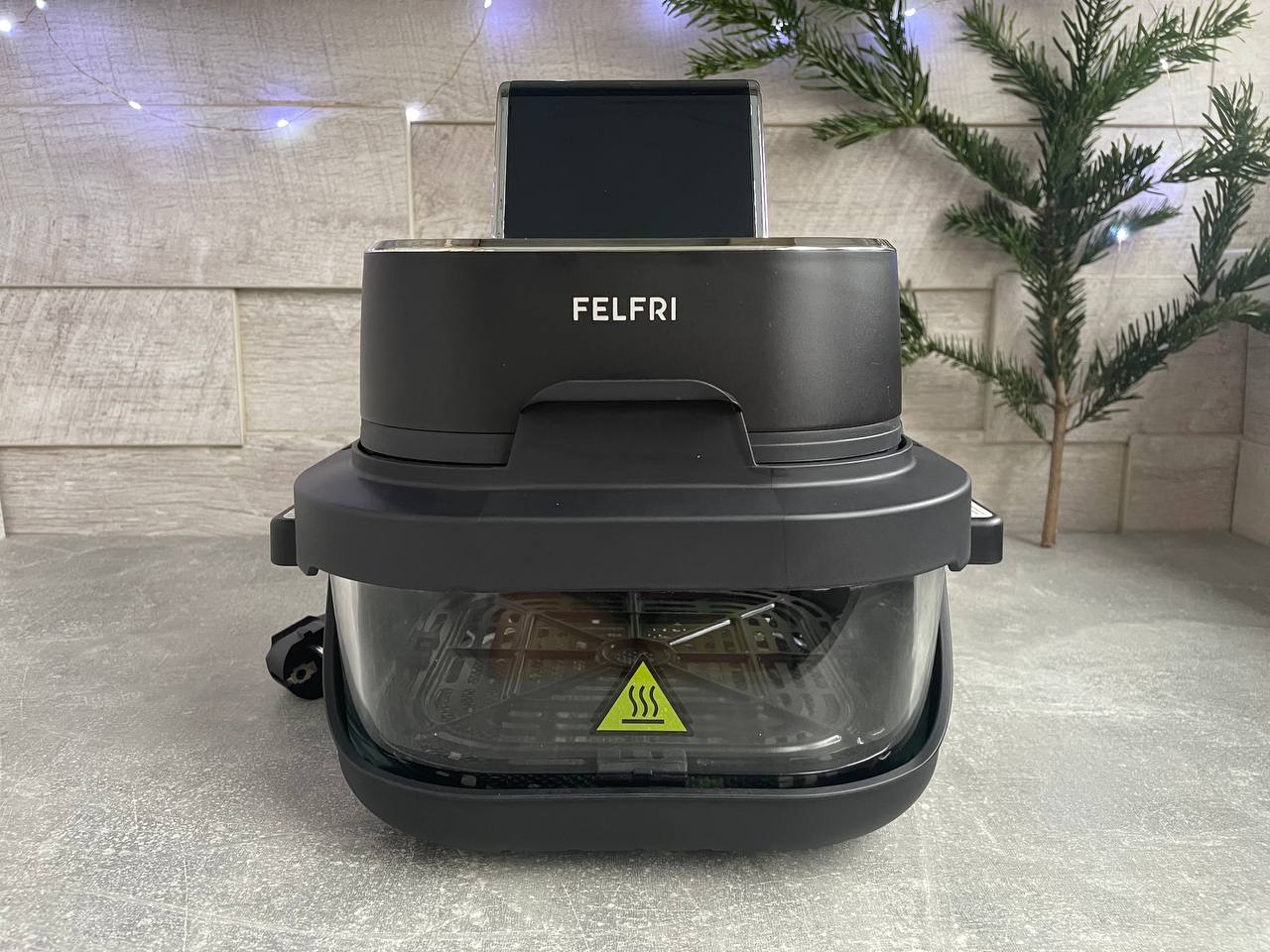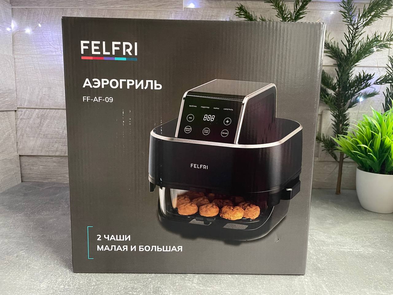 Аэрогриль Felfri приехал в двойной упаковке. Первая коробка для перевозки, вторая фирменная черная с яркими принтами. На коробке сразу видно, какими функциями и преимуществами обладает модель. Внутри каждый элемент надежно зафиксирован пенопластом и упакован в отдельный пакет. Приятный бонус — отсутствие того самого «заводского» химического запаха.