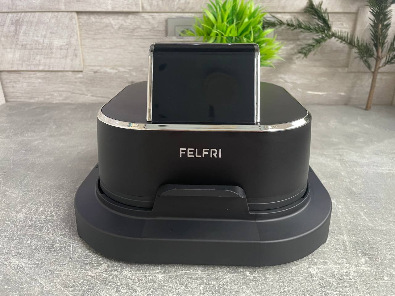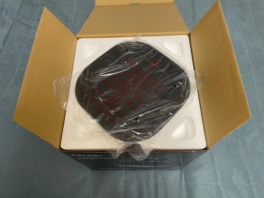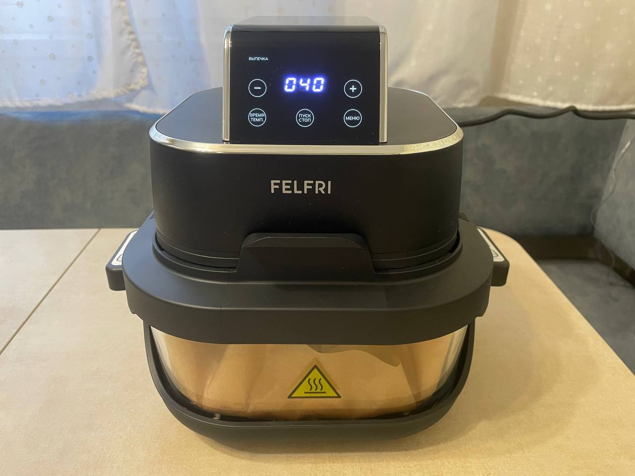 Аэрогриль Felfri приехал в двойной упаковке. Первая коробка для перевозки, вторая фирменная черная с яркими принтами. На коробке сразу видно, какими функциями и преимуществами обладает модель. Внутри каждый элемент надежно зафиксирован пенопластом и упакован в отдельный пакет. Приятный бонус — отсутствие того самого «заводского» химического запаха.