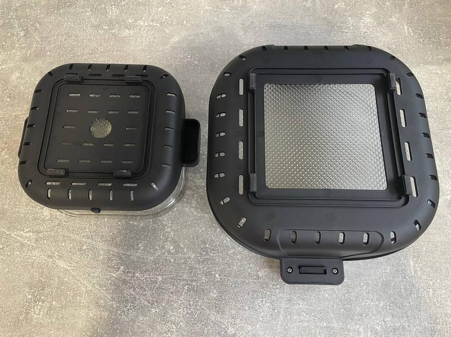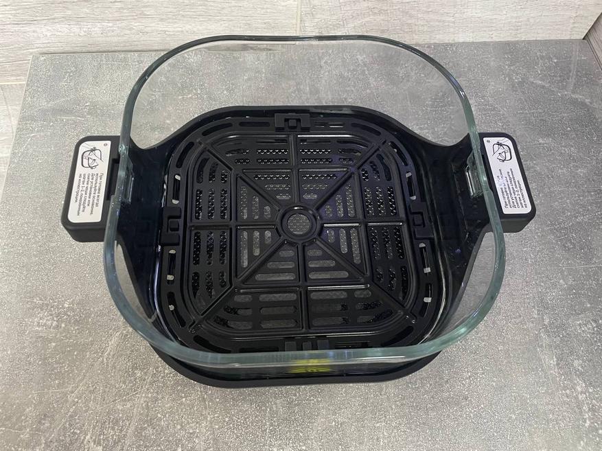 Аэрогриль выполнен в черном цвете со стеклянными чашами. Верхняя часть состоит из панели управления и нагревательного модуля. На панели управления мы видим небольшой дисплей, меню режимов, уменьшение и увеличение времени/температуры, переключение между временем и температурой, кнопка пуск/стоп и выбор режимов. Нагревательный модуль мы закрепляем на крышку для адаптера.