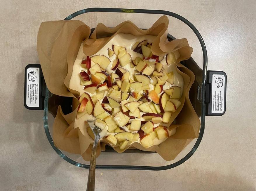 Тесто не сухое, похоже на густую сметану в готовом виде, и сочное из-за яблок. Сами яблоки мягкие, чувствуется их кислинка. Всё вместе — в меру сладко, очень по-домашнему. К чаю — то что надо.