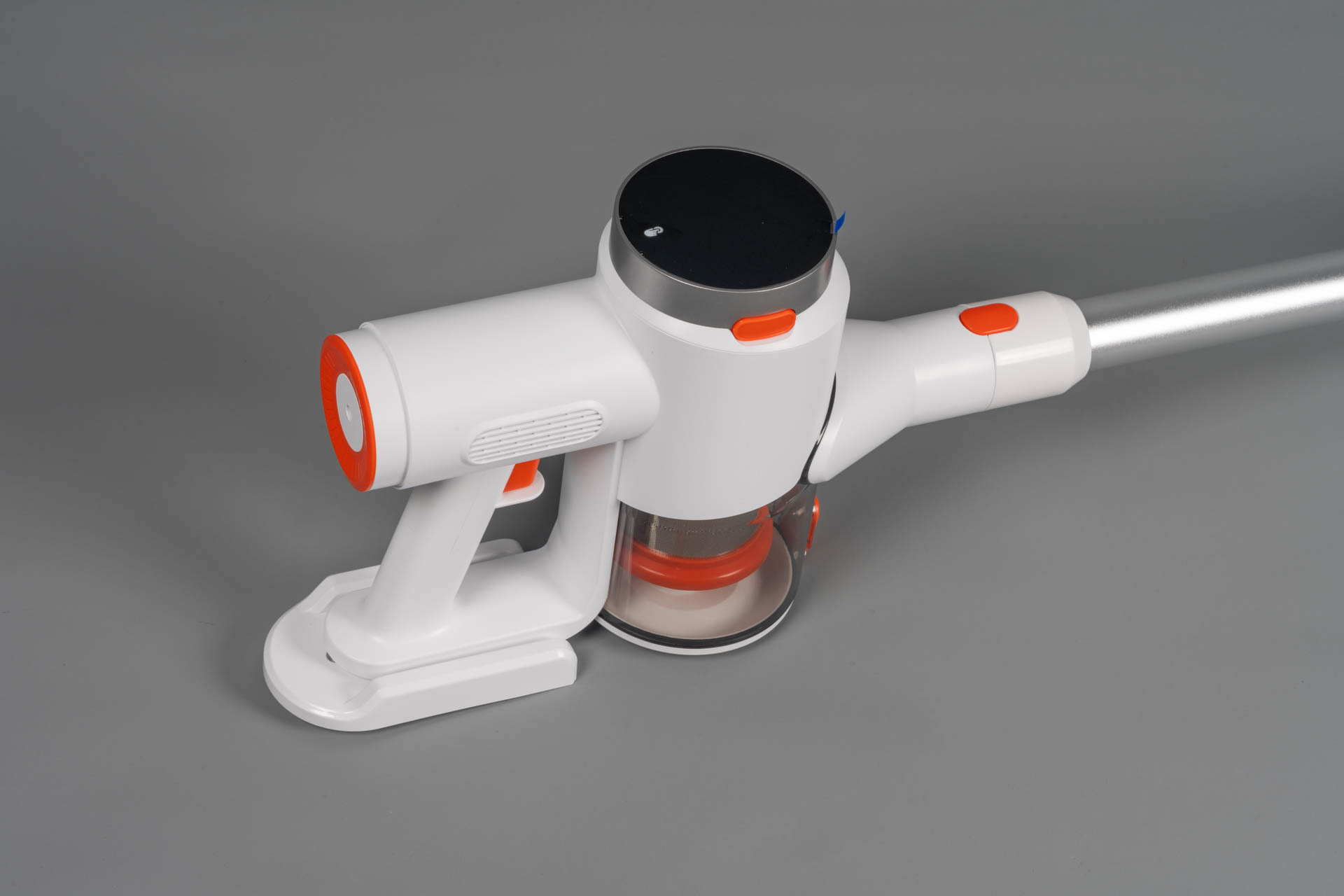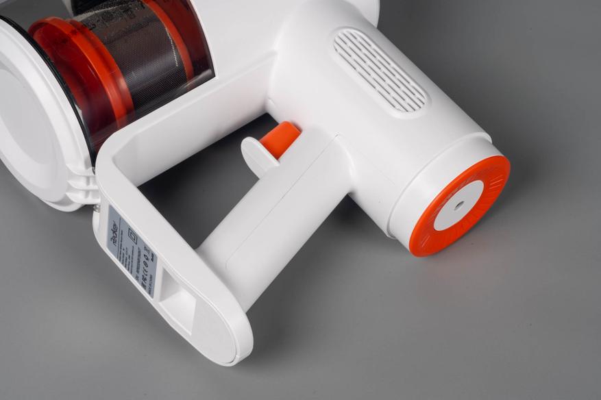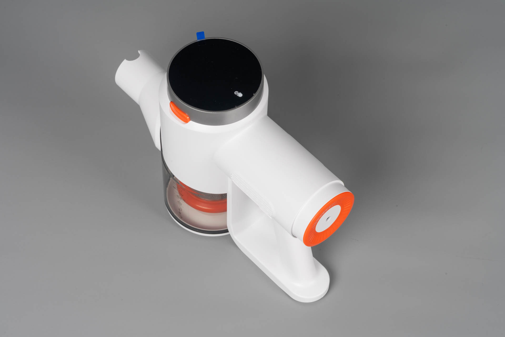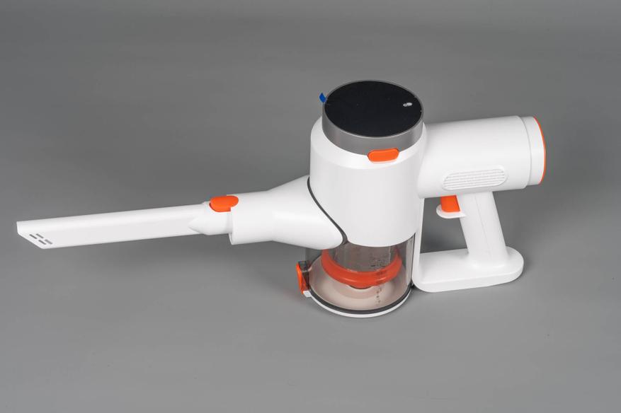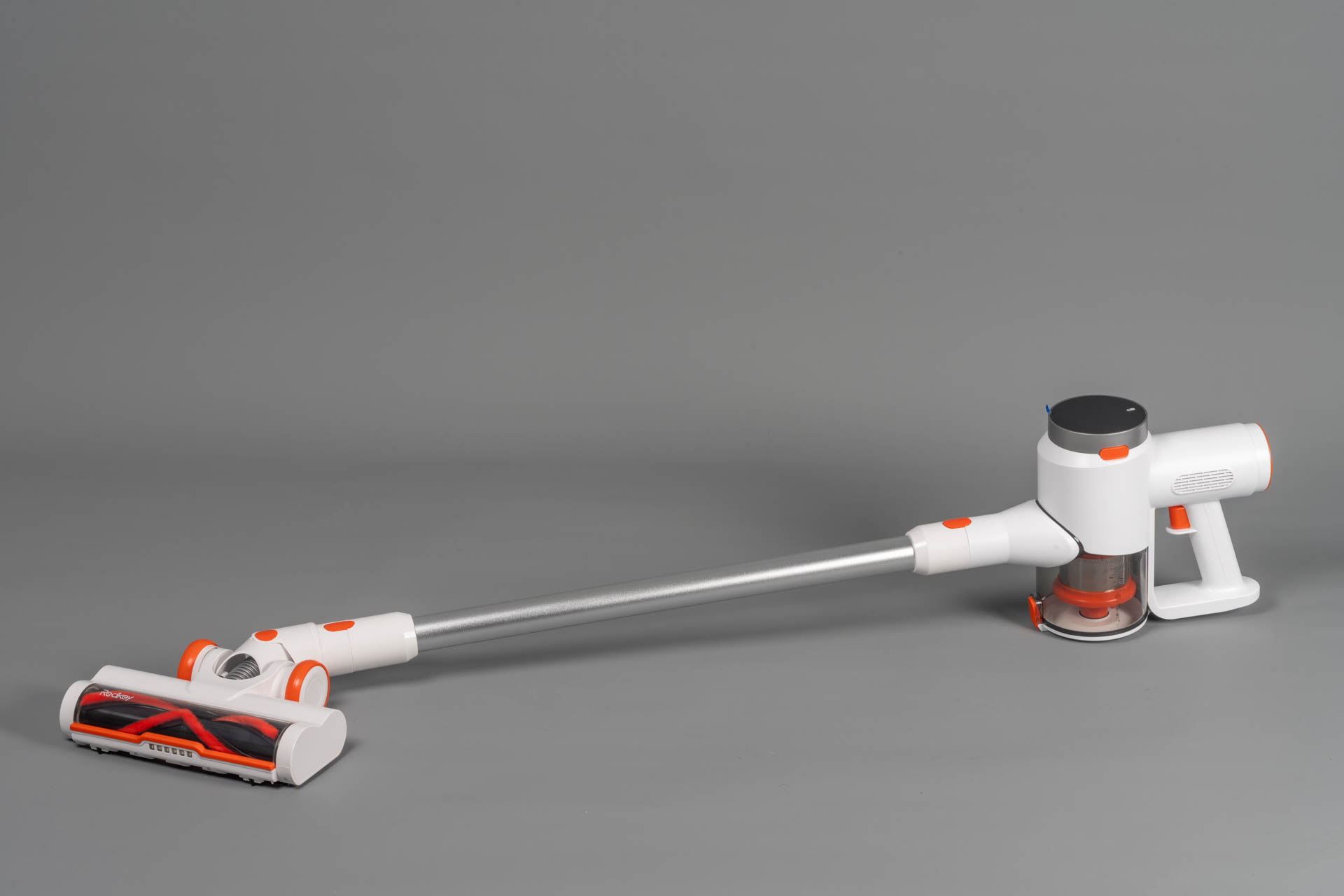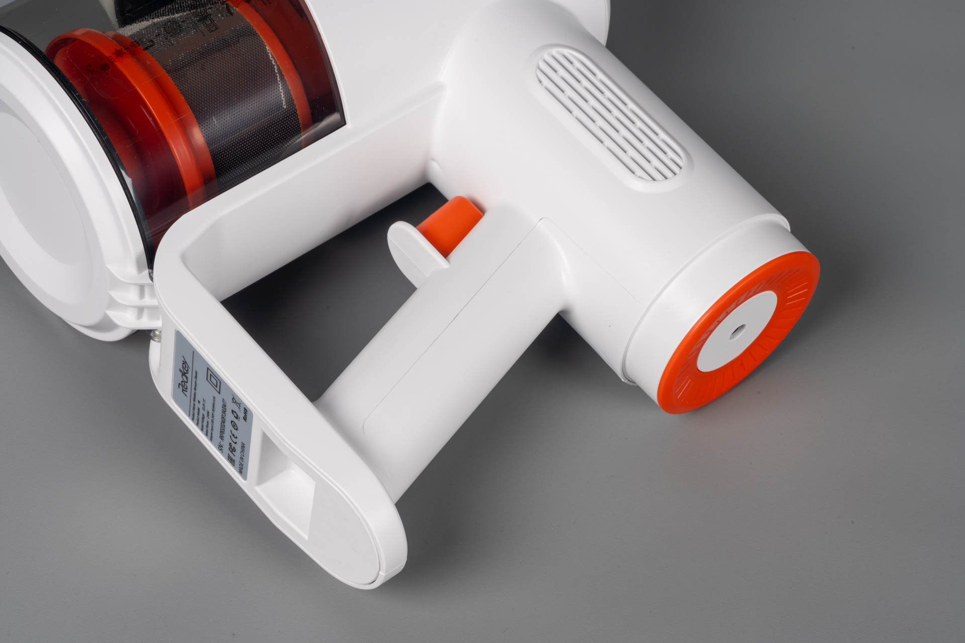 Аккумуляторный пылесос Redkey P8 отличается лаконичным бело-оранжевым дизайном.