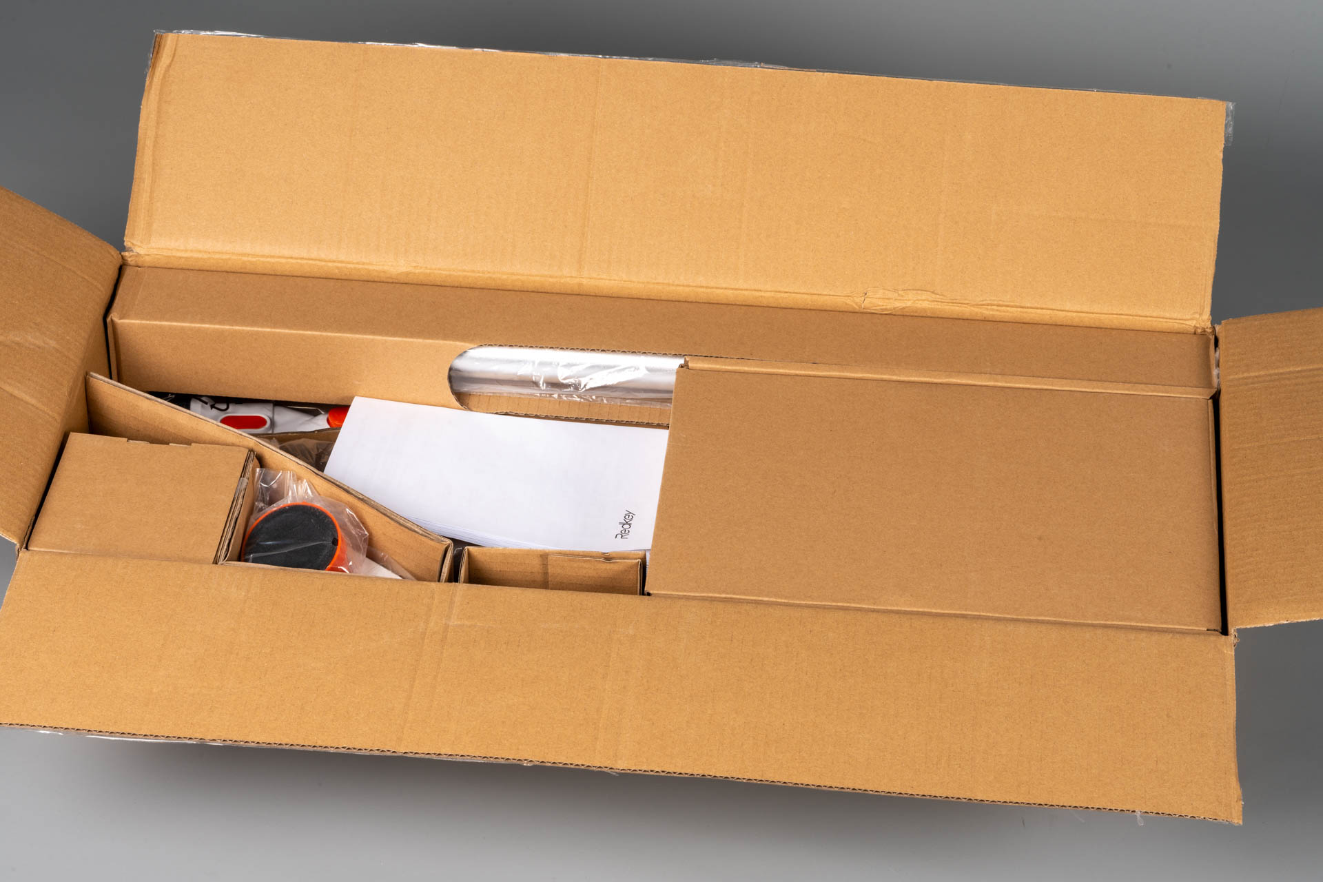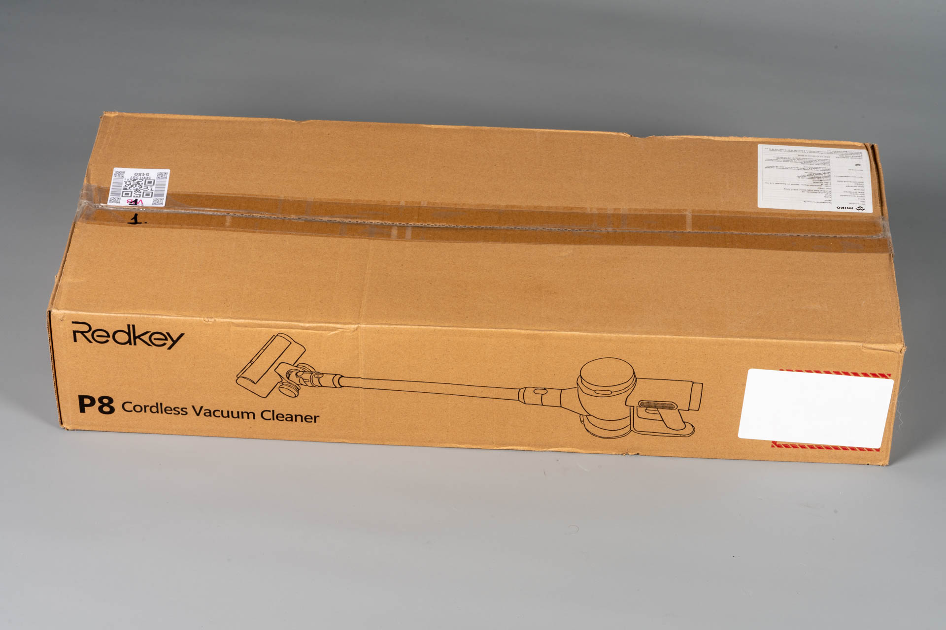 Упаковка P8 представляет собой коричневую картонную коробку с изображением пылесоса и логотипом Redkey на боковинах. При вскрытии коробки обнаруживается, что пылесос и все аксессуары индивидуально упакованы в защитные полиэтиленовые пакеты и дополнительно закреплены картонными элементами.