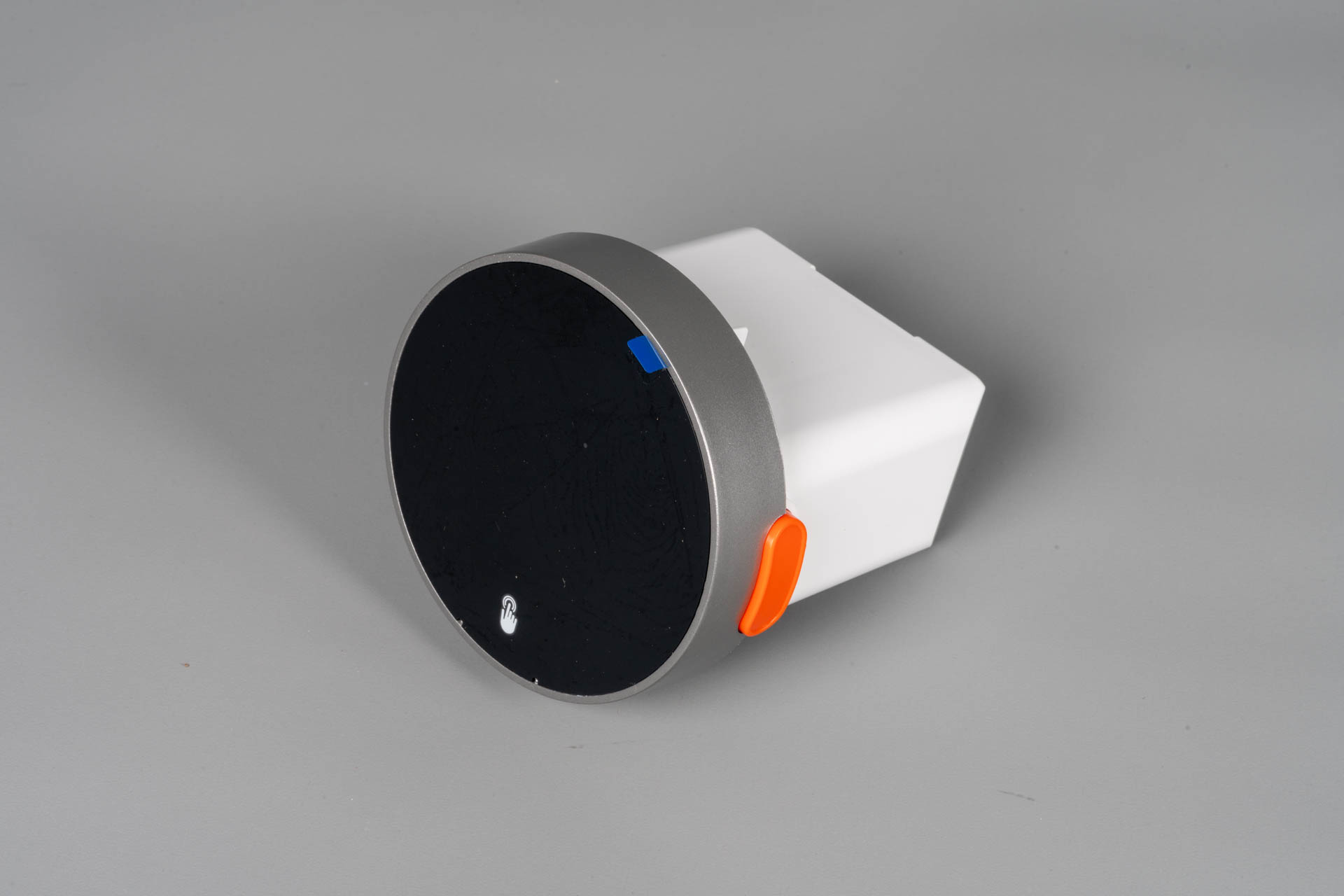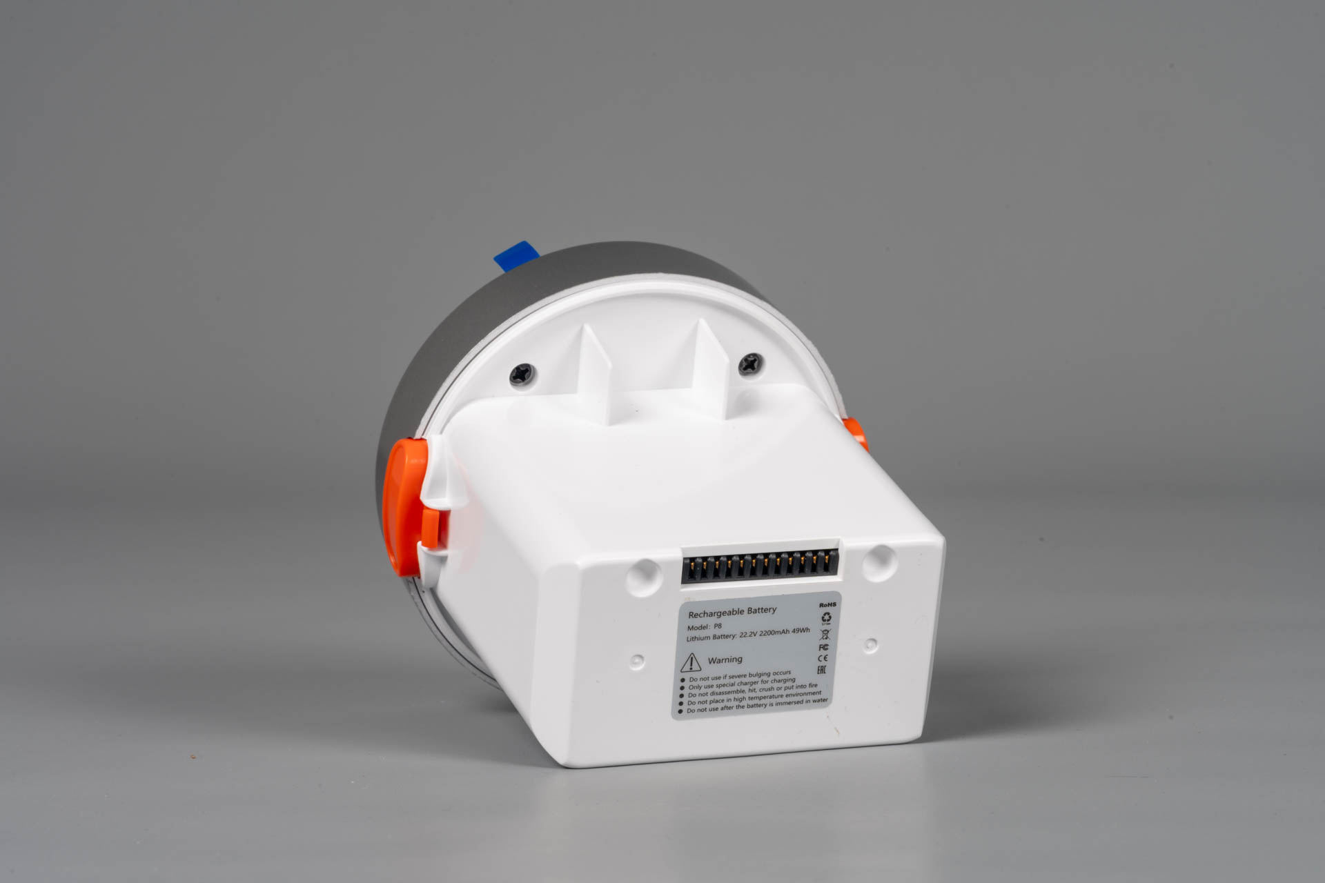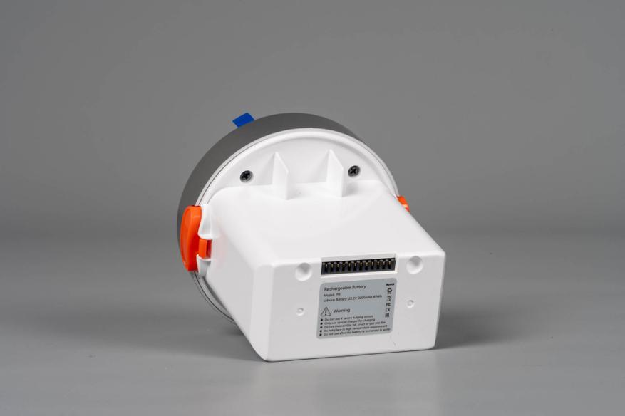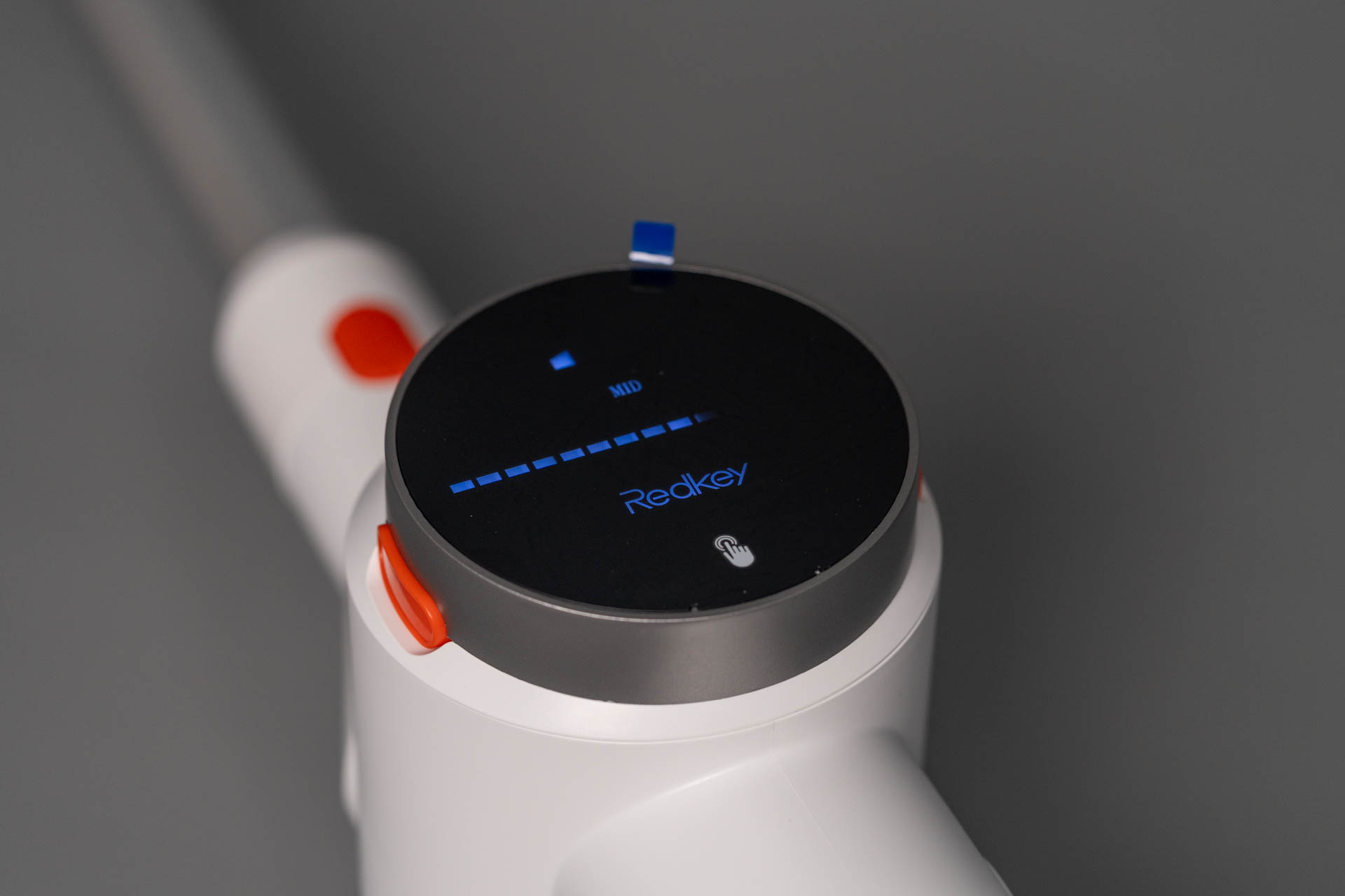 На аккумуляторном блоке расположен крупный черный дисплей с синей LED-индикацией, отображающей заряд батареи, режим мощности (низкий/средний/макс.) и состояние щетки. Режимы переключаются касанием экрана. Блок фиксируется защелками и снимается лишь для обслуживания или замены.
