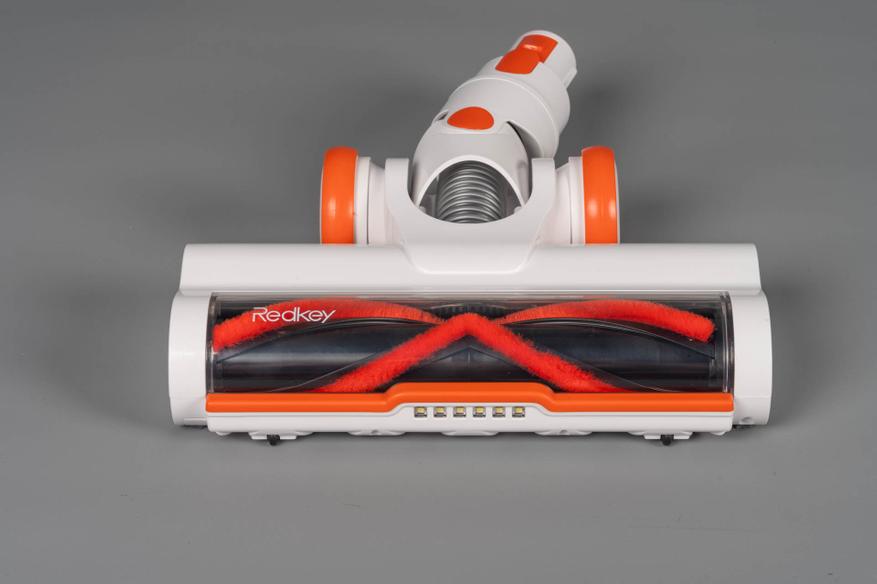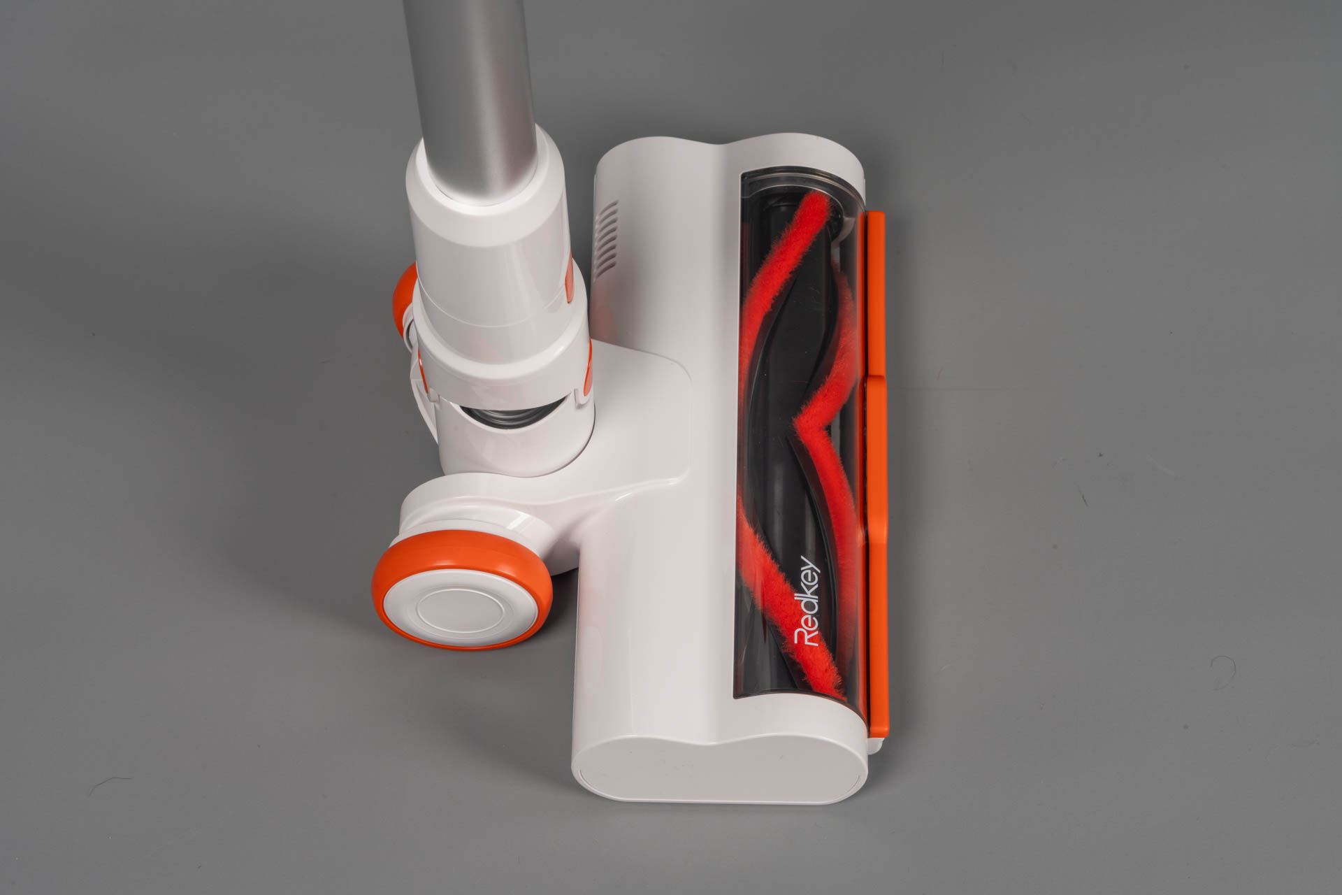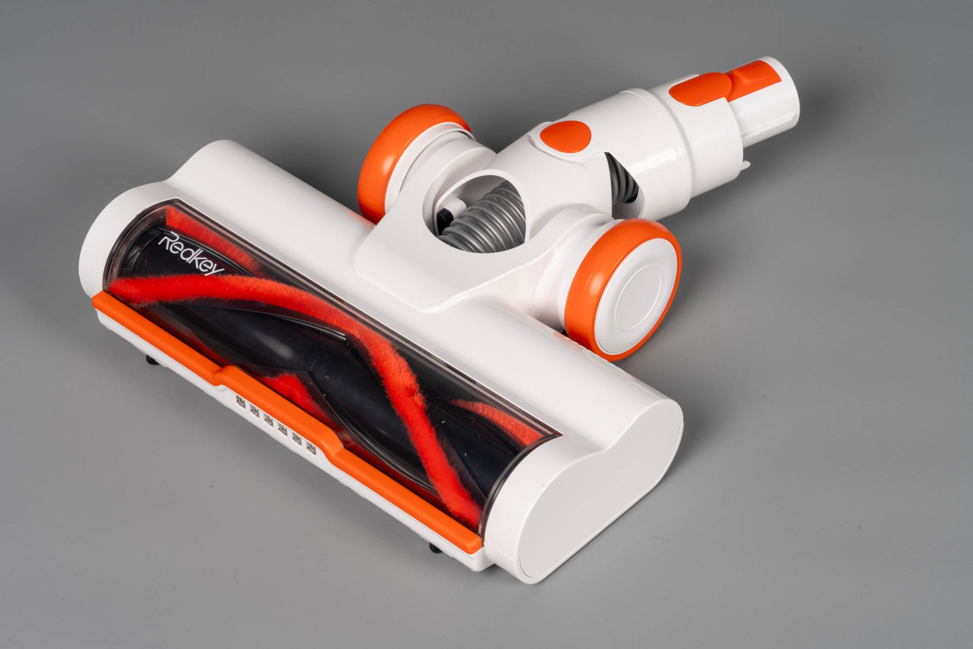 Турбощетка, входящая в комплект Redkey P8, является основной насадкой для очистки напольных покрытий. Ее фронтальная часть оснащена прорезиненным амортизатором со встроенной подсветкой, улучшающей видимость загрязнений в условиях слабой освещенности. Для повышения маневренности на задней стороне корпуса интегрированы поворотное шарнирное крепление и система прорезиненных роликов, обеспечивающих плавное перемещение по поверхностям. Рабочий механизм включает массивный щеточный валик с V-образным расположением щетины, оптимизированный для эффективного захвата мусора.