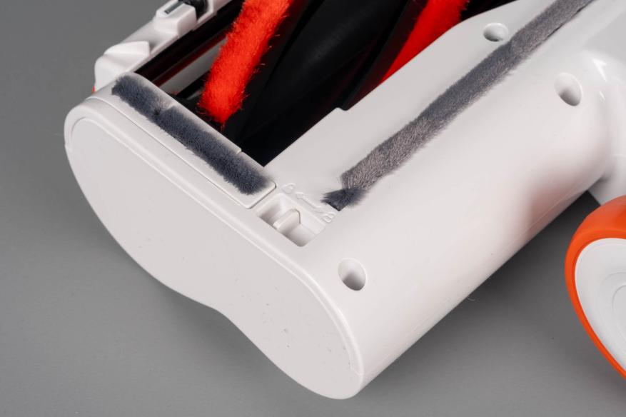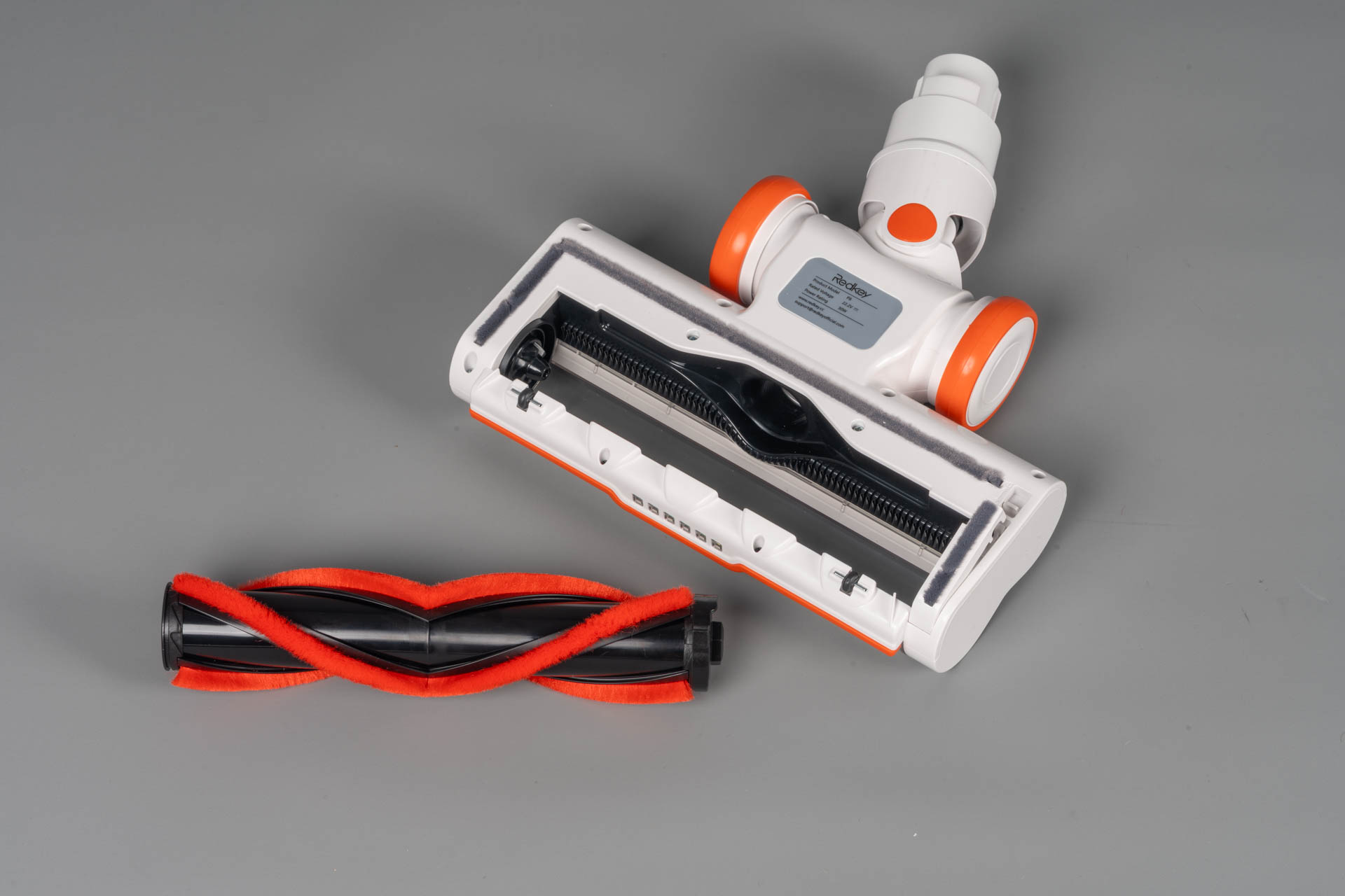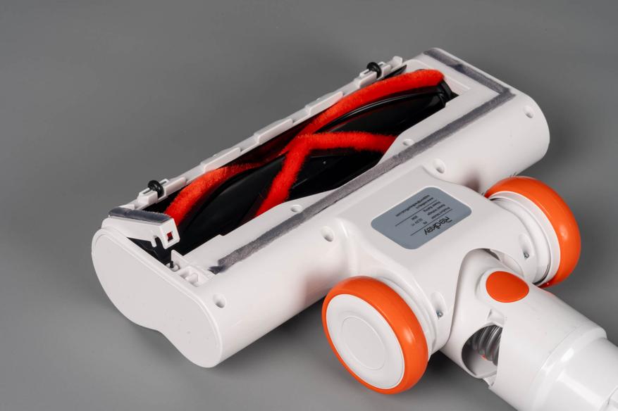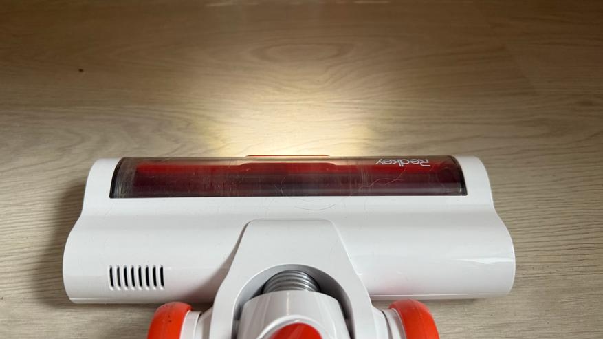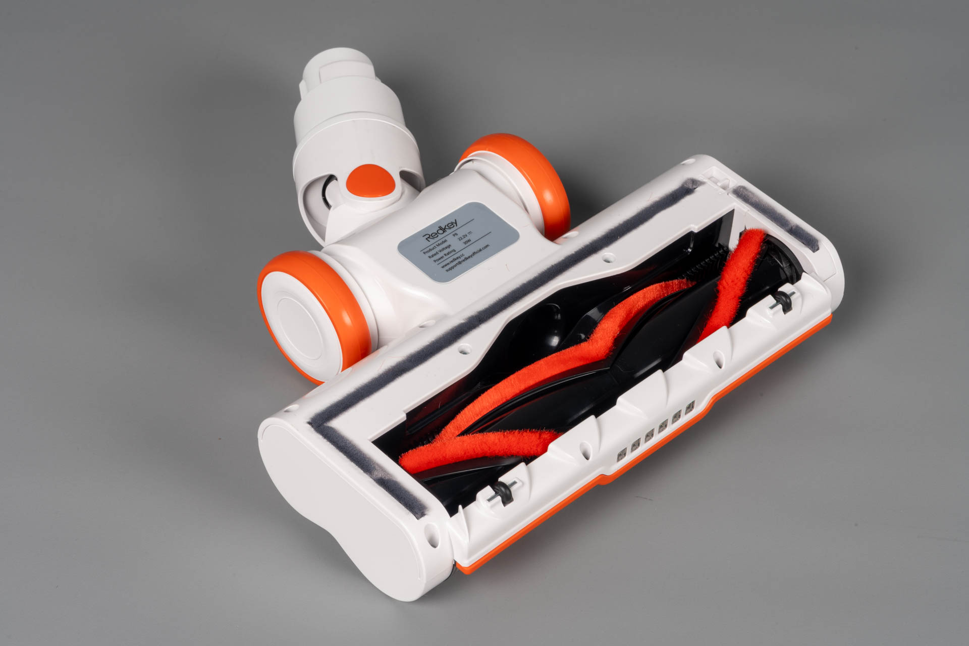 Турбощетка, входящая в комплект Redkey P8, является основной насадкой для очистки напольных покрытий. Ее фронтальная часть оснащена прорезиненным амортизатором со встроенной подсветкой, улучшающей видимость загрязнений в условиях слабой освещенности. Для повышения маневренности на задней стороне корпуса интегрированы поворотное шарнирное крепление и система прорезиненных роликов, обеспечивающих плавное перемещение по поверхностям. Рабочий механизм включает массивный щеточный валик с V-образным расположением щетины, оптимизированный для эффективного захвата мусора.