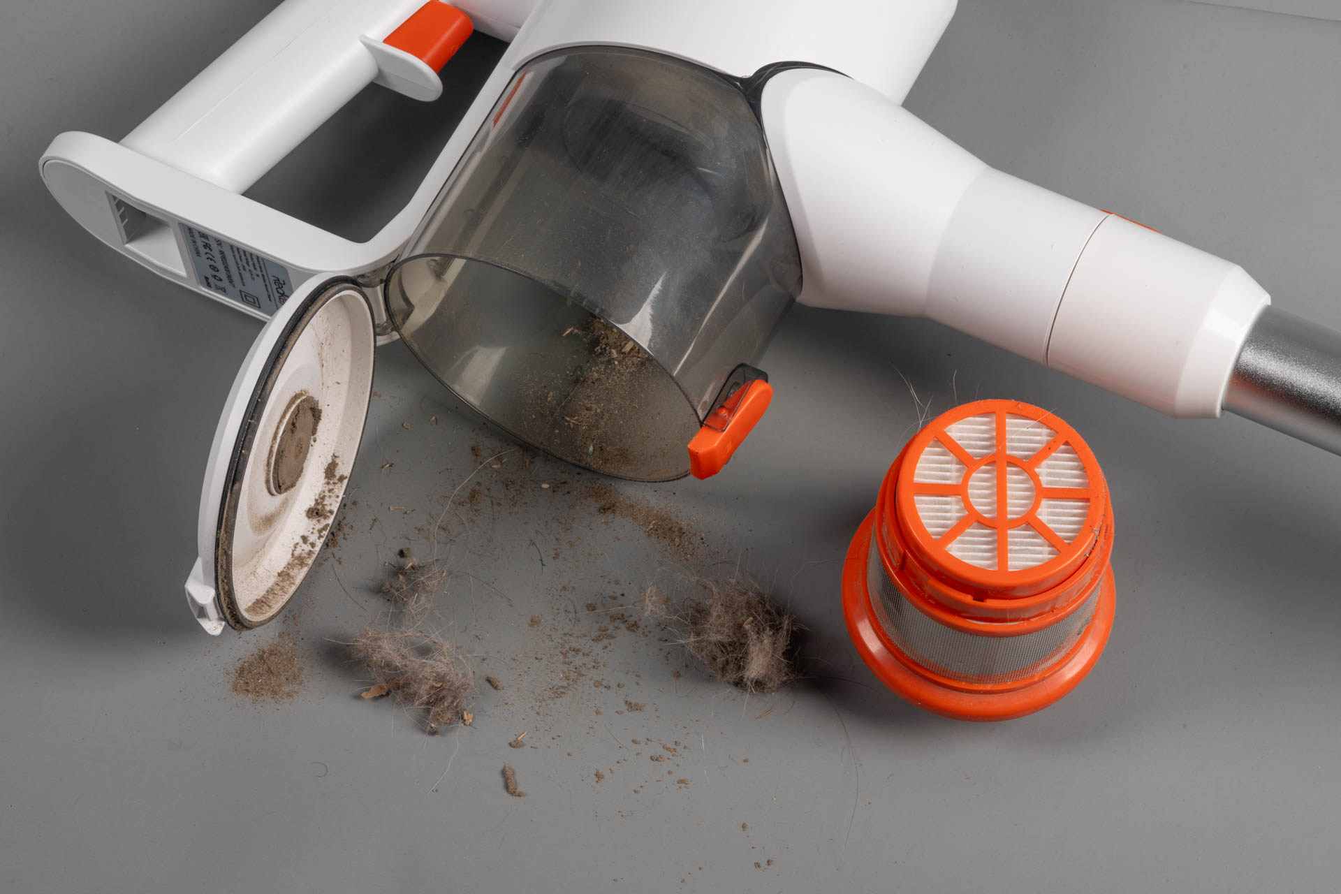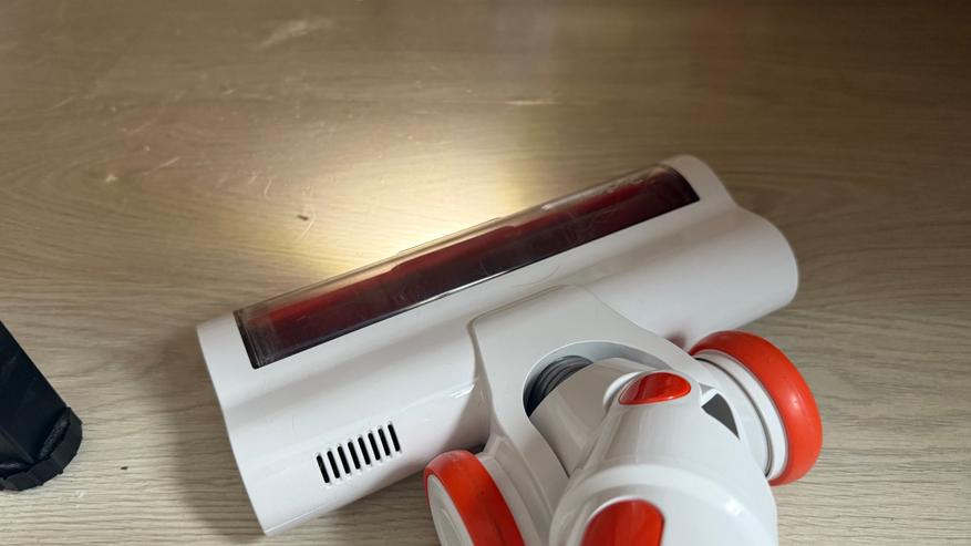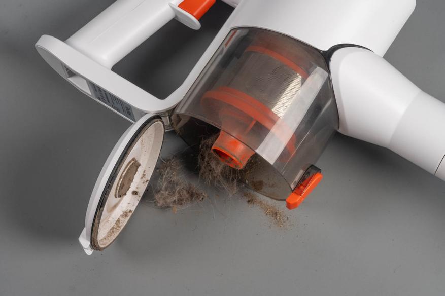 Несмотря на кажущуюся чистоту, Redkey P8 собрал значительный объем грязи, включая пыль, частицы мусора и шерсть питомцев. Конструкция пылесборника предусматривает простое опустошение путем откидывания крышки через нажатие кнопки. Крупные фрагменты мусора выпадают под действием гравитации, мелкие — удаляются легким встряхиванием контейнера. Съемный металлический фильтр (предназначенный для улавливания крупных частиц) демонтируется поворотным движением, очищается вручную и возвращается на место.