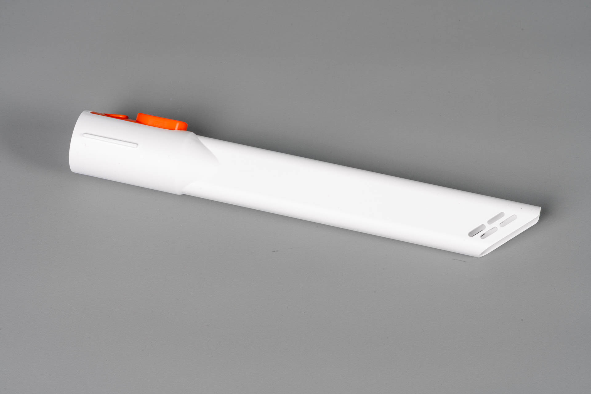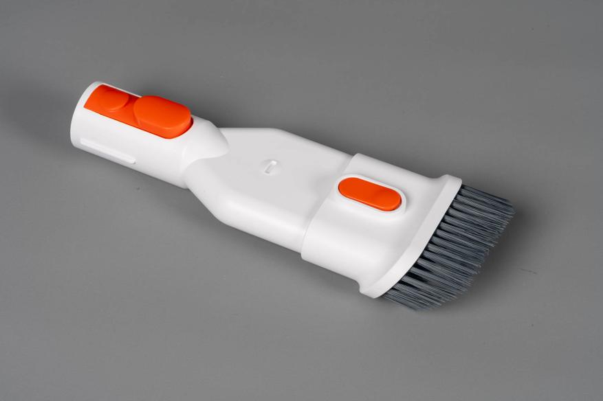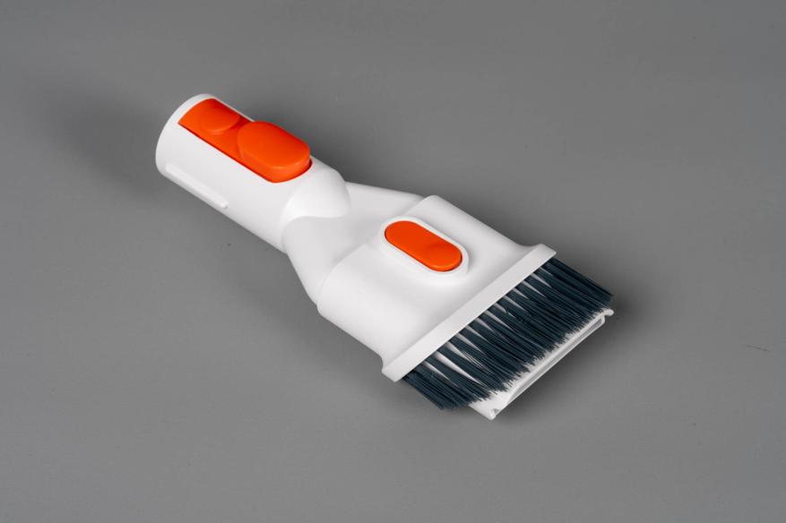 Насадка 2-в-1 предназначена для деликатной очистки поверхностей, требующих особого подхода: текстильной мебели, автокресел и электроники (включая межклавишные пространства клавиатуры без демонтажа клавиш). Ее двойной режим работы реализуется через сдвижной механизм: в базовом положении активируется всасывание, при выдвижении элемента — функция всасывания с последующим забором мусора.