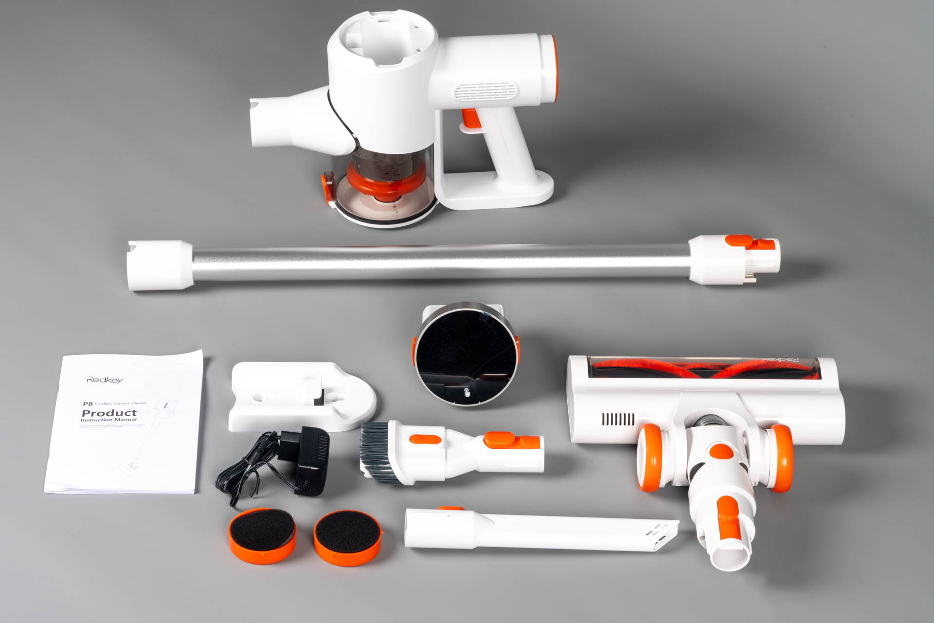 В комплект беспроводного пылесоса Redkey P8 входят: основной блок, турбощетка, щелевая насадка, насадка 2в1 для деликатных поверхностей и металлическая телескопическая трубка. Для удобства хранения предусмотрен настенный кронштейн с комплектом крепежа. Питание обеспечивает аккумулятор увеличенной емкости, оснащенный дисплеем. Система фильтрации представлена двумя дополнительными HEPA фильтрами. Комплектация дополнена сетевым адаптером и руководством пользователя.
