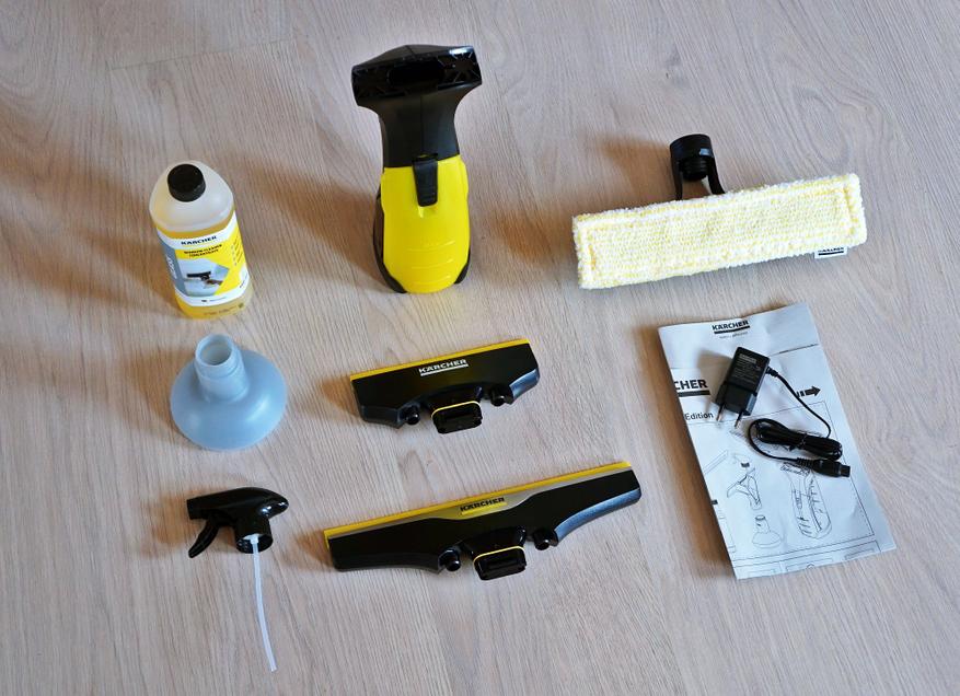 Кроме коробки, данный набор имеет и некоторые другие особенности, отличающие его от базовой комплектации стеклоочистителя Kärcher WV 2. Во-первых это цвет: корпус самого устройства изготовлен из черного пластика, тогда как в стандартном исполнении он полностью желтый; во-вторых, широкая всасывающая насадка имеет металлизированную накладку с профилированным логотипом, вместо простой надписи краской и, в-третьих, в данный набор входит флакон фирменной жидкости для мытья окон (объем 500мл). В целом получается весьма неплохой и полезный подарок с претензией на премиальность :) Кроме озвученных элементов, в набор входят: пульверизатор с микроволоконной мягкой насадкой, узкая всасывающая насадка, зарядное устройство и инструкция.