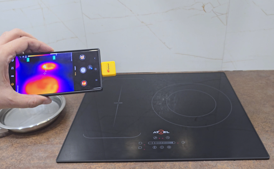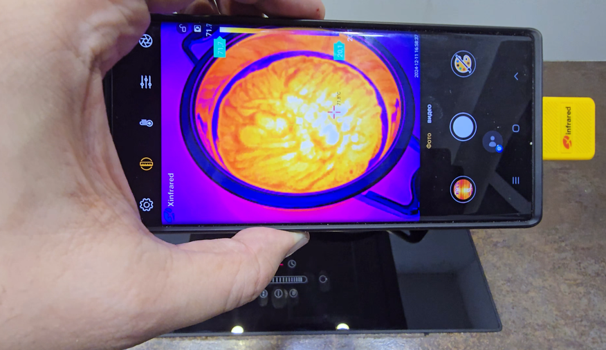 Для проверки стабильности температуры был использован тепловизор. При установке минимальной мощности температура оставалась постоянной без циклического включения/выключения конфорки, что подтверждает заявленную функцию непрерывного индукционного нагрева. Это актуально для приготовления соусов и блюд, требующих длительного равномерного нагрева.