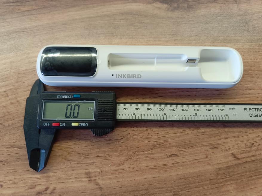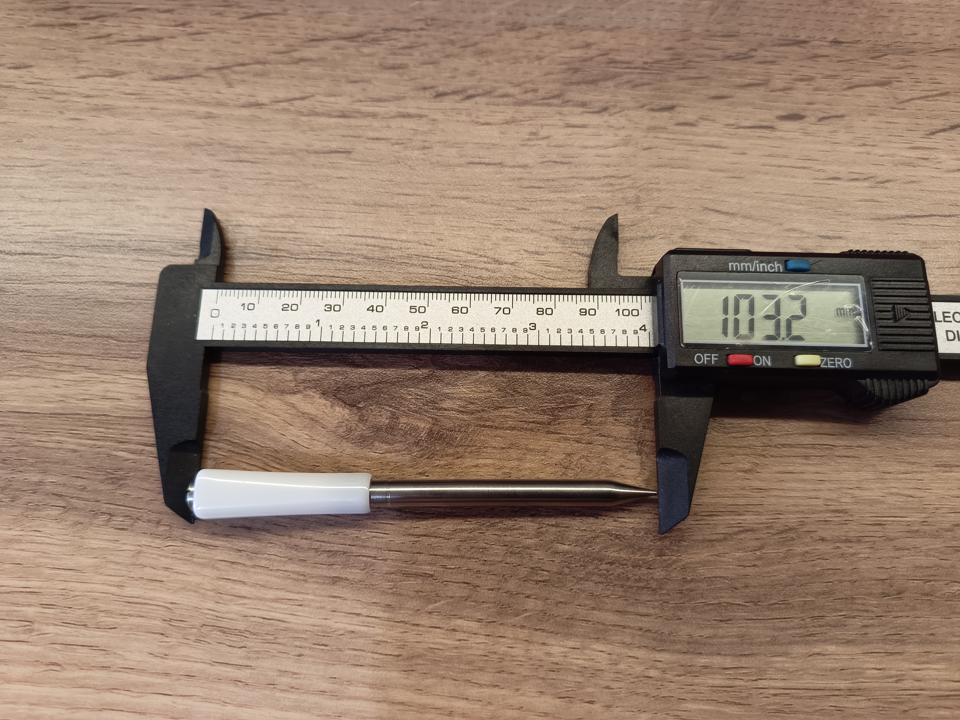 Общая длина щупа составляет 10 см, из которых рабочая часть для измерения продукта — 6 см, а диаметр — 6 мм.