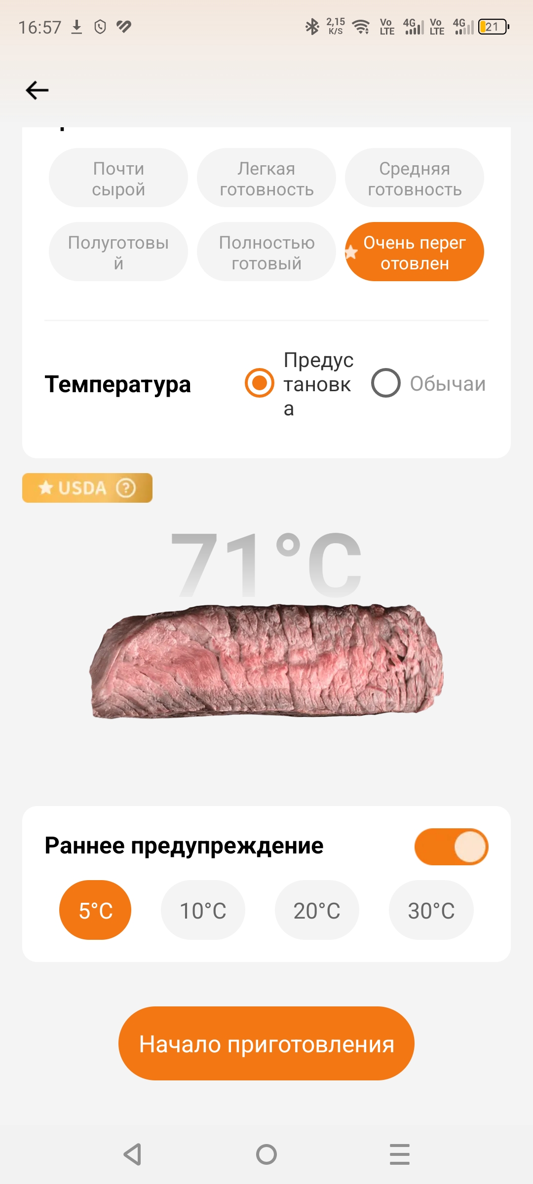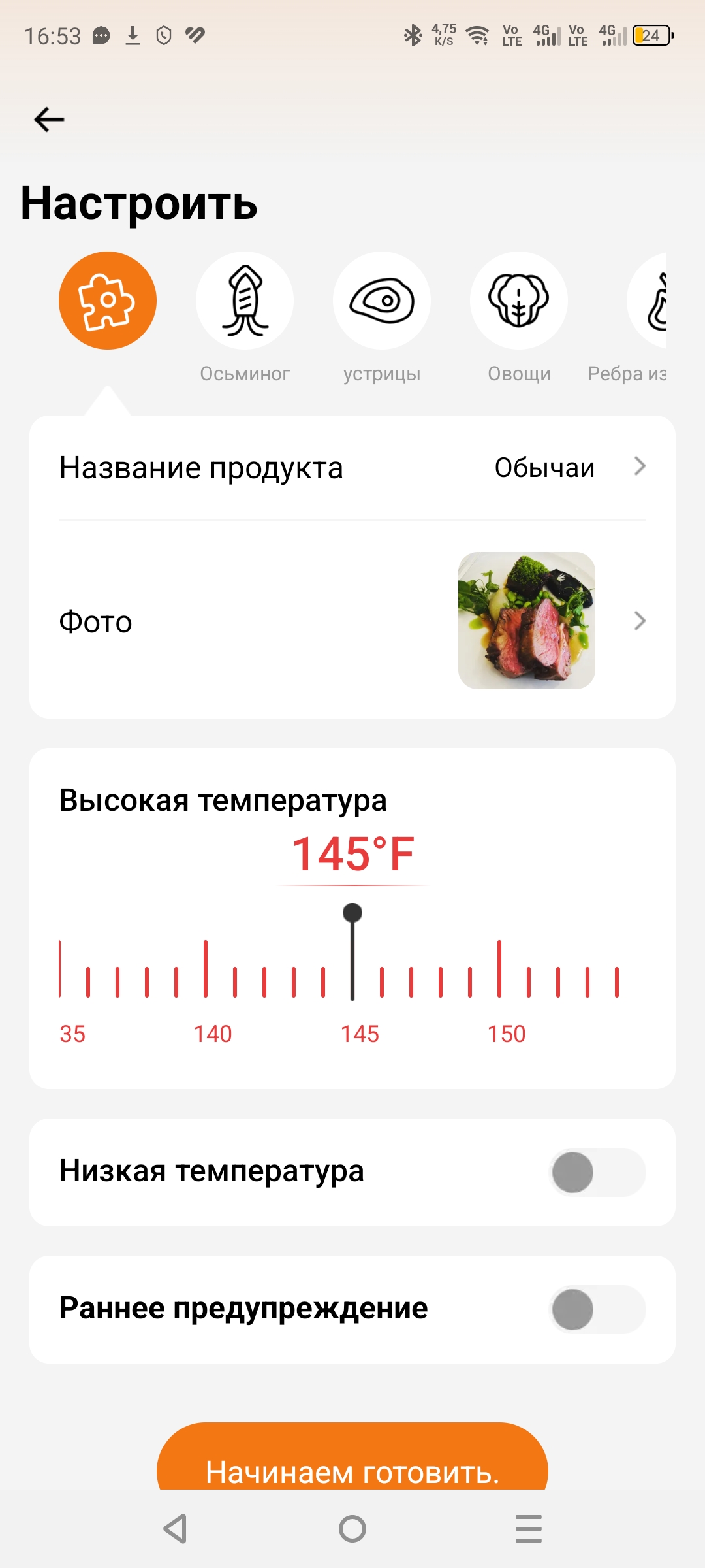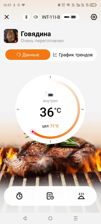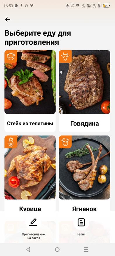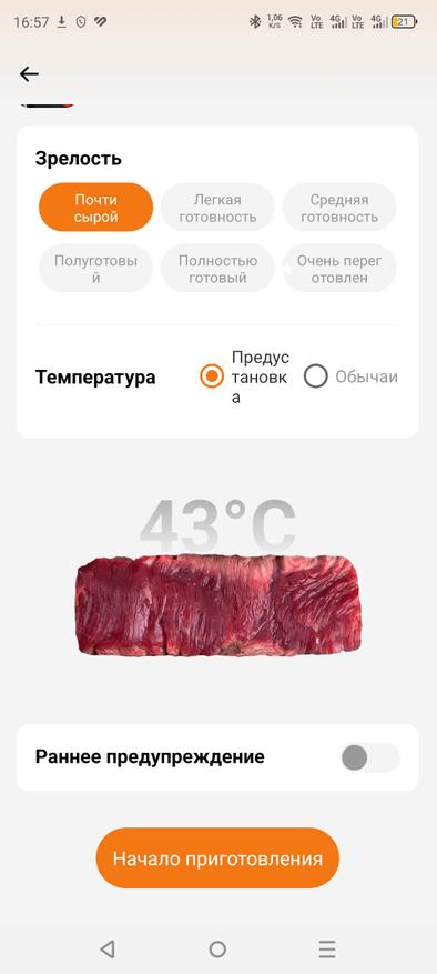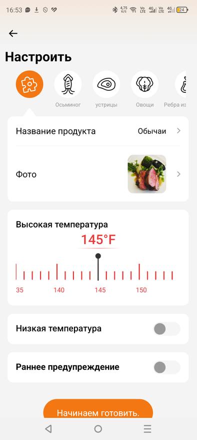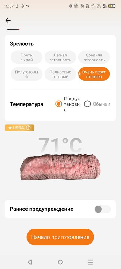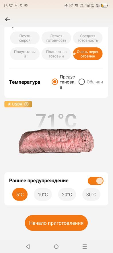 Приложение удобно в использовании и полностью на русском языке, что безусловно является большим плюсом. Всё интуитивно понятно, а также доступно множество различных режимов готовки: курица, говядина, свинина. Вы выбираете режим, задаёте нужную температуру в зависимости от того, насколько прожаренным хотите видеть мясо, и термометр за пару градусов до достижения указанной температуры вас предупредит.