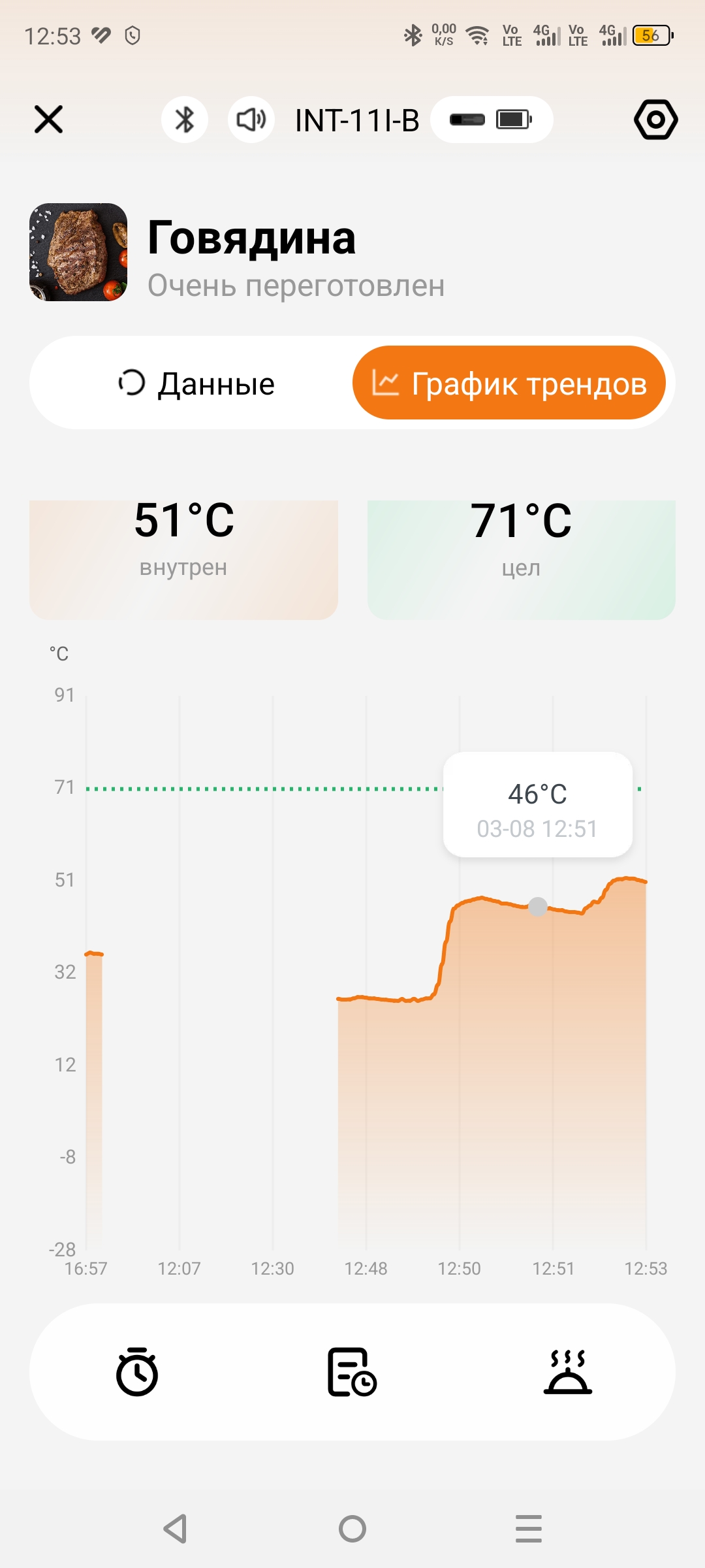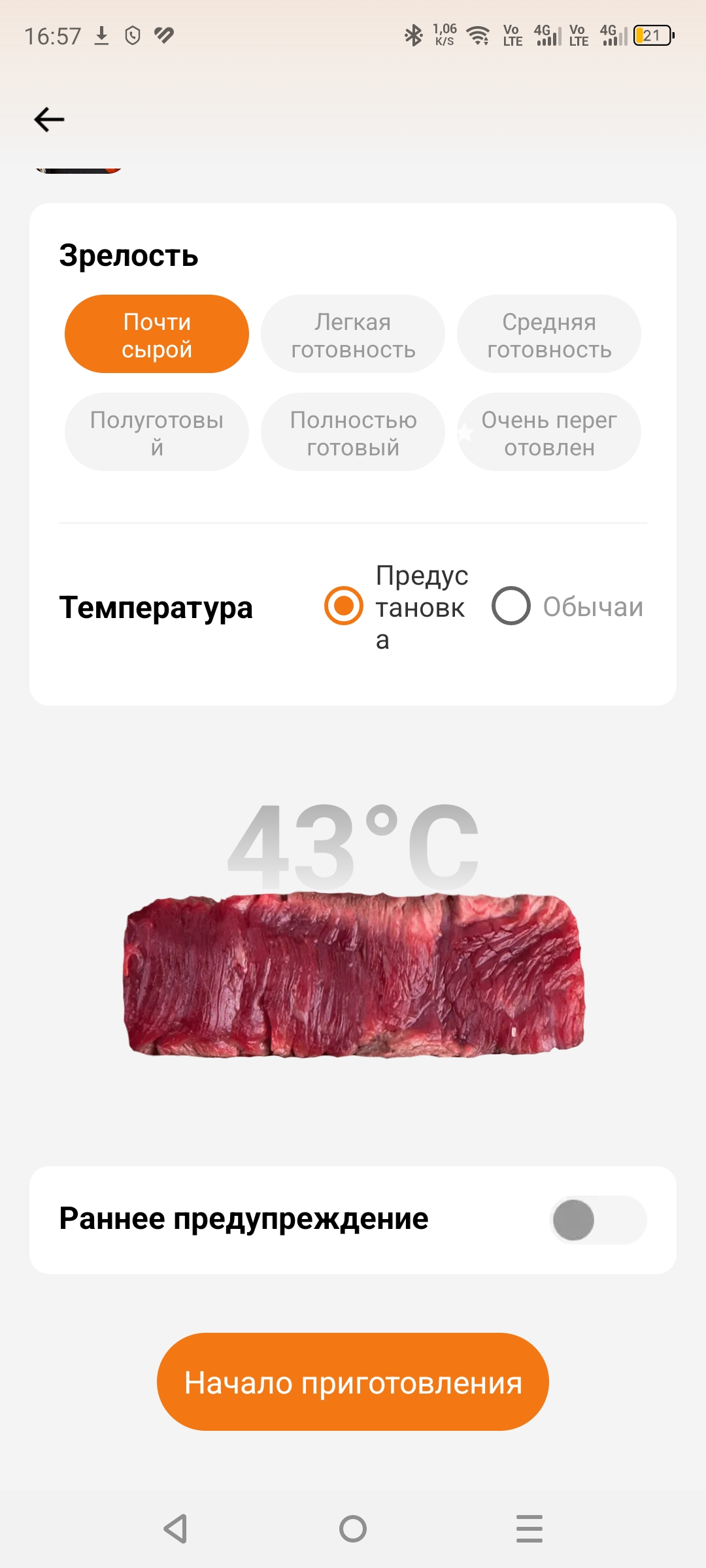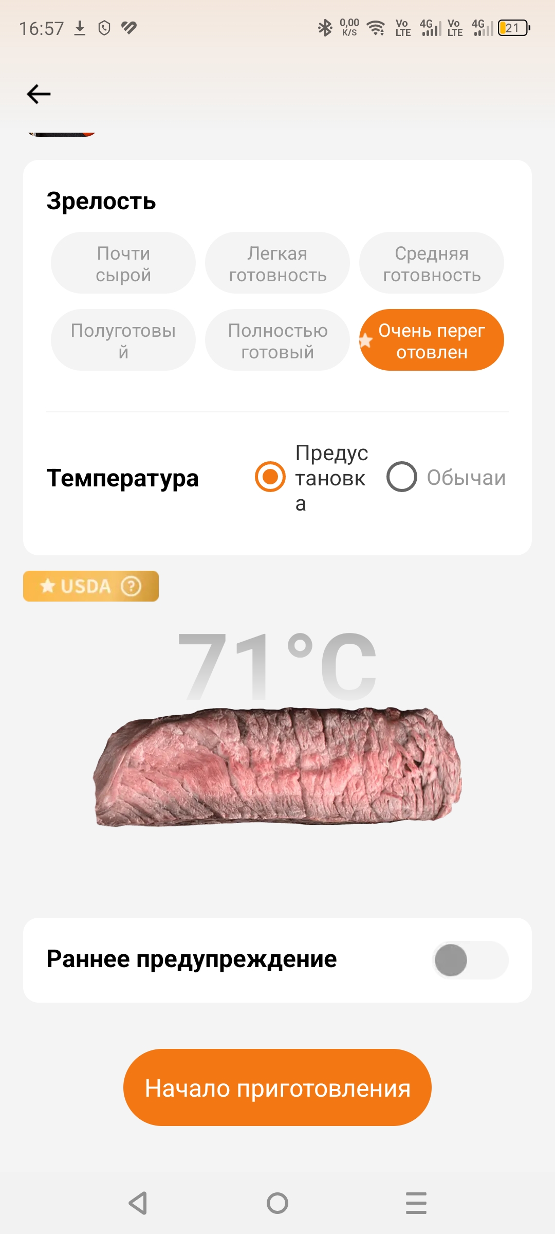 Приложение удобно в использовании и полностью на русском языке, что безусловно является большим плюсом. Всё интуитивно понятно, а также доступно множество различных режимов готовки: курица, говядина, свинина. Вы выбираете режим, задаёте нужную температуру в зависимости от того, насколько прожаренным хотите видеть мясо, и термометр за пару градусов до достижения указанной температуры вас предупредит.