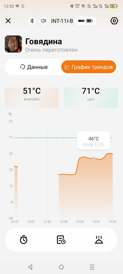 В настройках приложения можно выбрать шкалу измерения — Цельсий или Фаренгейт, а также настроить активное время дисплея. Кроме того, во время готовки термометр отслеживает, как изменялась температура продукта, что позволяет видеть весь процесс в динамике.