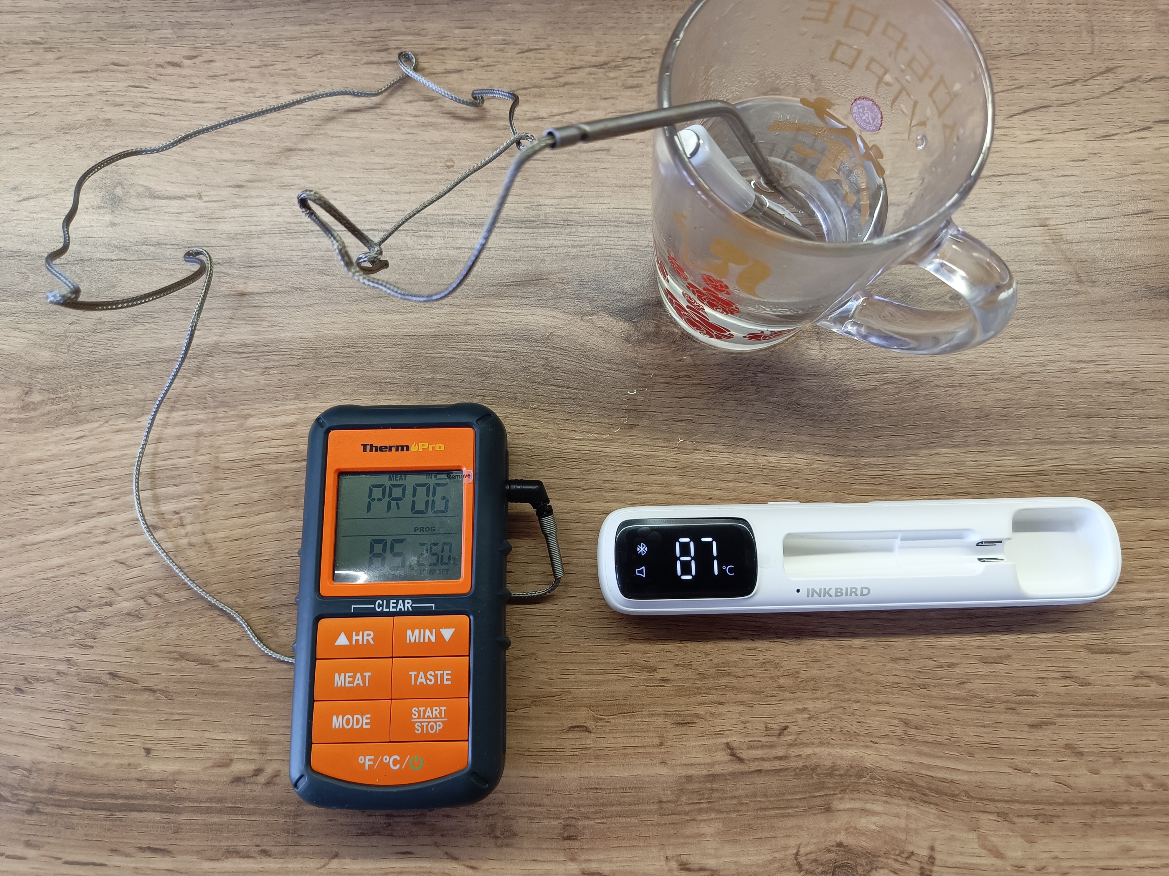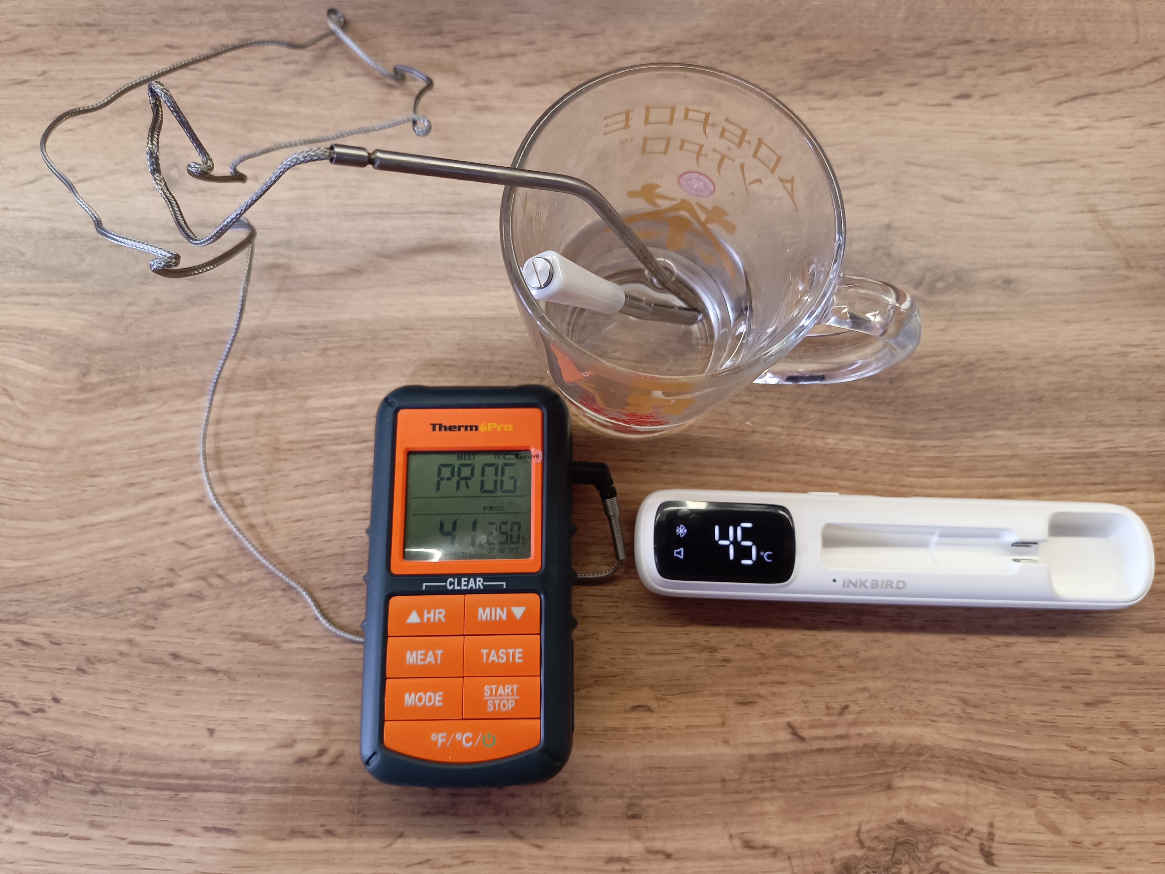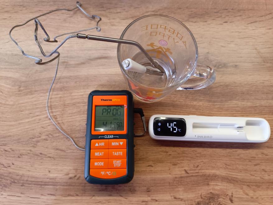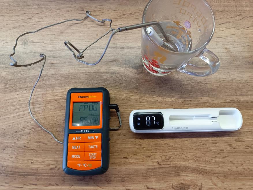 Ну, а теперь к самому интересному — как щуп ведёт себя в реальной жизни. У меня есть другой кухонный термометр, проверенный на тестовом стенде, с точностью которого я доверяю на все 100%.
