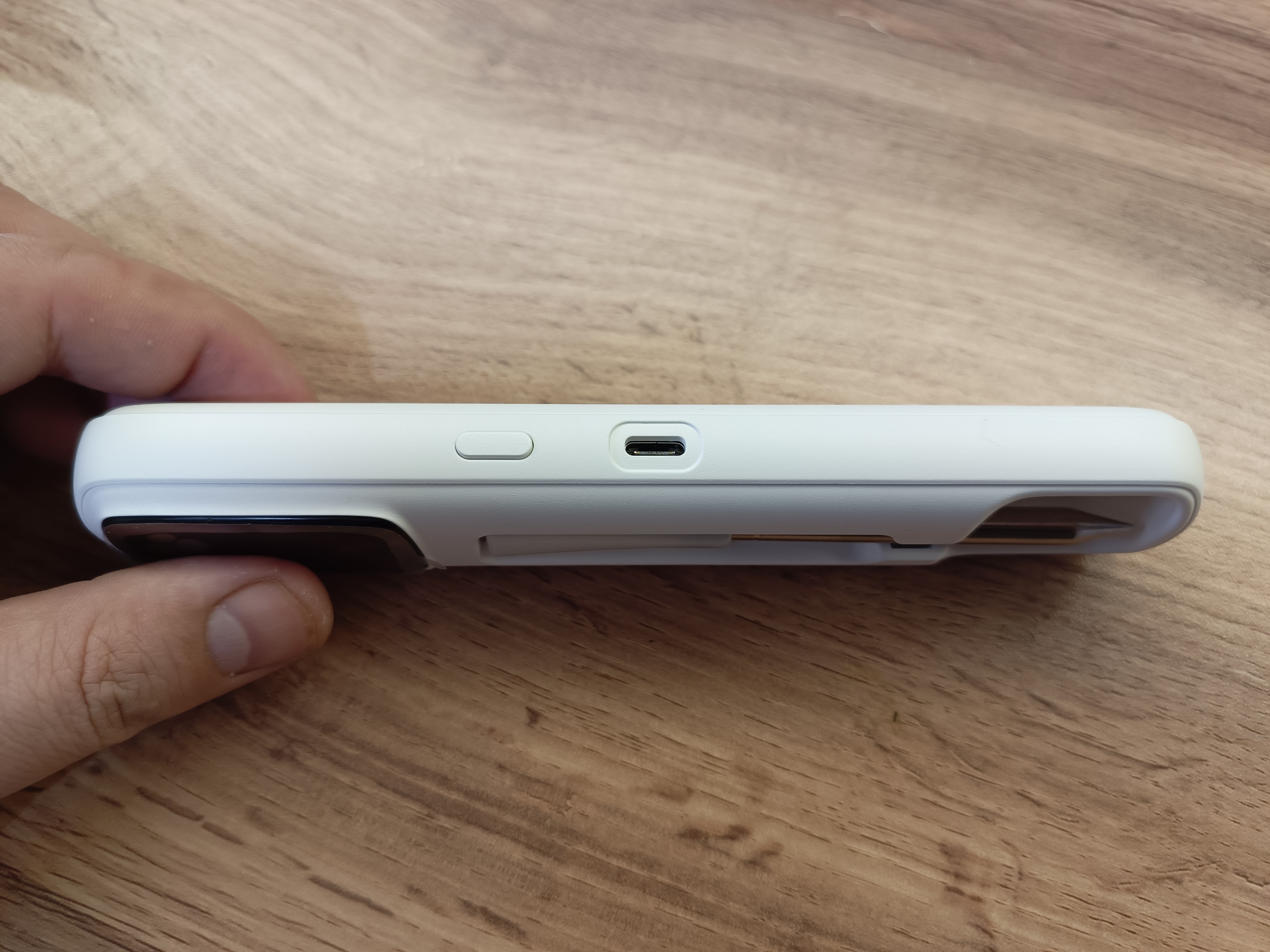 Пластиковый корпус термометра выполнен в белом цвете и обеспечивает открытый доступ к самому термощупу. С боковой стороны расположена кнопка включения и выключения, которая также активирует дисплей. Рядом установлен разъём Type-C для зарядки. Устройство заряжается очень быстро — всего 25 минут, чего хватает примерно на 25 часов непрерывных измерений.