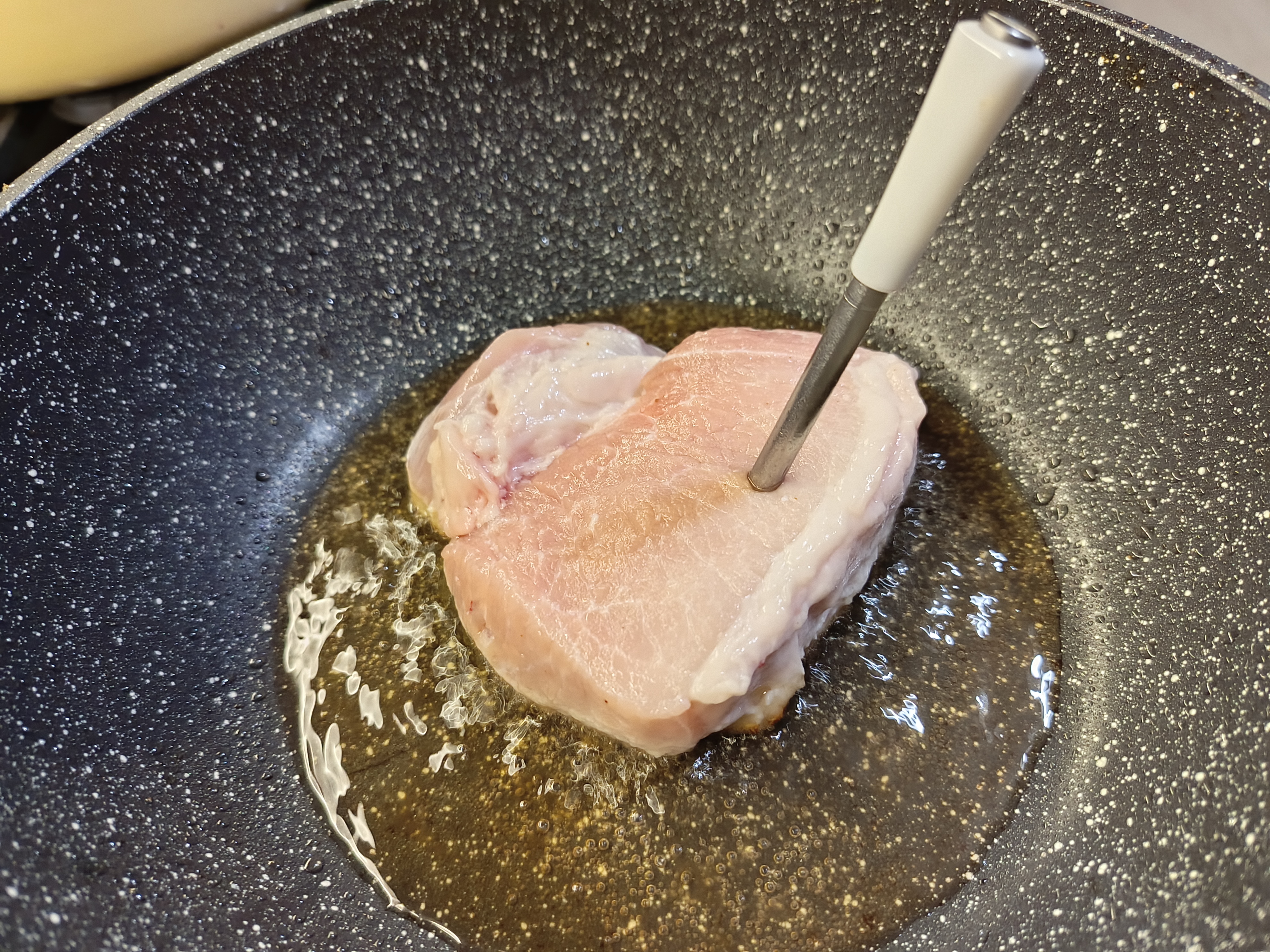 Также я пробовал готовить ветчину в пресс-форме. Там отверстие под щуп оказалось немного узким, и мне пришлось его аккуратно рассверлить, чтобы щуп вошёл.
