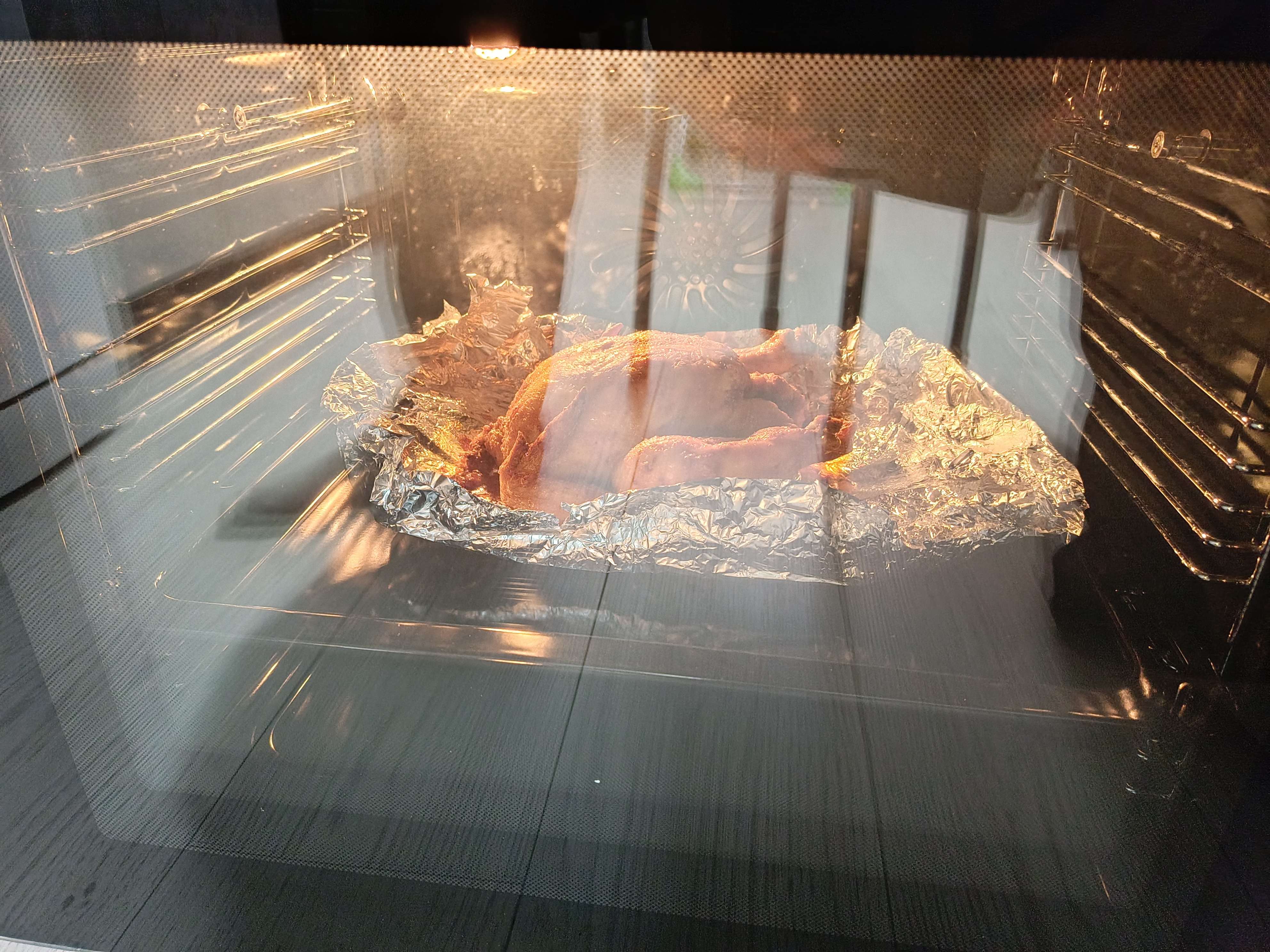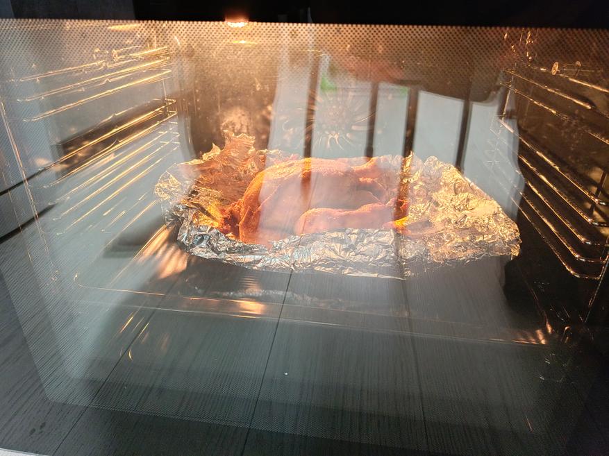 В духовке я готовил курицу, размещая щуп в центре грудинки, так как это самая толстая часть. Если грудинка готова, значит, вся курица достигла нужной температуры. Никогда точно не знаешь, сколько времени потребуется, чтобы приготовить курицу и при этом не пересушить её. Я установил термометр и поставил таймер с небольшим запасом. Как только в центре грудинки температура достигла 65 °C, духовку я выключил. При этом готовка шла при 170 °C.