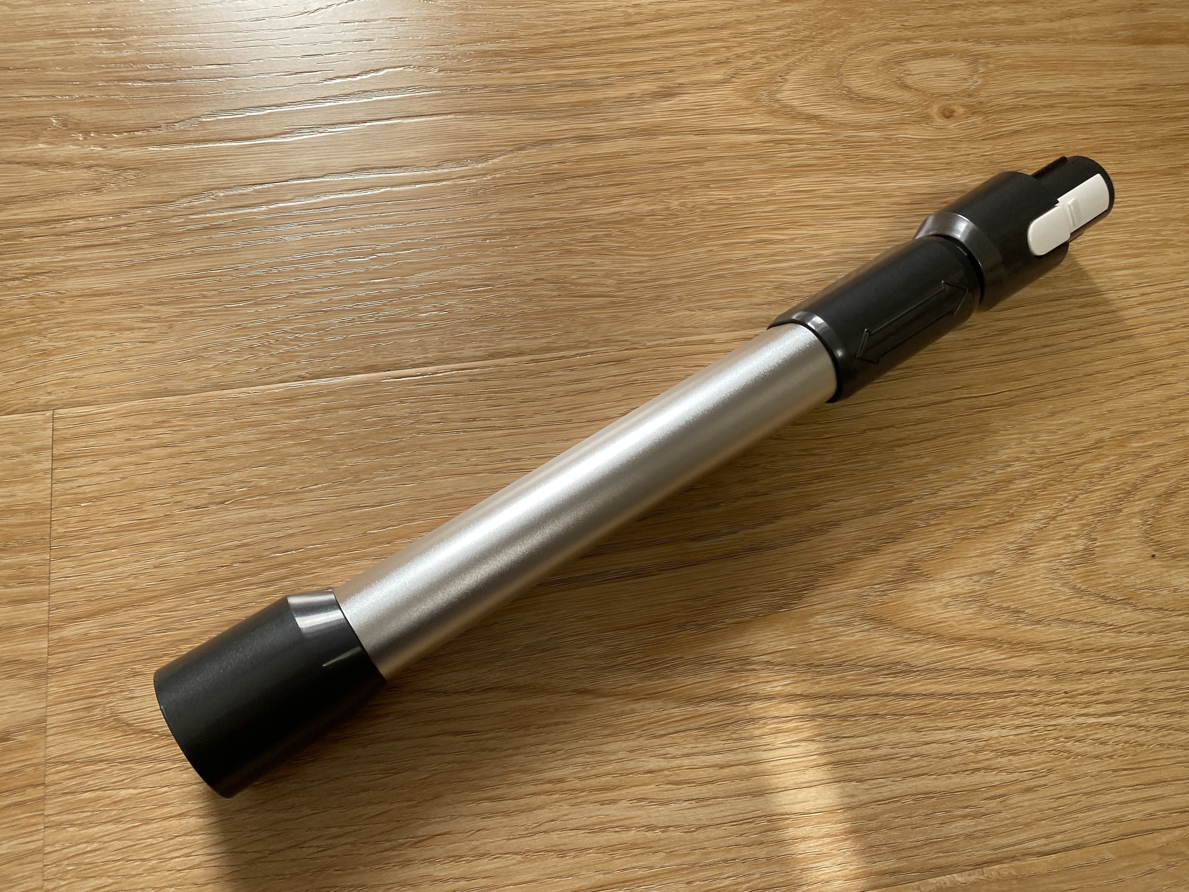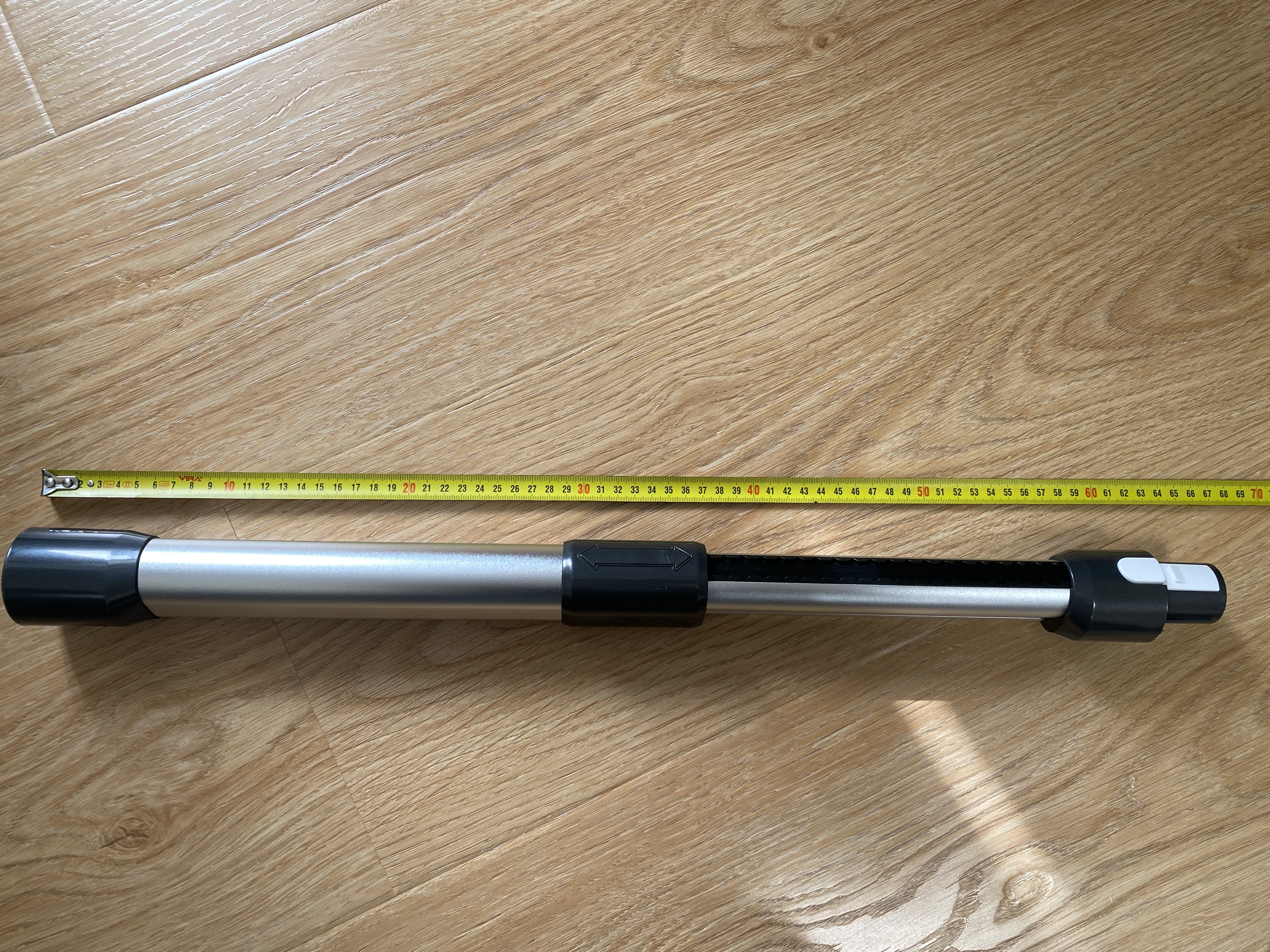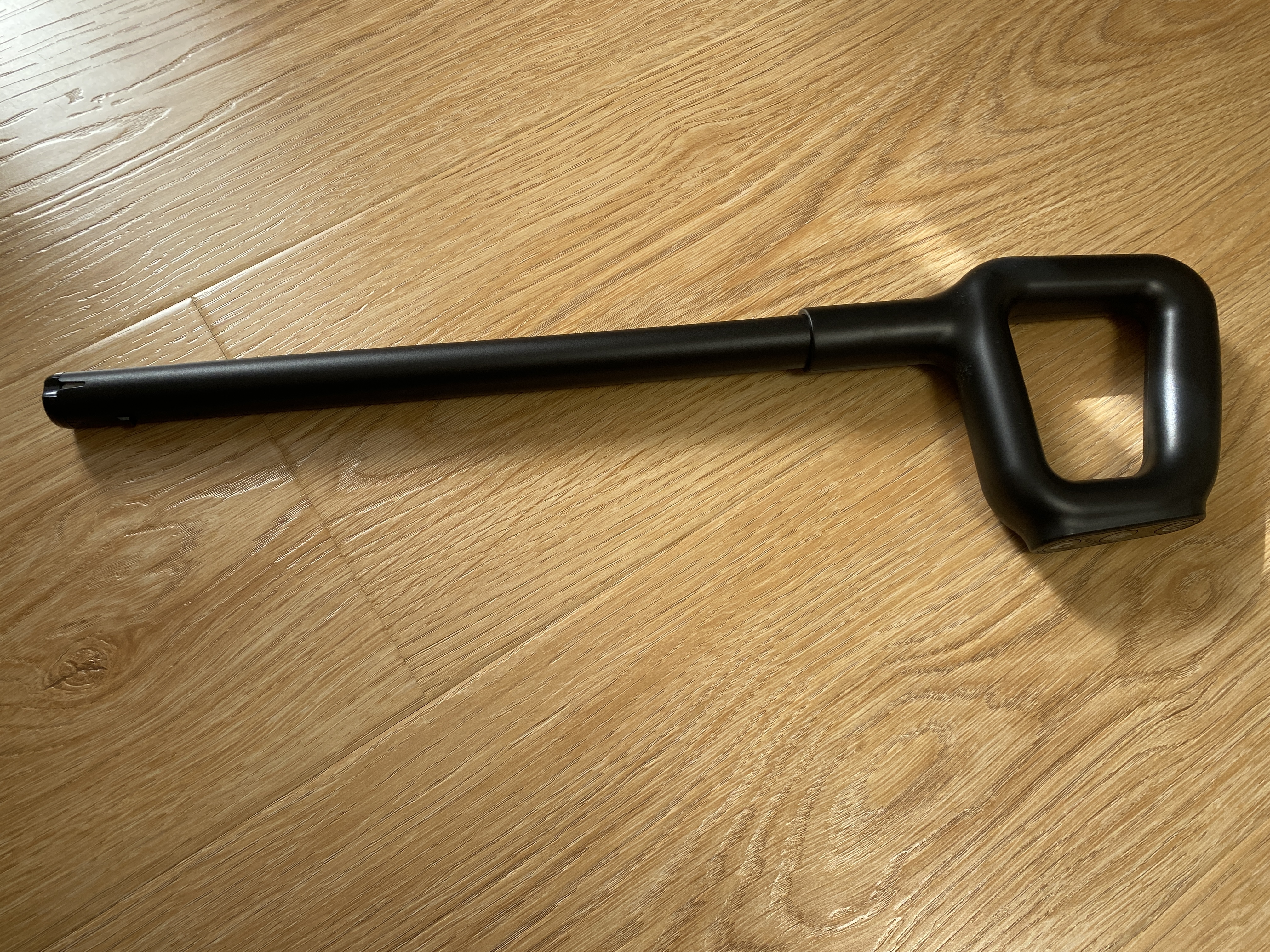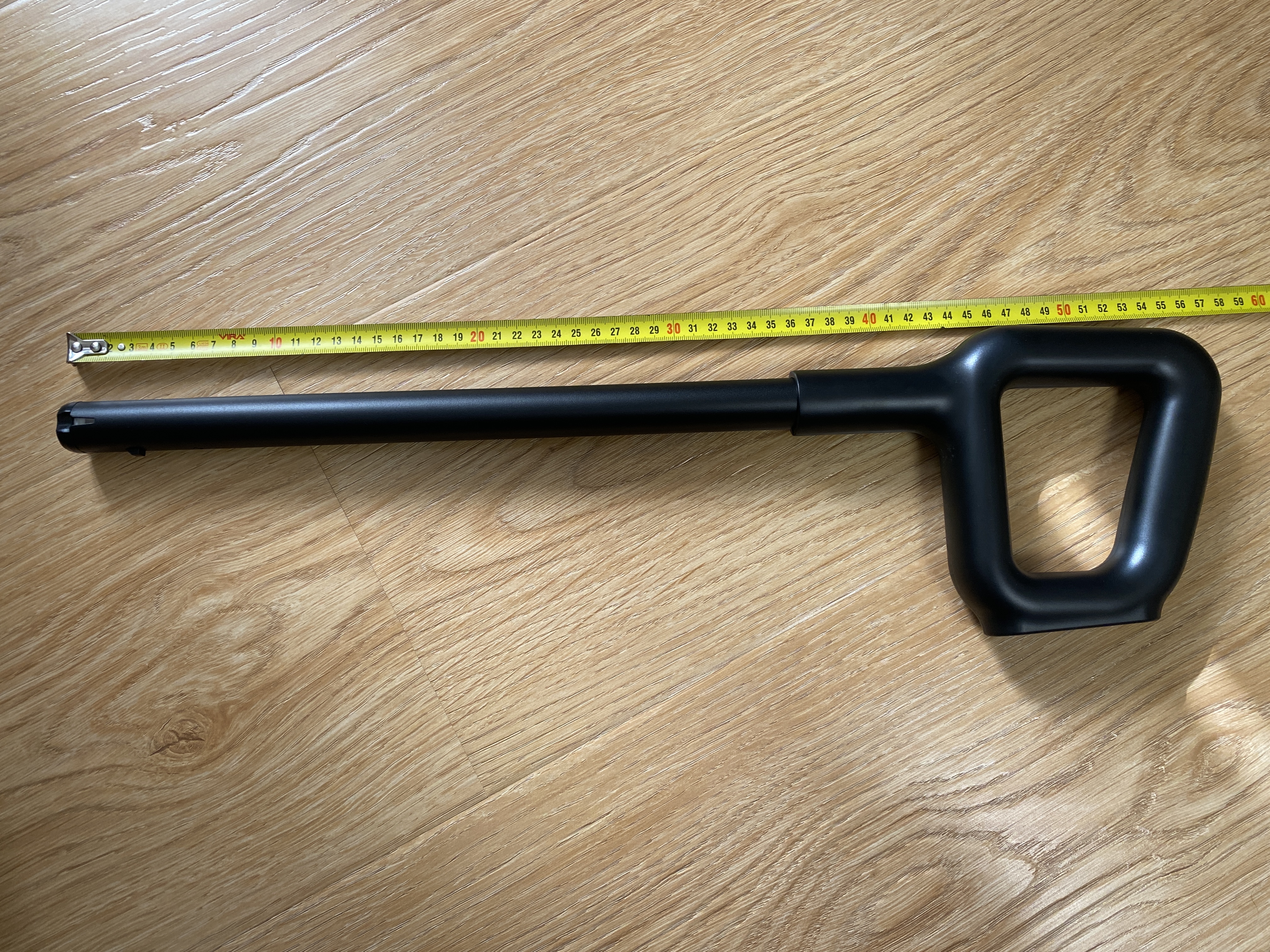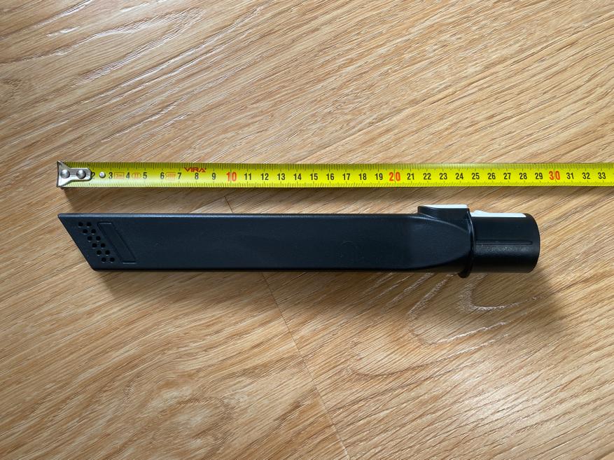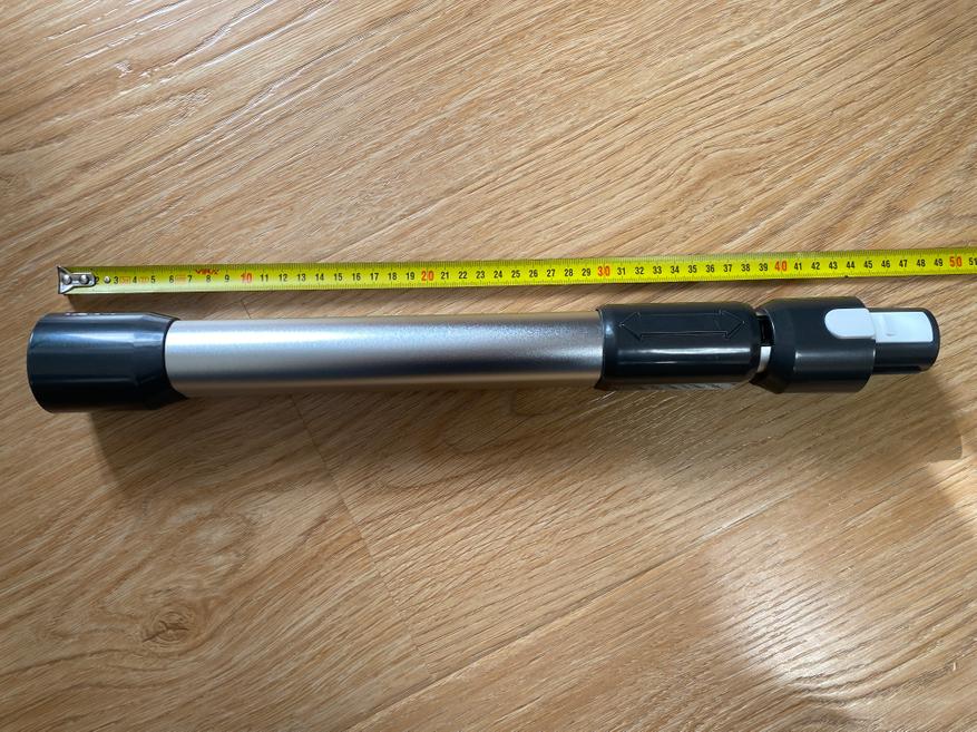Удлинительная рукоять используется с корпусом моющего пылесоса и выполнена полностью из пластика. Рукоять весьма удобная, но чего, лично мне, не хватает, так это резиновой накладки для предотвращения скольжения кисти по поверхности гладкого матового пластика. На верхней части рукояти имеются 3 механические кнопки. Первая кнопка включает и выключает пылесос, вторая используется для включения сухой уборки или включения подачи воды на электрощетку, третья кнопка активируется только после постановки пылесоса на станцию зарядки-самоочистки, после нажатия начинается подача воды на щетку и включается режим вращения на максимальной скорости. Для удобства во время использования в комплекте имеется телескопическая трубка, которая в сложенном виде имеет длину 47 см, а в разложенном 65 см.